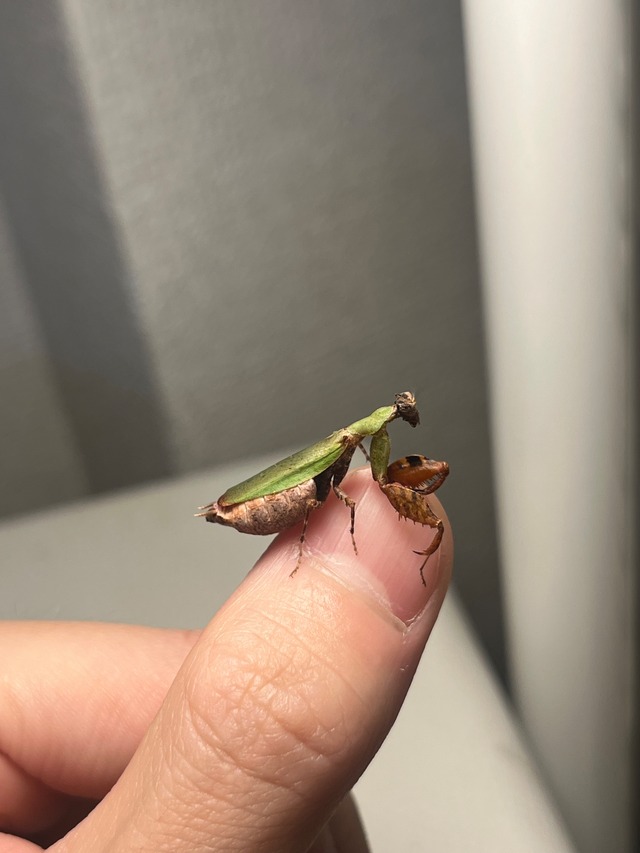 学名: Otomantis sp. 和名:アフリカボクサーマンティス/タンザニアボクサーマンティス 英名: Tanzanian boxer mantis 東南アジアに生息するボクサーカマキリの仲間等と同様、グローブを付けているかの如く、広く発達したカマが特徴的です。 本種は雌雄共々、非常に鋭く尖った目をしています。 申し訳ありませんが輸送に伴うグレードダウン及び死着保証はございませんのでご了承願います。 タンザニア産の画像個体の♀成体を配送します。11/14に羽化しています