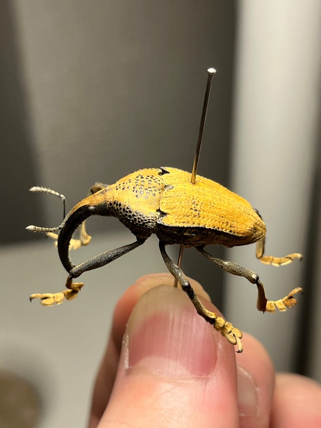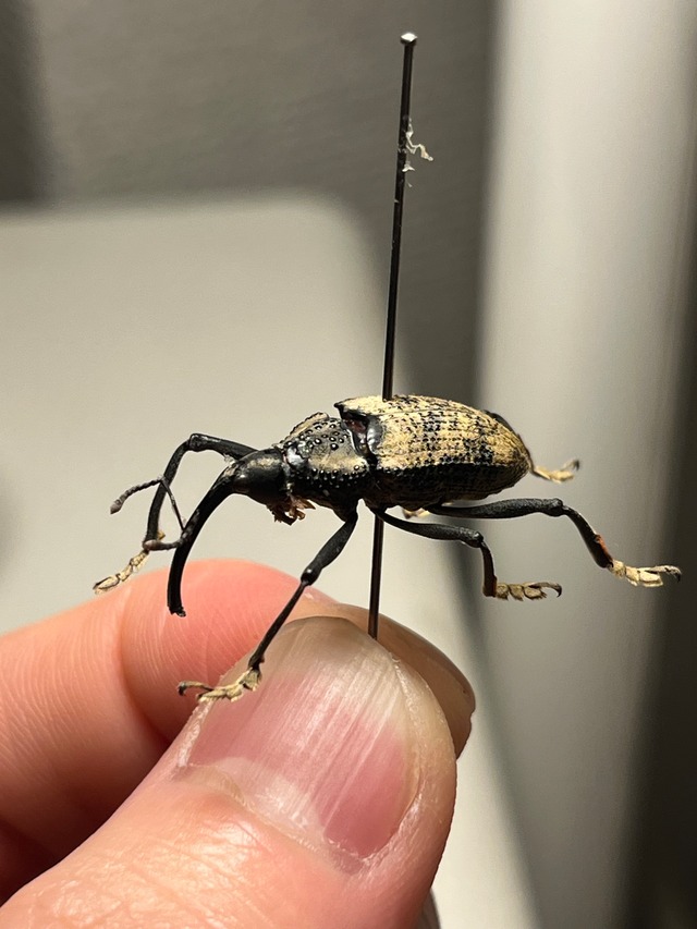 学名: Rhinastus sternicornis Rhinastus sternicornisは体長18~37ミリメートルに達します。この大型種は非常に長い脚と、大きく湾曲した長い嘴を持ちます。前胸背板と鞘翅の顆粒状模様は個体差が大きく、体色は淡褐色から濃い黄褐色、あるいは黄色まで様々です。 成虫は1月から3月にかけて見られます。竹の中で繁殖することが報告されています。雌は若い竹の芽に穴を開け、それぞれの穴に1個ずつ卵を産み付けます。幼虫は竹の節間で発育し、竹の害虫とされています。 この種は顕著な性的二形を示します。実際、かつては雄と雌は別種(それぞれRhinastus pertususとRhinastus sternicornis、現在は同種異名とされています)と考えられていました。 この種はブラジル、ペルー、アルゼンチンに分布しています。 申し訳ありませんが輸送に伴うグレードダウン保証はございませんのでご了承願います。 ブラジル産の画像個体を配送します。 私が計測したところ頭胴長で33mmでした。