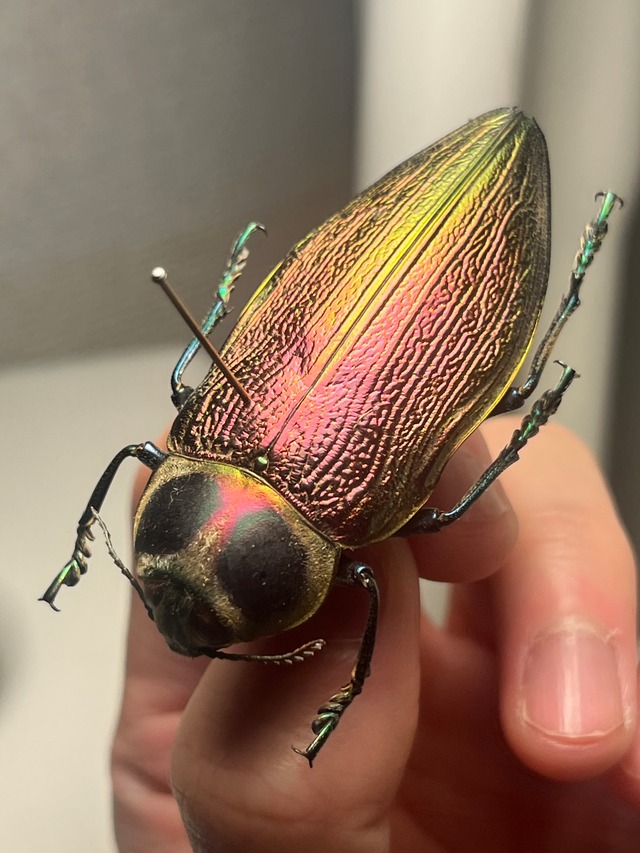 学名: Euchroma giganteum ? 英名: Metallic Wood Boring Beetle or Giant Metallic Ceiba Borer Euchroma giganteumは、タマムシ科甲虫の中で最大級の種であり(ラテン語名「giganteum」の由来)、体長は約50~80ミリメートルに達します。 CatoxanthaとMegaloxanthaは、この科で同程度の大きさに達する数少ない種です。 E. giganteumの体は頑丈で細長く、鞘翅は表面に皺があり、赤みがかった、または紫みがかった金属緑色をしています。前胸背板の両側には暗色の斑点があります。幼虫の体長は約12~15センチメートルです。羽化したばかりの成虫の鞘翅は、黄色がかったワックス状の粉で覆われています。甲虫が成長するにつれて、この粉は消失していきます。 この種は中南米(メキシコ、パナマ、エクアドル、キューバ、ジャマイカ、ペルー、ブラジル、コロンビア、アルゼンチン、ベネズエラ(グアレナス・ナランハル))原産です。アマゾンの海抜1,200メートルまでの温暖な地域に生息しています。 一属一種で亜種が複数あります。 申し訳ありませんが輸送に伴うグレードダウン保証はございませんのでご了承願います。 画像個体を配送します。私が計測したところ58mmでした。仮面ライダーみたいな見た目と色合いがかっこいいです。