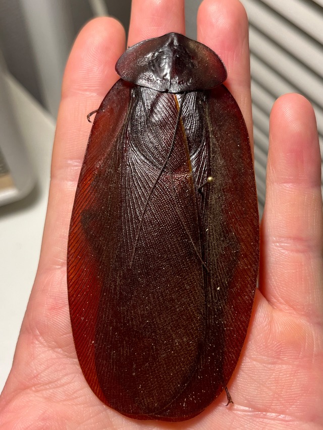 学名:Macropanesthia rhinoceros 和名:ヨロイモグラゴキブリ/鎧土竜蜚 英名:Giant burrowing cockroach 申し訳ありませんが輸送に伴うグレードダウン保証はございませんのでご了承願います。 破損しないように発送いたします。画像標本を発送いたします。