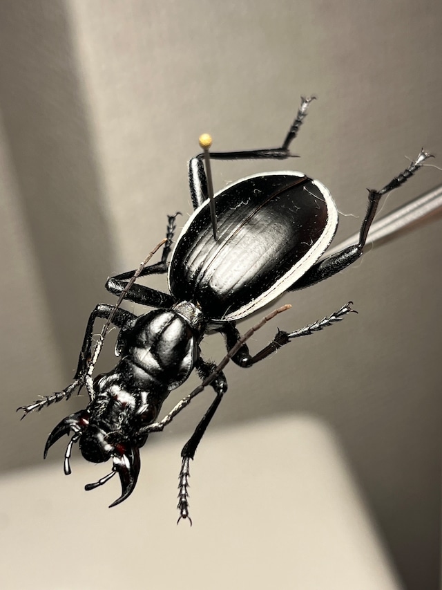 学名: Anthia cinctipennis ? サウスアフリカンプレデタービートルは、アフリカの乾燥地帯に生息する肉食性の大型オサムシです。体長2〜5cm程度、黒いボディに頑丈な顎と白いラインが特徴で、俊敏な動きで餌を狩る獰猛なハンターとして知られています。 デカい、素早い、視力がスゴイという面白い虫で、オスは前胸にウィングが搭載されるのが最強にかっこよいです。そして脚がムキムキといった印象です。 申し訳ありませんが輸送に伴うグレードダウン保証はございませんのでご了承願います。 ナミビア Mount Eronigo産の画像個体♂を配送します。2025年2月に採取されております。 私が計測したところ頭胴長で47mmでした。