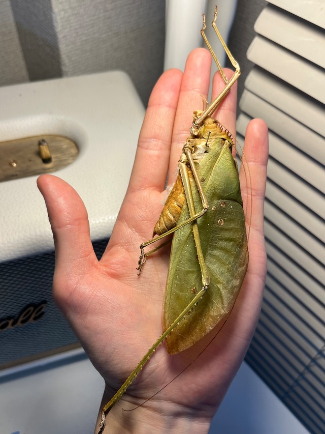 学名: Arachnacris sp.? 英名: giant Malaysian katydid, giant long-legged katydid or giant katydid Arachnacris corporalis(オオマレーシアキリギリス、オオアシキリギリス、またはオオキリギリス)(米国原産の種である Stilpnochlora couloniana と混同しないように)は、マレーシア原産の大型のキリギリスの一種である。世界最大のキリギリスである。 マレーシアオオキリギリスは、平均体長約15cmの大型の緑色の昆虫です。他のキリギリスと同様、細長い脚を持ち、後脚は前脚2対よりも長くなっています。長く葉のような翅は、通常樹上に生息しあまり動かないため、捕食者から身を隠すのに役立ちます。成長するにつれて体色は葉に似てきて、翅の先端は腐った葉のように茶色に変化します。翅の茶色の部分はキリギリスの年齢を推定する方法として利用でき、茶色が多いほど高齢であることを示します。 他のキリギリスと同様に、片方の翅の付け根付近にある歯状の発音器を反対側の翅にある発音器にこすりつけることで、大きな鳴き声を発します。この音は防御手段として、また求愛行動にも用いられます。 この種の成虫は、雌雄が容易に区別できます。雌は前胸背板が緑色、雄は前胸背板(翅の背側基部にある三角形の部分)が褐色です。 雌は産卵管を持ち、コケや腐った木に卵を産み付けます。成虫になると、最初は鮮やかな緑色をしていますが、成長するにつれて翅の先端が褐色になり、褐色の斑点が大きくなっていきます。成虫の寿命は約6ヶ月です。 主な防御手段は、葉のような体色によるカモフラージュです。匂いで追跡されないように、糞はできるだけ遠く、通常は近くの茂みや木に捨てます。また、大きな鳴き声で捕食者を威嚇することもできます。その鳴き声は体の大きさによって増幅されます。 申し訳ありませんが輸送に伴うグレードダウン保証はございませんのでご了承願います。 画像個体を配送します。