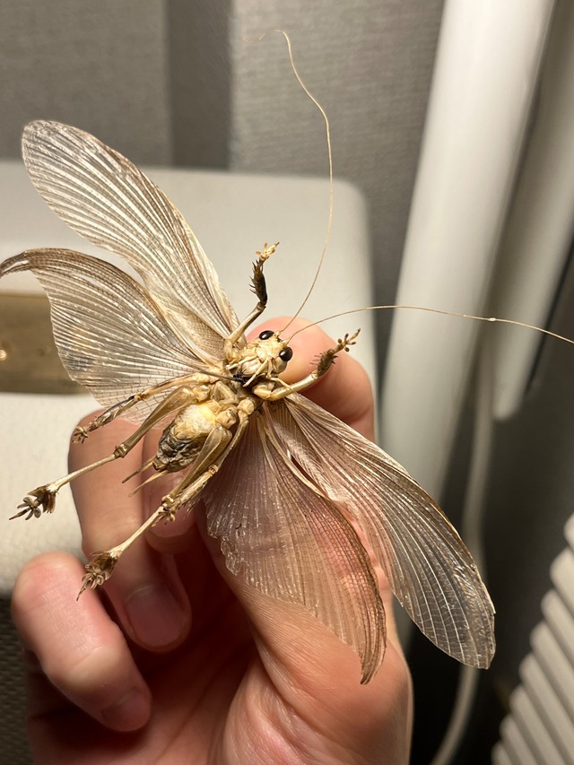 学名: Schizodactylus sp.? 主に河川沿いの砂地に生息し、大きく扁平した足根と、尾骨のすぐ上の先端がカールした翼を持っています。夜行性で、昼夜で活動が大きく変化します。日中は自分で掘った巣穴に隠れています。 S. monstrosus の好む生息地は、パキスタンのインダス川とダモダル川、インド、セイロン(現在のスリランカ)、ミャンマーなどの川の砂地の岸沿いです。S. monstrosus は、強力な下顎を使って掘削を補助し、後脛骨の距を使って掘削中に砂をどかすことが観察されています。彼らは非常に湿度の高い土壌に巣穴を作ることが知られており、望ましい水分含有量が見つかるまでさらに深く掘ります。ある研究では、巣穴の湿度は 88.5~98.5% が最も一般的な値であることがわかりました。巣穴にはオスかメスが 1 匹ずつ入ります。巣穴は、成虫、幼虫ともに完成した後は砂で塞がれることが最も多いですが、まれに開いた巣穴もいくつか見つかっていますが、その理由はまだ解明されていません。昆虫が成長して新しい齢に達すると、直径が14インチから1 + 14インチの範囲の、より広く、深く、長い巣穴を掘ります。成虫は表面から2フィート下まで潜ることがよくありますが、幼虫は砂の最上層に留まります。 自然界では、S. monstrosusは主にオサムシ、バッタ、コオロギを食べていると思われる。また、S. monstrosusは巣穴の中や近くに来た獲物を攻撃することがよくあり、容易な食事となることが観察されている。[研究室では、S. monstrosusは生の肉や魚を食べましたが、生きた甲虫により興味を示しました。 これらのコオロギはアルナーチャル・プラデーシュ州の多くの部族にとって好物の食べ物です。 中国 雲南省 保山市 施甸県産の画像個体を配送します。 パキスタン産のみに比べてとても穏やかな顔をしております。 2024年8月に採取されています。 申し訳ありませんが輸送に伴うグレードダウン保証はございませんのでご了承願います。