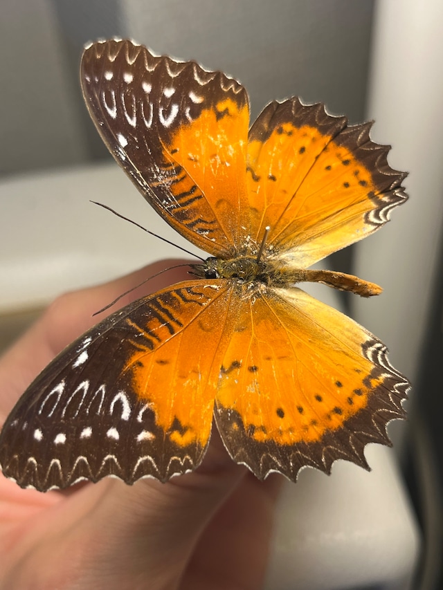 学名: Blaberus giganteus 和名:オオメンガタブラベルスゴキブリ/ブラベルスギガンテウス 英名: Central American giant cave cockroach or Brazilian cockroach 普段和名ではなく、学名で呼ばれているゴキブリです。 最も学名の認知度の高いゴキブリだと思います。 中央アメリカに生息する巨大ゴキブリ、またはブラジルゴキブリとも呼ばれるブラベルス・ギガンテウスは、ブラベル科に属するゴキブリです。世界最大級のゴキブリの一種で、新熱帯地域の温暖な地域に生息しています。 Blaberus giganteus は世界最大級のゴキブリの一種と考えられており、オスは体長が最大7.5cm、メスは10cmに達するが、最大体長を9cmとする説もある。これらのゴキブリは体が軽く平らなため、捕食者から身を隠すことができる。体は茶色で黒い模様がある。これらの昆虫の翼開長は通常約15cmである。オスとメスは両方とも最後の腹部の節に一対の付属肢(尾状突起)を持っているが、オスのみが針と呼ばれる一対の小さな毛のような付属肢を持っている。成虫は腹部の上に折り畳まれた2対の翼を持つ。重いメスは飛ぶことが少ない。 この種は新熱帯地方の固有種であり、メキシコ、グアテマラ、パナマ、コロンビア、エクアドル、ベネズエラ、コスタリカ、ブラジル、トリニダード・トバゴ、キューバ、イスパニョーラ島(ドミニカ共和国)、ガイアナ、スリナム、フランス領ギアナの洞窟や熱帯雨林で見られます。生息地の好みには、洞窟、木の洞、岩の割れ目など、湿度が高く光が少ない場所が含まれます。 Blaberus giganteusは夜行性の雑食性で腐肉食ですが、その食事の大部分は腐敗した植物質です。その他の食物としては、コウモリの糞、果物、種子、死肉などがあります。コウモリのねぐら(洞窟や糞の中)としばしば関連しています。また、毎日の食事として、甘いもの、肉、でんぷん質のものを好みます。 申し訳ありませんが輸送に伴うグレードダウン保証はございませんのでご了承願います。 画像標本を配送します。私が計測したところ開翅長146mmでした。