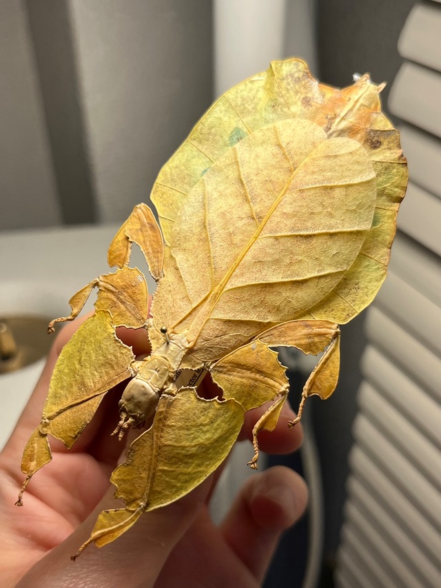 学名: 不明 昆虫の中で1番の癒しキャラだと思います。 なぜ生きているのか不思議になるほど体が薄いです。 黄色のグラデーションが美しいオオコノハムシです。 私が計測したところ腕も含めて106mmでした。 インドネシア 西ジャワ ハリマン山産の画像標本を配送します。2024年5月採取品です。 申し訳ありませんが輸送に伴うグレードダウン保証はございませんのでご了承願います。