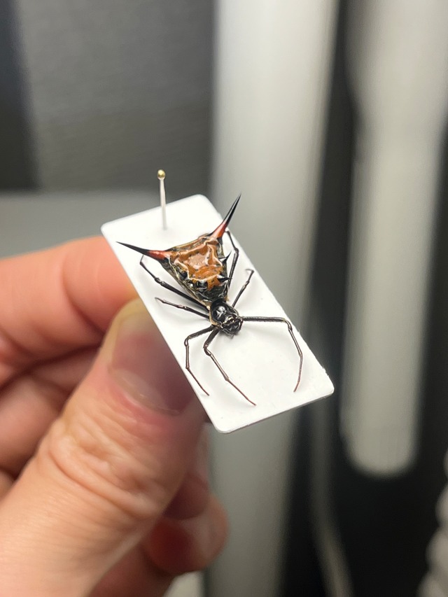 学名:不明 トゲグモの標本です。 東南アジアのものはよく入ってきますが南米のものはレアですのでおすすめです! 蜘蛛は色残し難しいですが赤みが少し残っております。 お腹の形状が少しザトウムシ感もあります。 申し訳ありませんが輸送に伴うグレードダウン保証はございませんのでご了承願います。 フレンチギアナ レジナ カウ山 標高50m地点産の画像個体を配送します。2022年11月19日に採取されております。 レッグスパン3cm程です。
