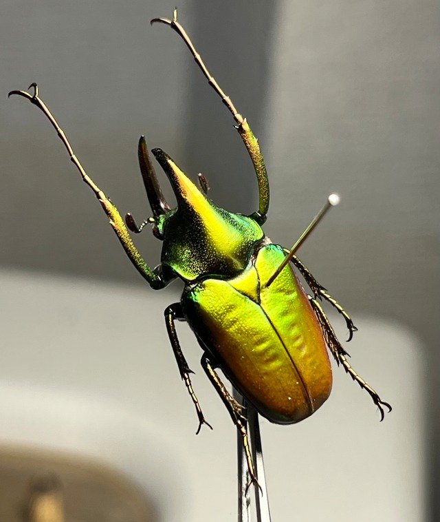 学名: Theodosia rodrigezi 和名: 兜花潜/ロドリゲスカブトハナムグリ/テオドシア この名は、パラワン島での昆虫学調査で探検隊を支援した地元ガイド、ローウェル・ロドリゲス氏にちなんで名付けられました。 体長は30~50mm。オスの成虫はカブトムシのような長大な角とカナブンのような金属光沢を併せ持つ。 いわゆるツノカナブンの仲間をはじめ、角を持つハナムグリ亜科昆虫は少なくないが、頭部だけでなく前胸背にも、しかもカブトムシにも引けをとらない程長く伸びる角を持つのは本属のみである。 胸角の中央付近に突起が見られ、先端で二股に分かれる。角と背面、脚が赤みを帯び、それ以外は金属光沢のある緑。メスには角がない。 脚が長いのも特徴である。 カリマンタン島の山岳地帯に生息する。特徴的な角を持つ彼らだが、成虫の日周活動や食性、飛翔特性等は、他の多くのハナムグリ亜科のそれと大差がない。昼行性であり、非常に良く飛翔する。生息地の山地では、上昇気流、いわゆる“吹き上げ”に乗って他の様々な昆虫と共に山肌を飛び昇ってくる姿が見られる。 高木の細い枝先に咲く花に訪花し、蜜を吸汁する。長い脚は細い枝先を歩くのに都合がよい。 幼虫は腐朽の進んだ朽木にみられるが未知の点が多い。飼育(現在日本国内では禁じられている)も難しく、とりわけ産卵の不活発、孵化しない不健全卵の多さから、安定した累代繁殖に成功した例は報告されていない。 ネプチューンオオカブトをミニチュア化して、緑と茶色に染め上げた感じがかっこかわいいのでおすすめです! 申し訳ありませんが輸送に伴うグレードダウン保証はございませんのでご了承願います。 フィリピン パラワン島 ブルックスポイント産の画像個体を配送します。私が計測したところ30mmでした。