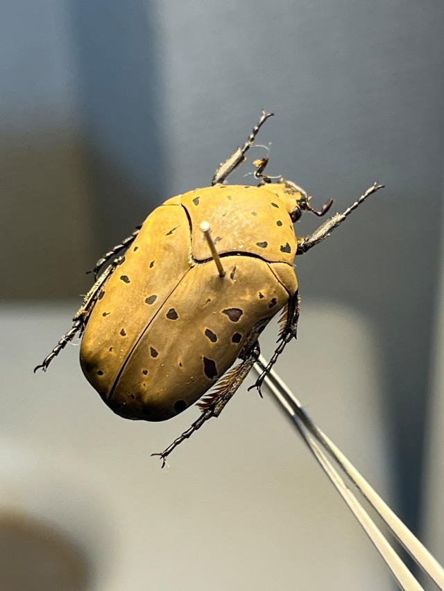 学名: Gymnetis pantherina 和名:ヒョウモンアヤヒシムネハナムグリ/豹紋綾 珍奇昆虫BRUTUSの26ページ目に記載されている種類です。以下のように紹介されております。 ベルベット状の体に、美しい模様をまとう美種たち。 フードのように菱形状に垂れ下がった胸部が和名の由来のハナムグリ。小楯板が隠れてしまうほどのボリューム感ある胸部と短い手足により、独特のずんぐりとしたフォルムとなっている。体はベルベット状の毛に覆われ、多彩な模様が入り、コレクター心をそそられる。 緻密な模様は、種ごとに異なるのはもちろん、同種間にも個体ごとにも変異があり、集めだすと、このグループだけで標本箱がいっぱいになってしまう。 申し訳ありませんが輸送に伴うグレードダウン保証はございませんのでご了承願います。 ボリビア カラナビ産の画像標本を配送します。2002年12月15-21日に採取されております。