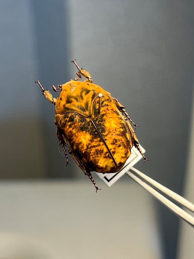 学名: Gymnetis cupriventris kerremansi 和名:タイヨウアヤヒシムネハナムグリ/太陽綾 珍奇昆虫BRUTUSの26ページ目に記載されている種類です。以下のように紹介されております。 ベルベット状の体に、美しい模様をまとう美種たち。 フードのように菱形状に垂れ下がった胸部が和名の由来のハナムグリ。小楯板が隠れてしまうほどのボリューム感ある胸部と短い手足により、独特のずんぐりとしたフォルムとなっている。体はベルベット状の毛に覆われ、多彩な模様が入り、コレクター心をそそられる。 緻密な模様は、種ごとに異なるのはもちろん、同種間にも個体ごとにも変異があり、集めだすと、このグループだけで標本箱がいっぱいになってしまう。 マグマみたいな模様が美しくて、属内でも最美麗種だと思います。 申し訳ありませんが輸送に伴うグレードダウン保証はございませんのでご了承願います。 私が計測したところ頭胴長22mmでした。 ペルー フニン サティポ産の画像標本を配送します。2002年11月に採取されております。