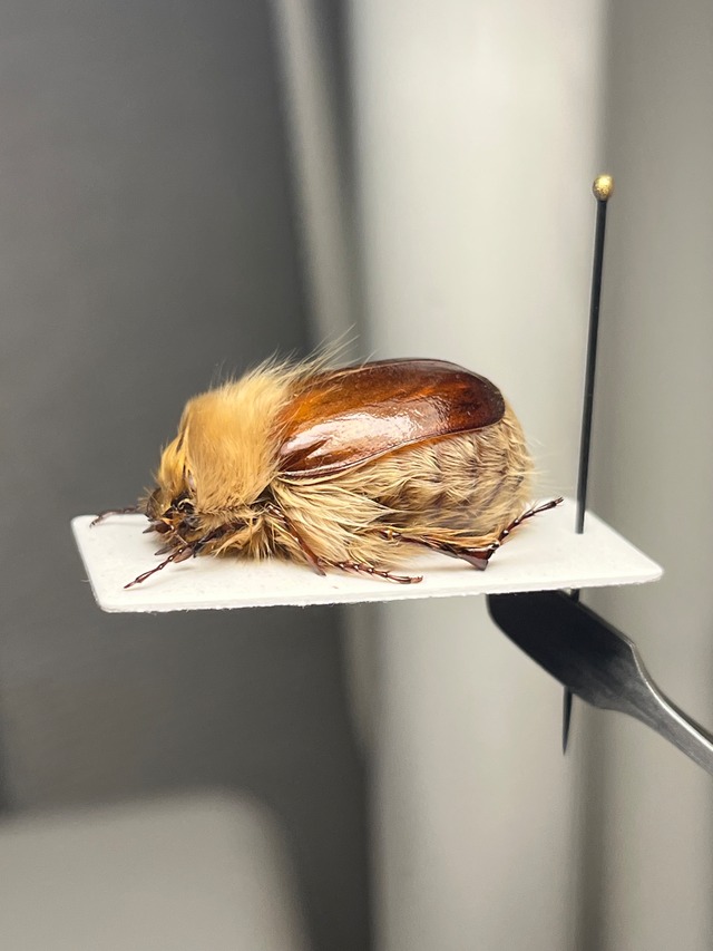 学名: Pygopleurus vulpes ピゴプレウルス・ブルペス(Pygopleurus vulpes)は体長12~14ミリメートルに達します。[オスは全身が長い毛で覆われています。体表や剛毛に変異は見られませんが、体色は一般的な麦わら色から赤みがかった色、濃いオレンジ色まで様々です。メスは前胸背板が緑色で、褐色の鞘翅が露出しています。 分布 この種はアルバニア、ブルガリア、ギリシャ、北マケドニア、ルーマニア、ロシア、ウクライナに生息しています。 申し訳ありませんが輸送に伴うグレードダウン保証はございませんのでご了承願います。 ウクライナ ドネツィク州 Shakhtars'k Шахтарськ産の画像個体を配送します。2020年4月28日に採取されております。 私が計測したところ頭胴長で10mmでした。