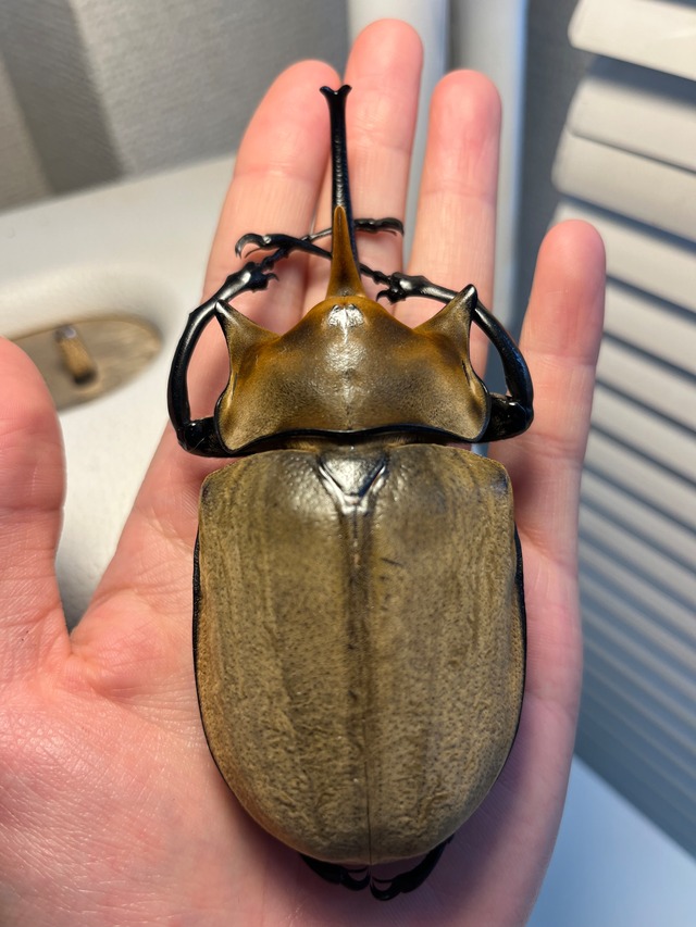 学名: Megasoma elephas 和名:エレファスゾウカブト 英名: Elephant Beetle 中名: 大象象兜蟲 ゾウカブト属の代表種であり、単にゾウカブトと呼ぶ場合、この種を指すことが多い。世界一体重が重いカブトムシとして有名。エレファスは象を意味する。 体長は♂70mm - 144mm、♀50mm - 80mm。 飼育下では130mmを越えた個体も報告されている。世界で最も体重が重いカブトムシとして知られ、約50gにも達する(ちなみにヘラクレスオオカブトは約40g)。また、本種はメスも大きく、体長80mmを超えるものもある。 体の割に角は小さい。金色のビロード状の体毛が全身に生えており黄土色をしているが、この毛は時間と共に擦れて抜け落ちる。角が短いため体長ではヘラクレスオオカブトに劣るものの、体重と体全体の大きさでは本種の方が勝る。 脚がとても長く、木にしがみつく力も非常に強い。細い枝にも器用に掴まって移動でき、太い幹ではその力でしっかりとしがみつき、掴まったら離れないほどになる。その力は全てのカブトムシので一番とも言われる。そのため、人の手に乗せるのは皮膚が破れて出血を伴う怪我をすることがあり、大変危険である。 申し訳ありませんが輸送に伴うグレードダウン保証はございませんのでご了承願います。 メキシコ キンタナロー州 コバ産の画像個体をお送りします。2017年11月に採集されています。 私が計測したところ123mmでした。 左右対称な極美個体ですのでおすすめです!