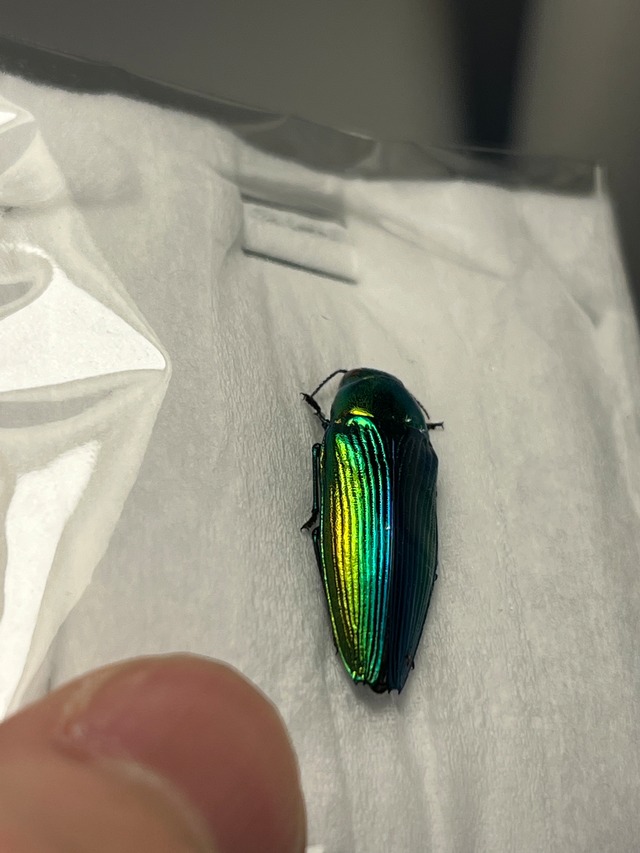 学名:Euryrhyrea sp. 国内では幻のタマムシとして有名なエゾアオタマムシです。 ロシア産の方が日本のアオタマムシと比べて特にエリトラの縁の赤さが顕著だと感じるという話もありますが体感変わりはないです。 近年のロシア情勢から2021年以降は入ってきていないのと日本のものもかなり見つかりにくいみたいです。 申し訳ありませんが輸送に伴うグレードダウン保証はございませんのでご了承願います。 日本 東京都 八王子市 高尾町高尾山産の画像標本を発送いたします。2024年7月16日に採取されております。私が計測したところ22mmでした。 採取者の方よりご指摘をいただきまして、 本種はコモンネーム アオタマムシのようです。 上翅の先端の尖った部分が1本がエゾで2本 が国産アオタマです。そこが一番わかりやすいポイントです。大きさも22ミリはエゾアオでは確かに大型の 部類に入りますが国産アオでは普通サイズで、大きな個体は25ミリを超えてきます。