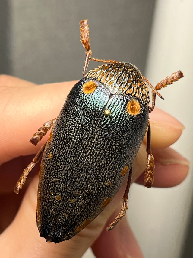 学名:Sternocera orisa orisa 和名:タテオビフトタマムシ 英名:giant jewel beetle 6亜種いるみたいです。 Sternocera orissa は体長約35~45ミリメートルに達します。鞘翅の基本色は緑がかった黒または青がかった黒で、白っぽい色から黄色がかった眼点と模様があります。 この種はボツワナ、マラウイ南部、ナミビア、南アフリカ、ザンビア、モザンビーク、ジンバブエ、タンザニアで見られます。 珍奇昆虫BRUTUSの67ページにフトタマムシ特集として掲載されております。 フトタマムシは東南アジアからアフリカにかけて分布する、木の実のような肉厚な体が特徴的です。非常に乾燥した地域にいるので水分を蓄えるために体が肉厚になるという、多肉植物と同じような進化をしています。 体表から粉状の分泌物を出しており、それが毛に付着することで模様となって表現されます。 申し訳ありませんが輸送に伴うグレードダウン保証はございませんのでご了承願います。ナミビア ハルダプ州 マルタヘーエ標高1350m地点産の画像個体をお送りします。私が計測したところ34mmでした。
