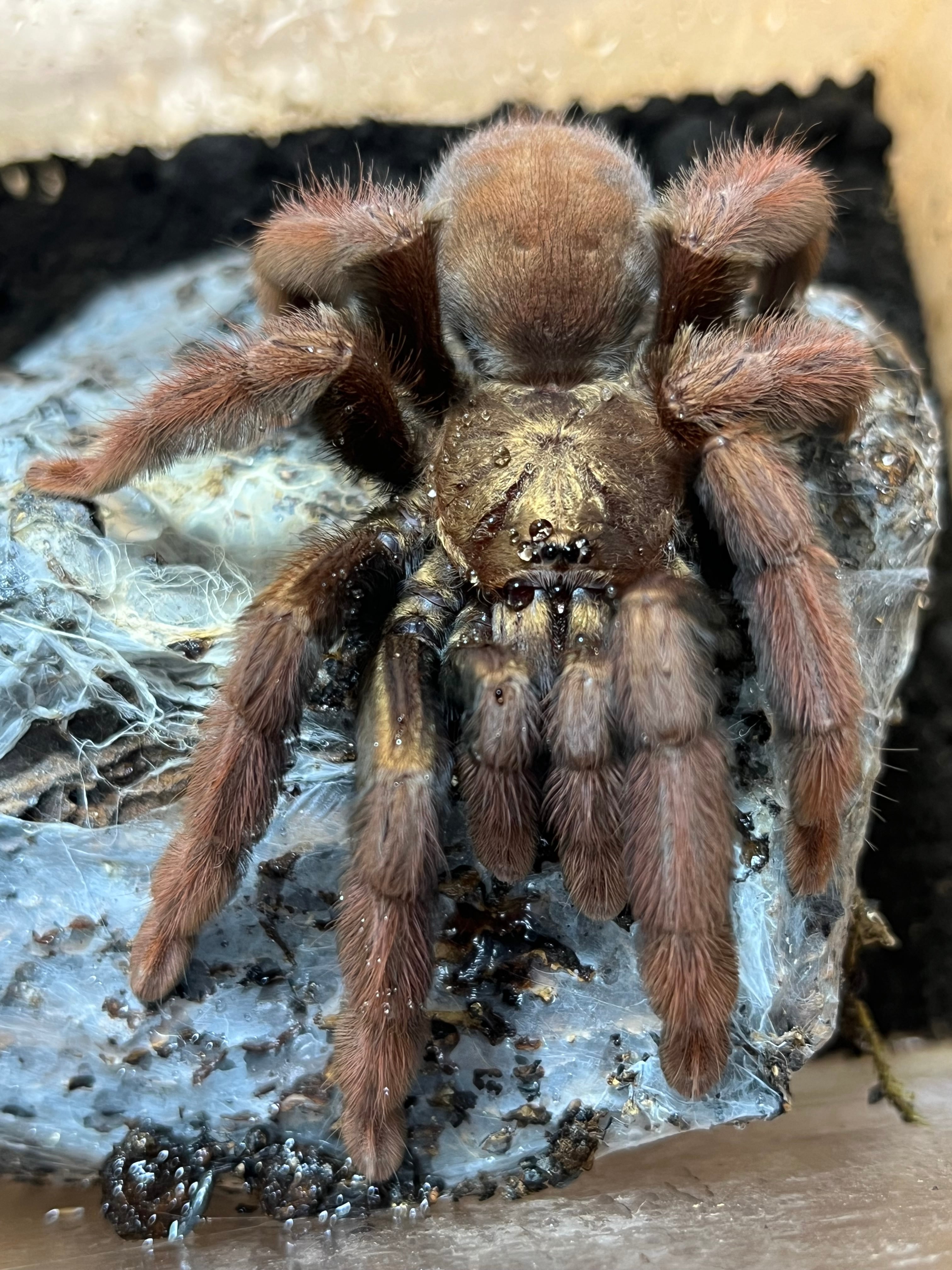 同属のコスタリカンオレンジマウス(reduncus)とパナマニアンブロンド(pulcher)を混ぜこぜにしたようなタランチュラです。
