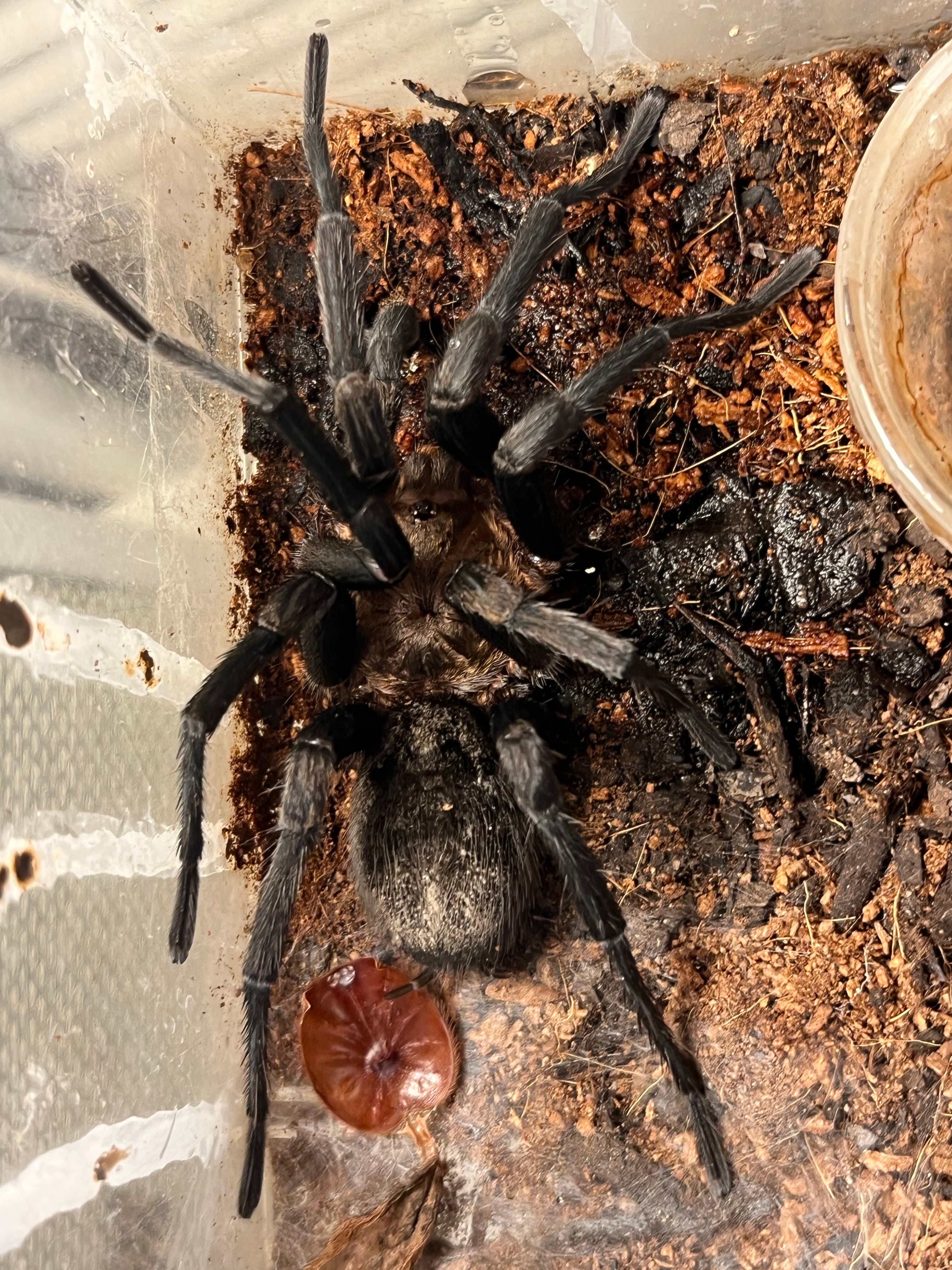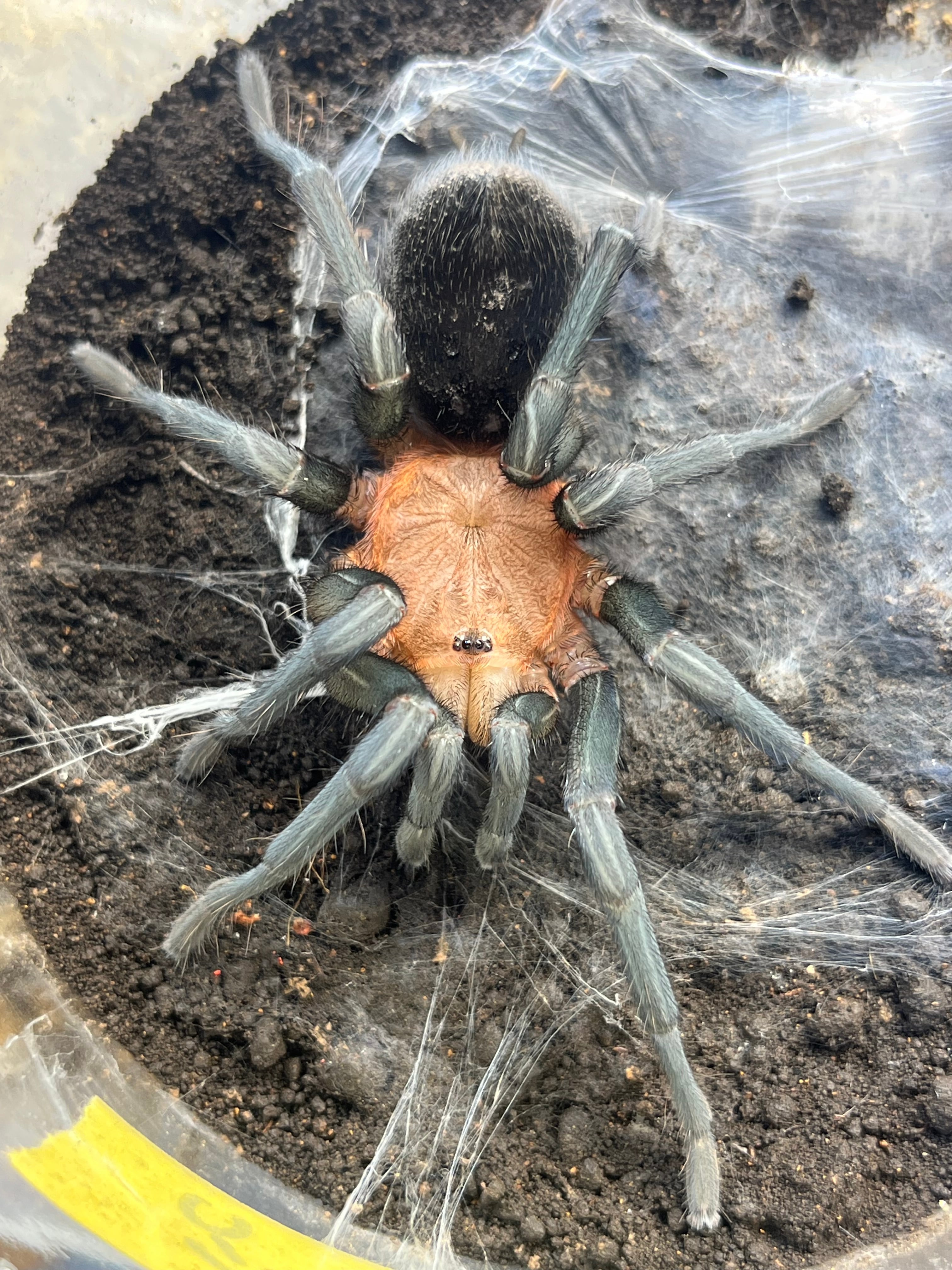 背甲がラヴァスパイダーのような蛍光オレンジでお腹はグラモストラのような金属光沢感を持つバードイーターです。種小名の 'horrida' は、ラテン語で“トゲだらけの、剛毛の”という意味があります。