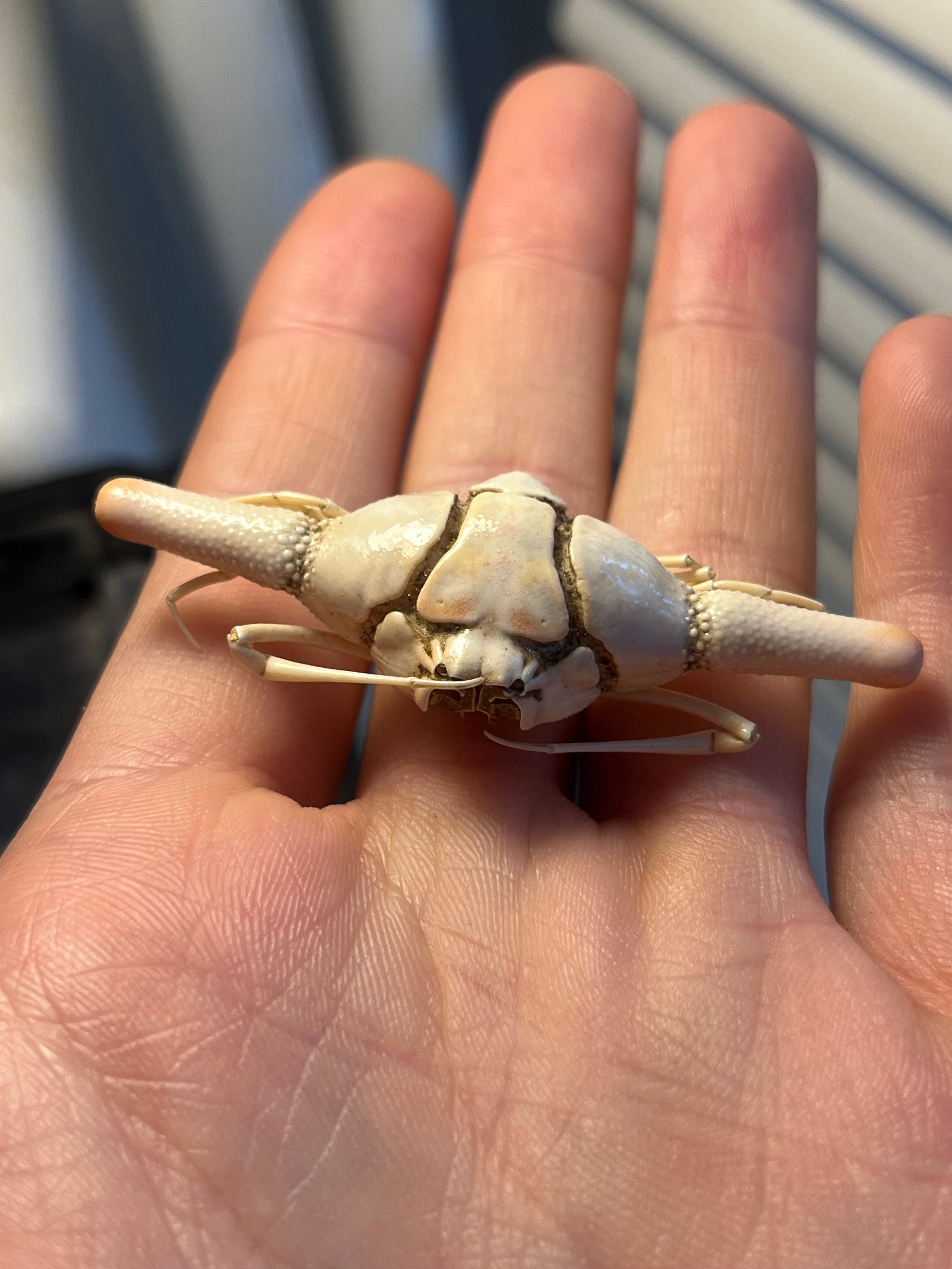 ヘッドホンをつけたような見た目が可愛らしいカニです。何かのキャラクターに似ています。