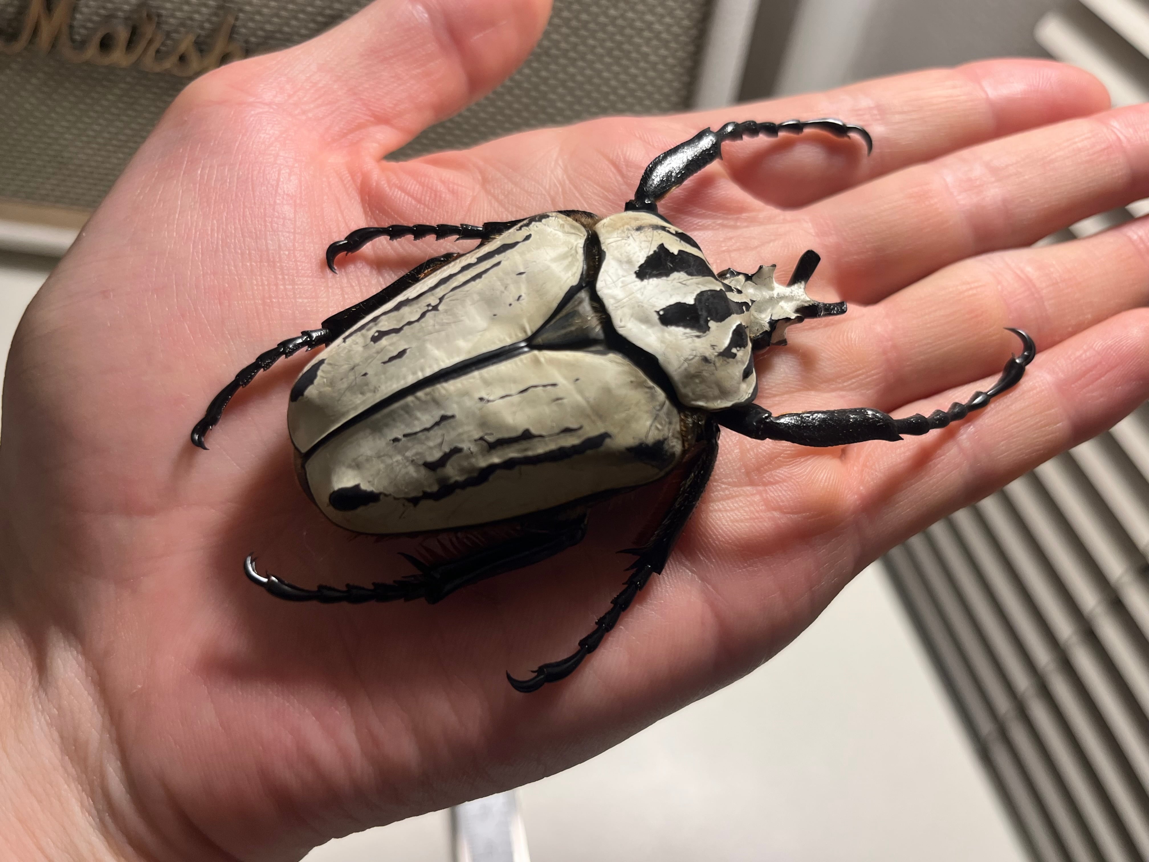 後翅は縦の褐色の筋が入るのでフレーシーゴライアスオオツノハナムグリになります。シラフゴライアス(Goliathus orientalis)から独立しました。
