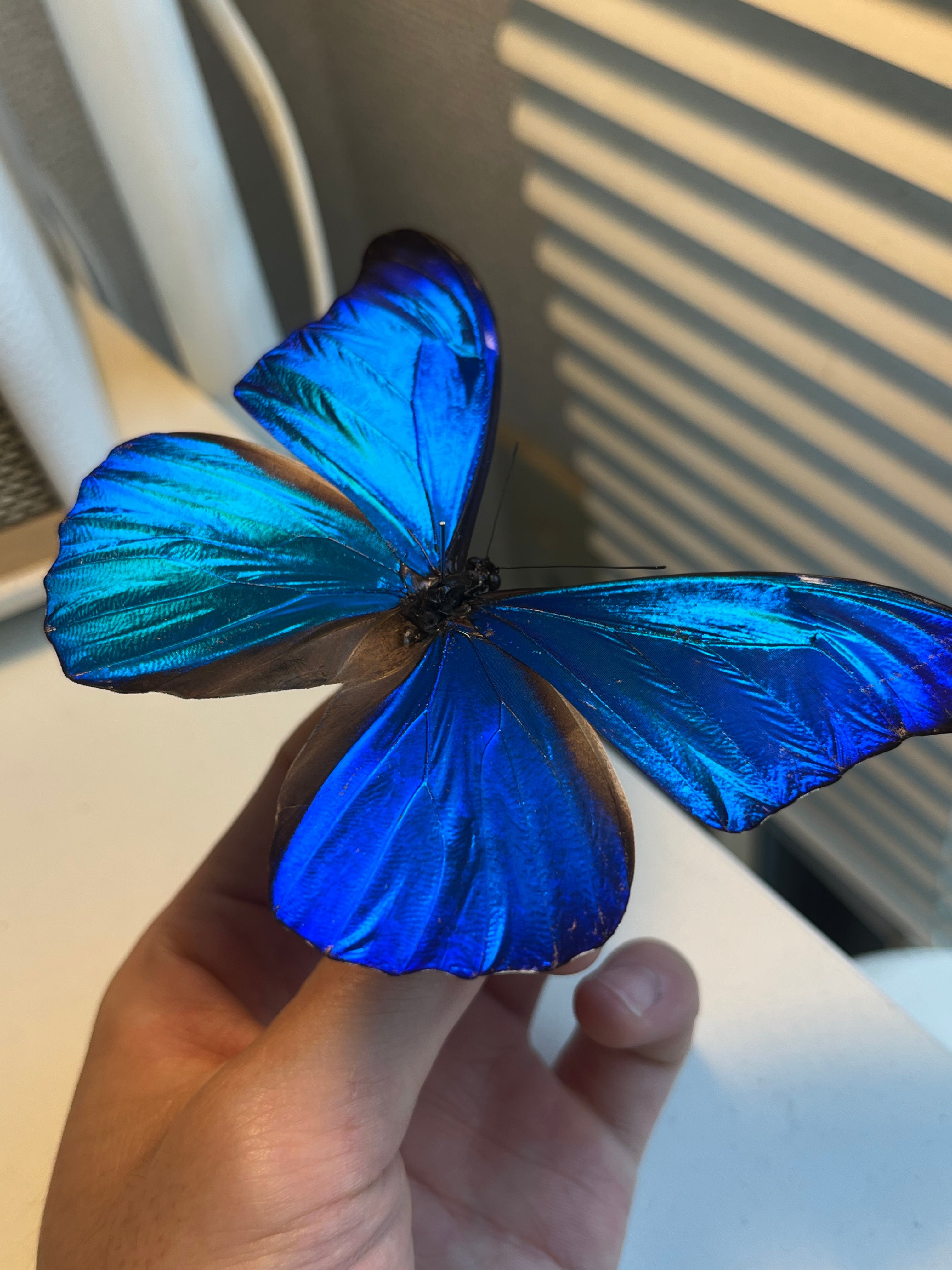 モルフォチョウの中でもっとも輝きの強い羽をもちます。羽全体がサファイアのような色合いで、極めて美しいです。