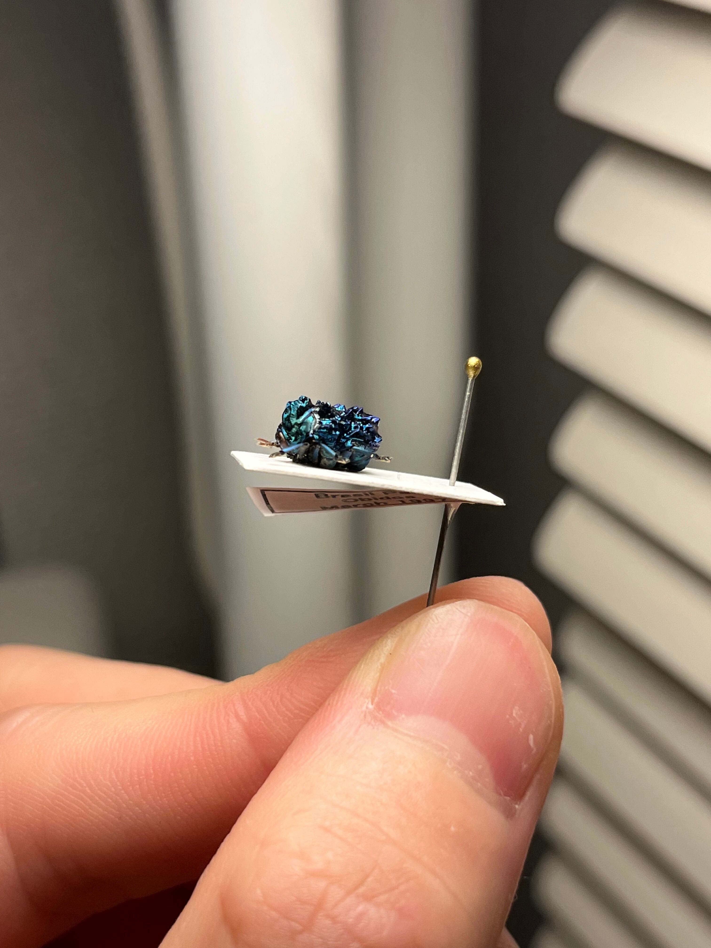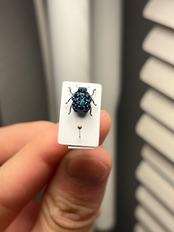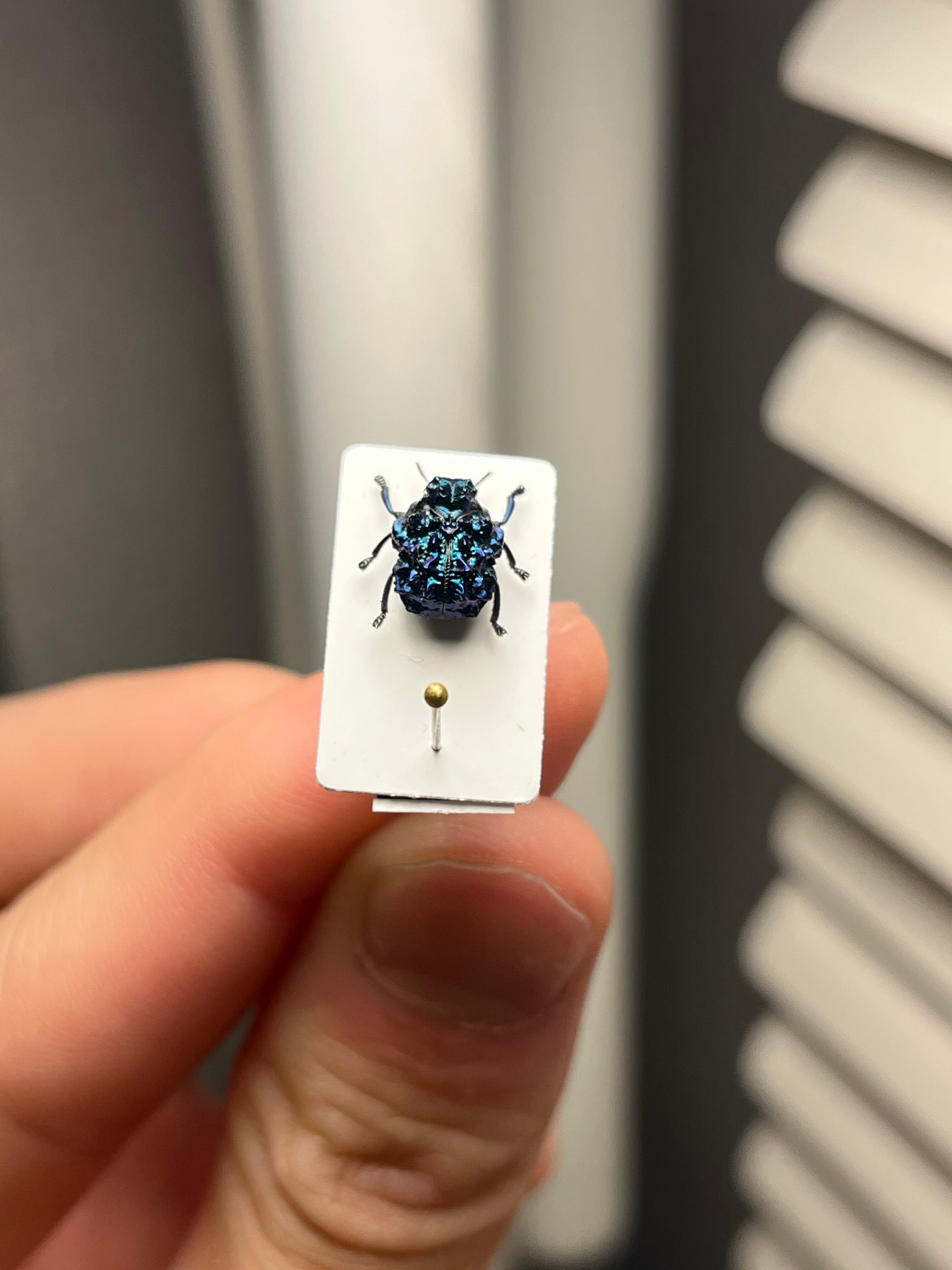BRUTUSで1ページを丸々使って紹介されたグンジョウオオコブハムシの仲間。全体的に紺色がベースですが、角度によって鮮やかな水色から深みのある紫色へとグラデーションがかかります。大きさは約9mmあります。