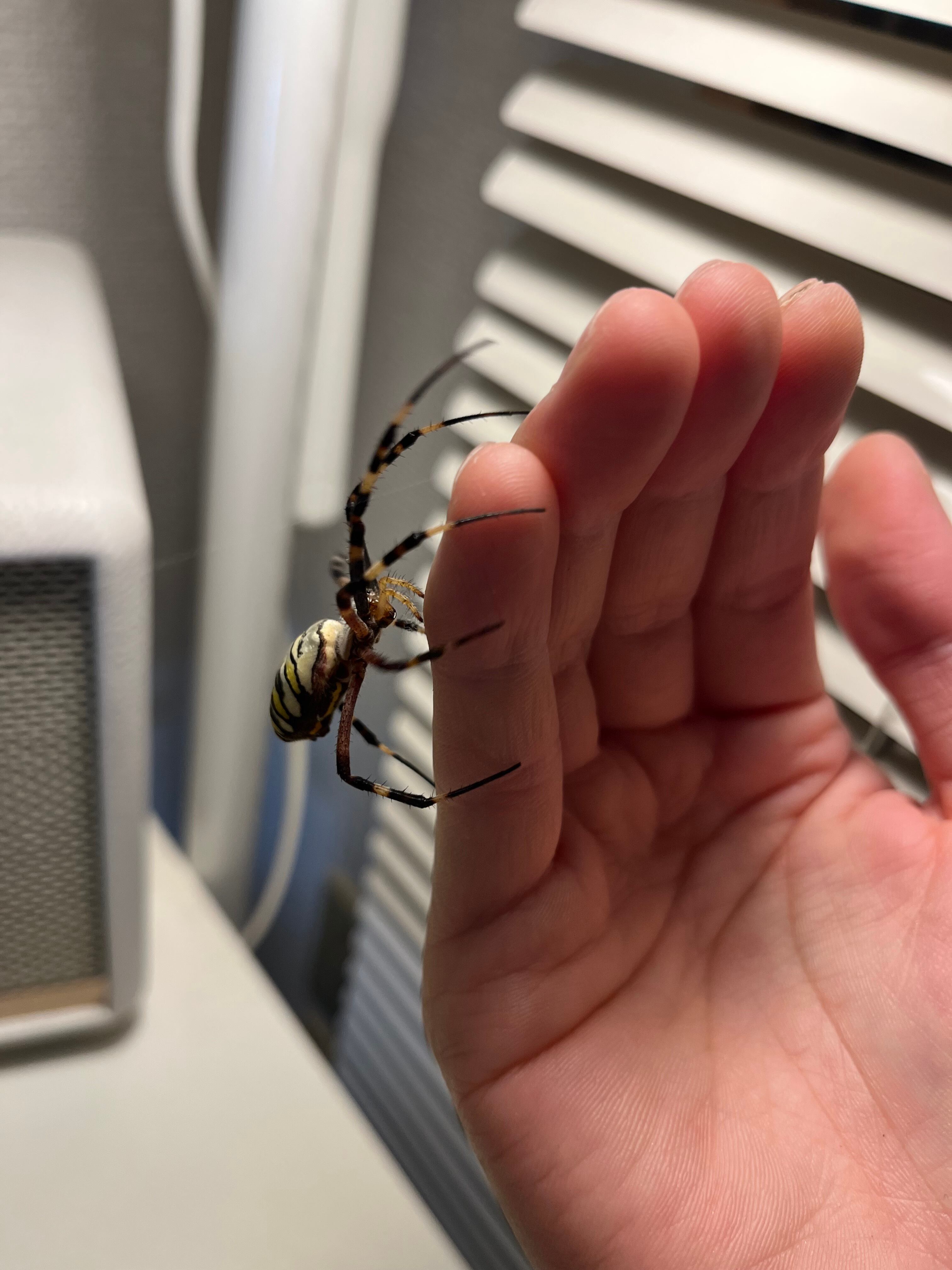 腹部に黄色と黒のこまかい縞模様がある大きなクモ。