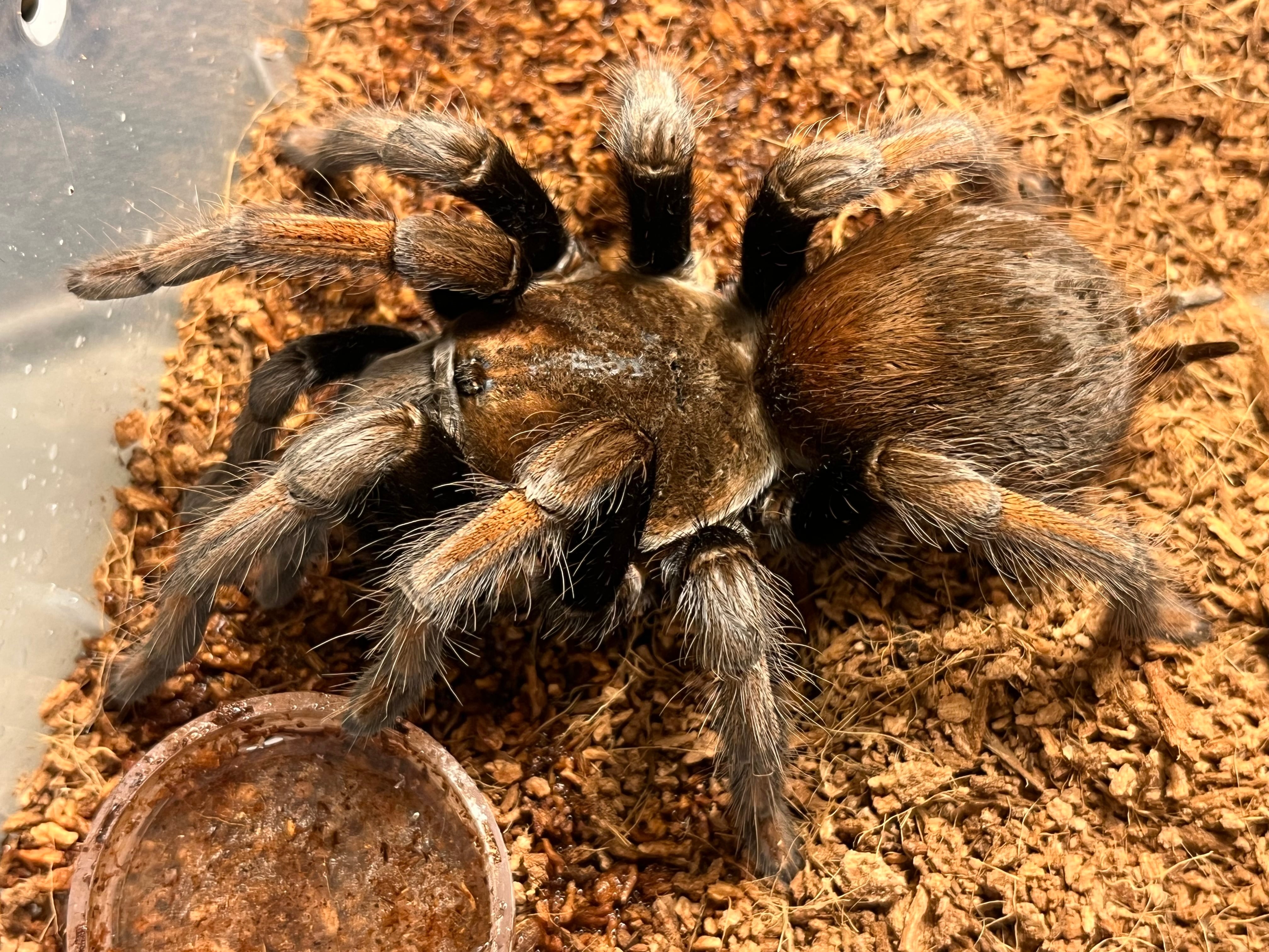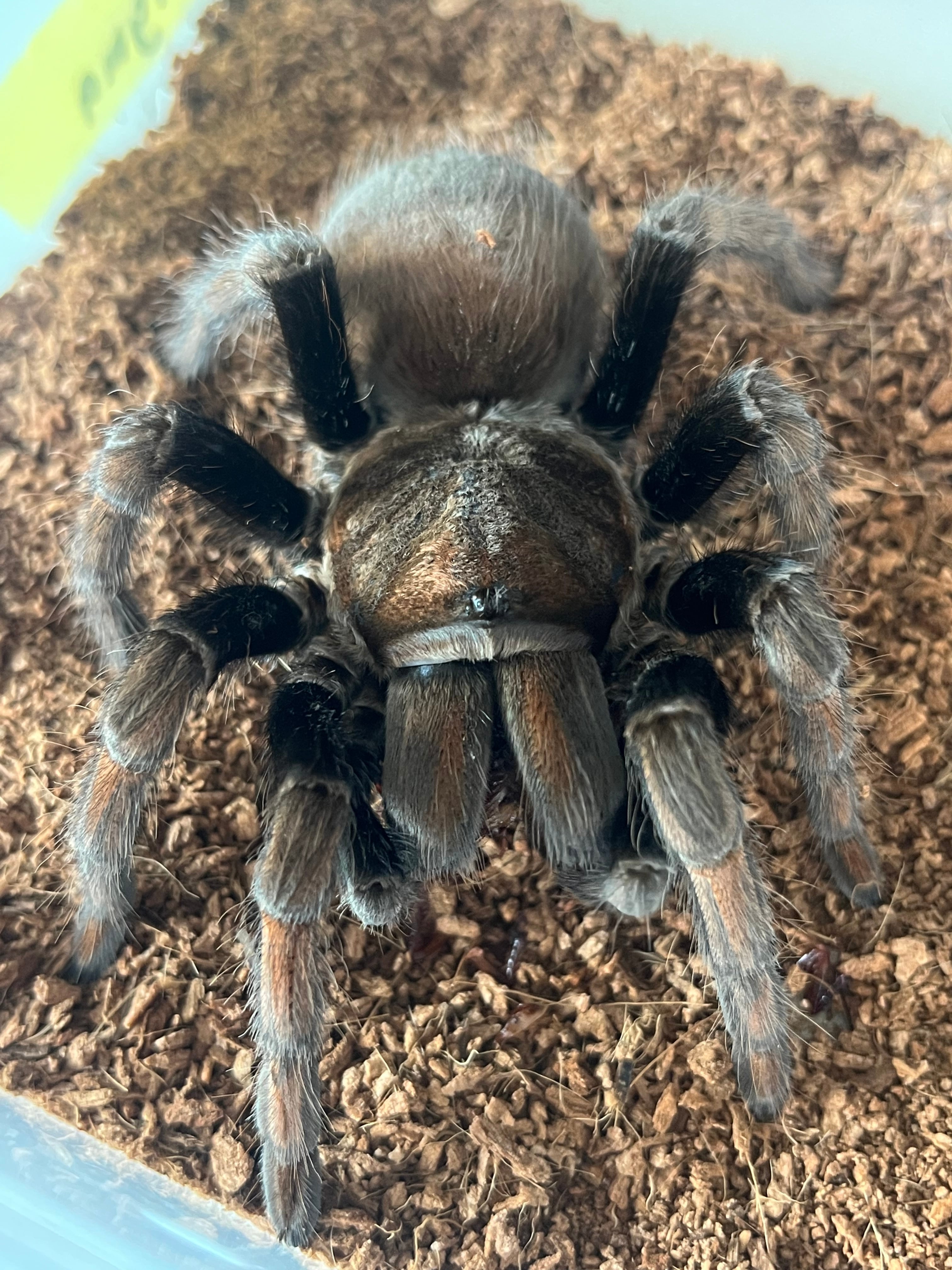 ゴールデンブルーレッグバブーンの脚のように脱皮直後は黒い体色ですが、時間が経つにつれオレンジに色付いてきます。LS18cmまでいくみたいで割と大きくなりますのでおすすめです!2022年に初めて販売されたのでタランチュラの最先端種でもあります。
