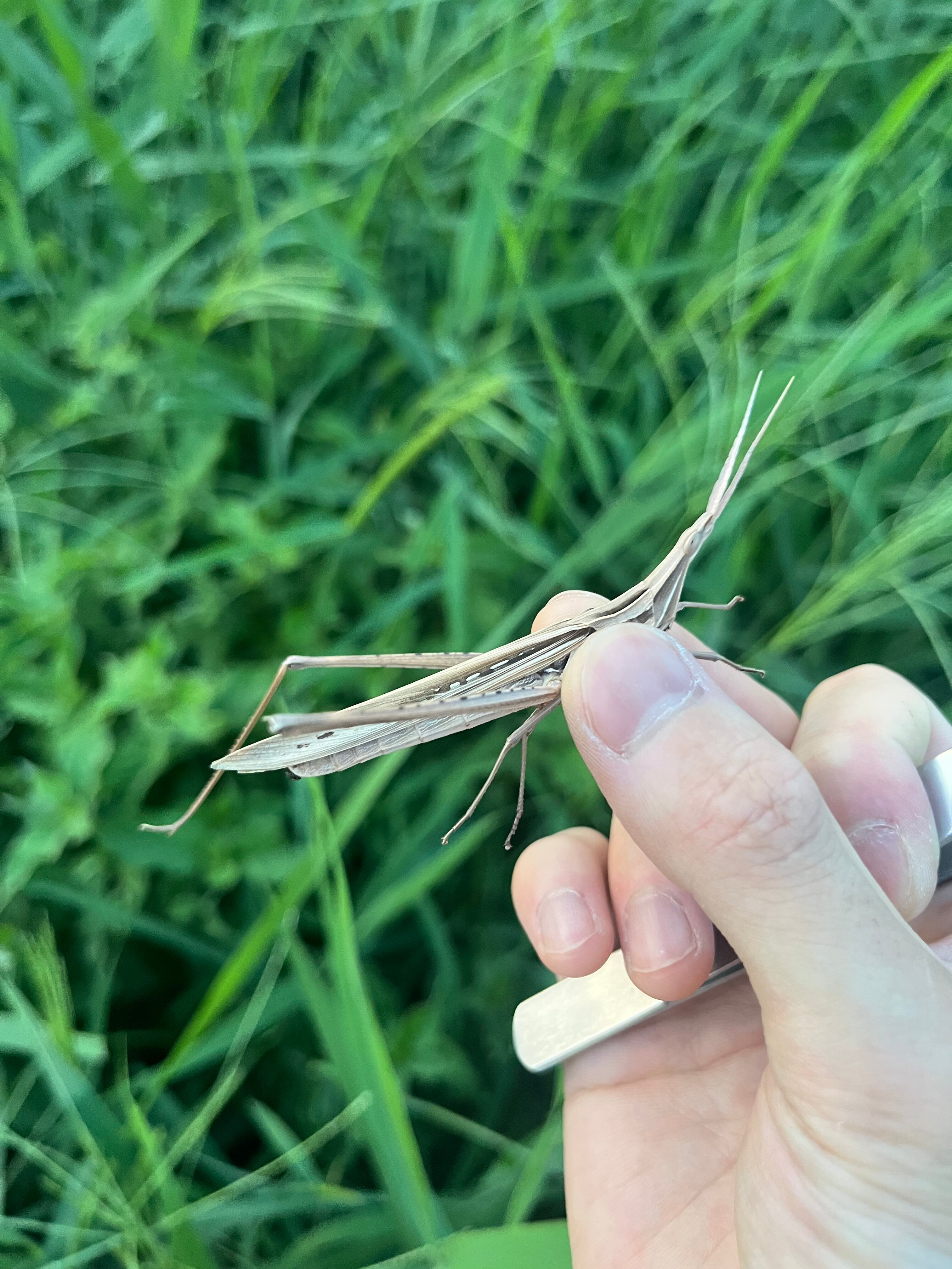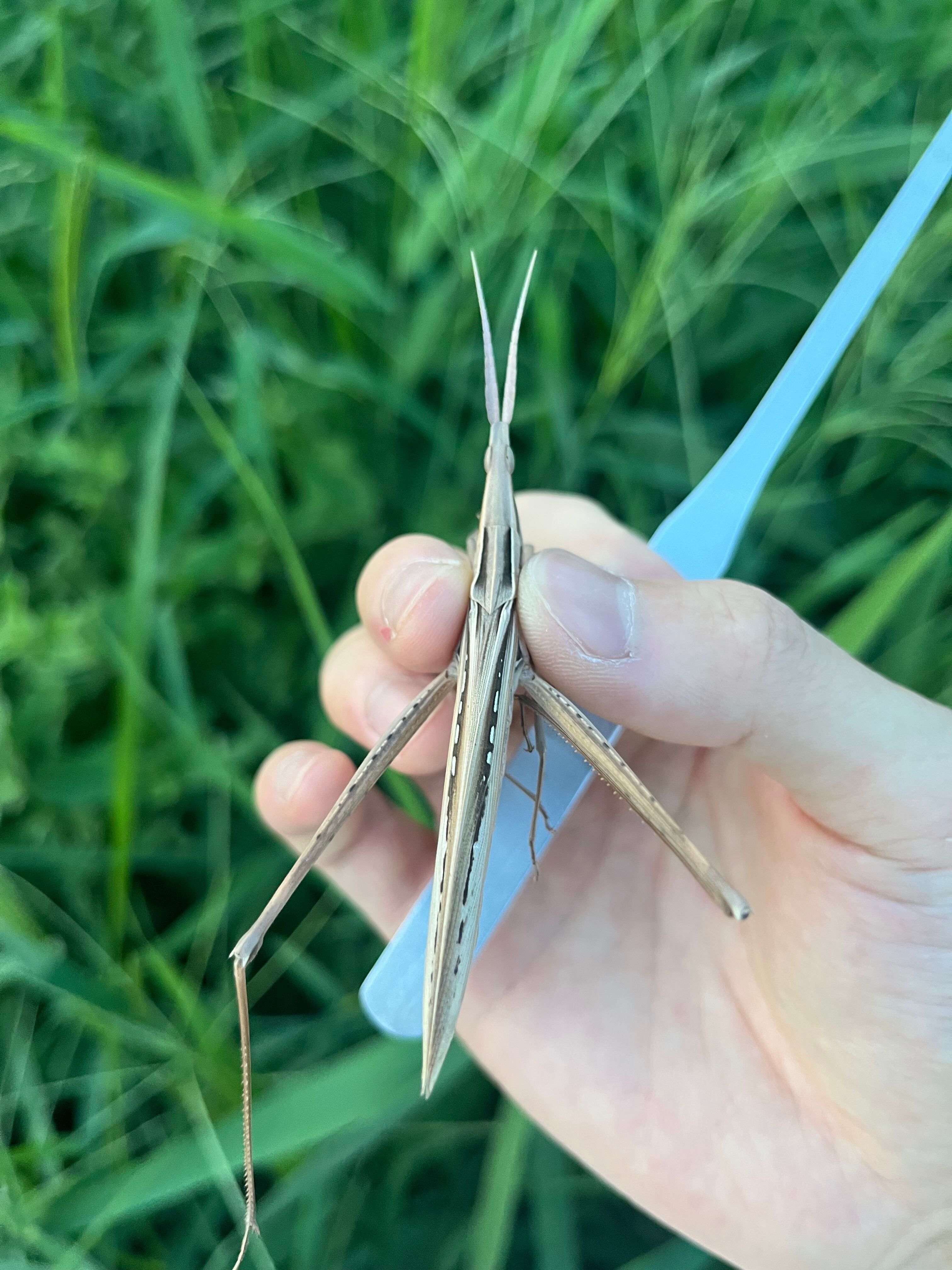 日本に分布するバッタの中では最大種で、斜め上に尖った頭部が特徴である。