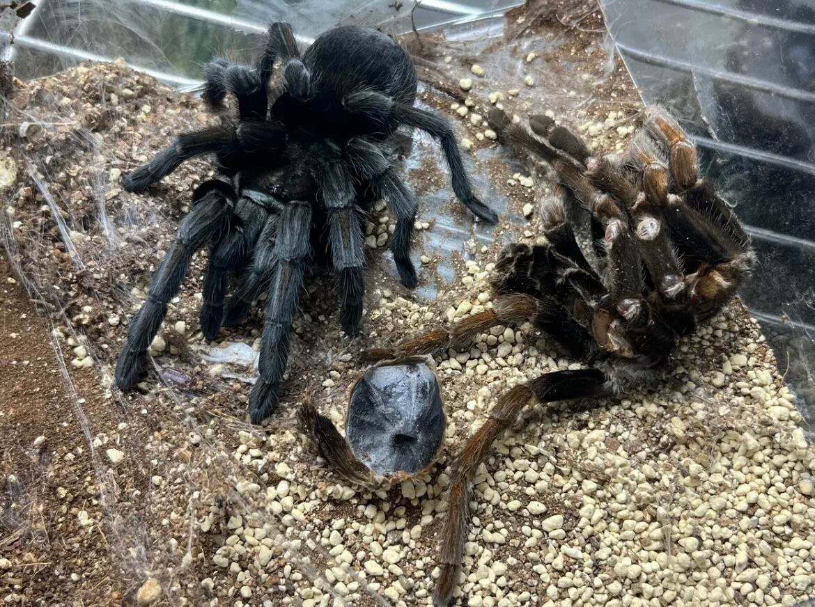 ゴールデンブルーレッグバブーンの脚のように脱皮直後は黒い体色ですが、時間が経つにつれオレンジに色付いてきます。LS18cmまでいくみたいで割と大きくなりますのでおすすめです!2022年に初めて販売されたのでタランチュラの最先端種でもあります。