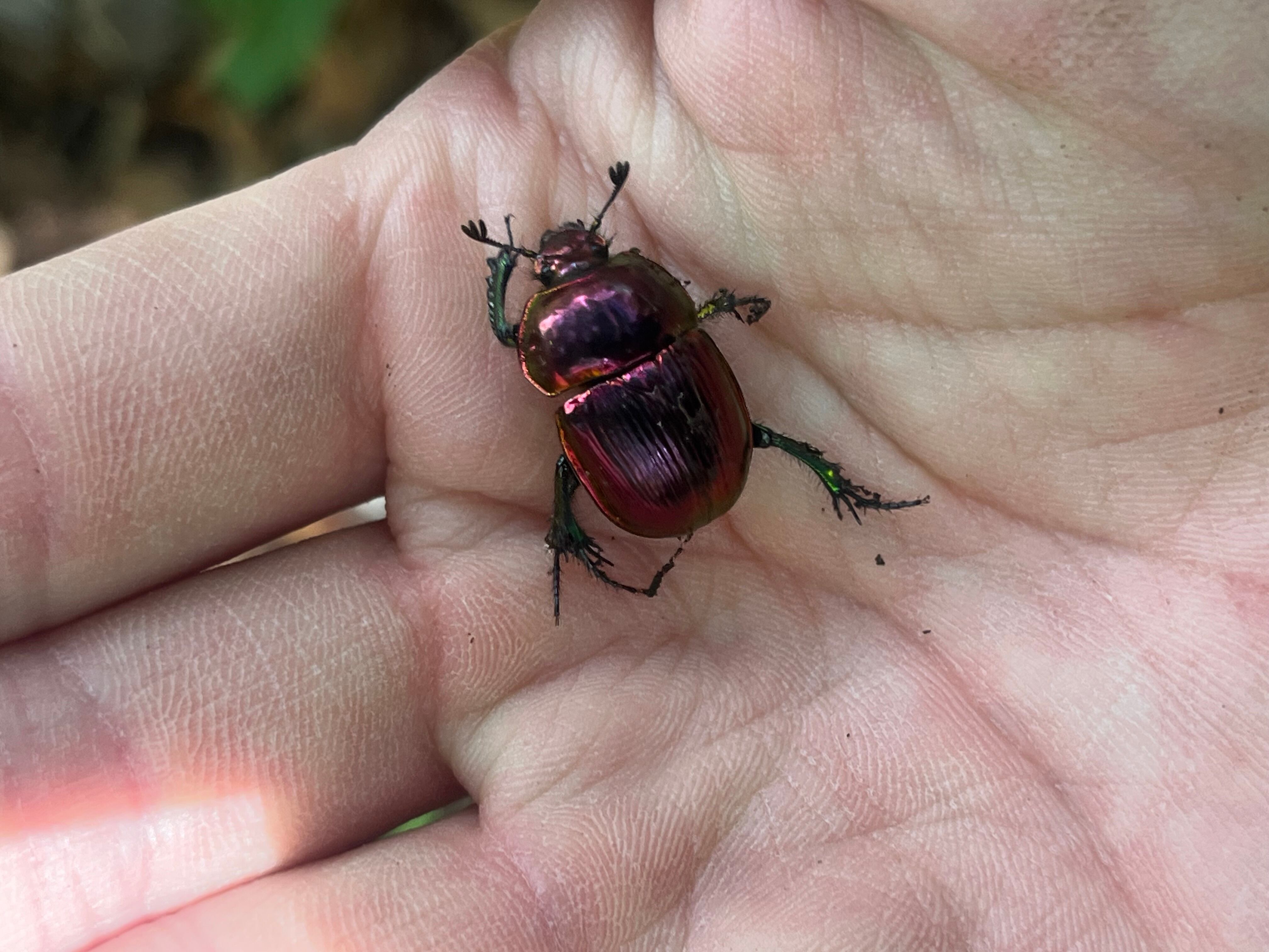 獣糞や動物の死がいに集まる黒っぽいコガネムシ。センチコガネに似るが、より体表の輝きが強く美しい。色は、金緑、金青緑、金紫、金赤紫など地域によってさまざまなバリエーションがある。上翅には細かな筋がある。また、胸部背面中央に、縦筋がある。