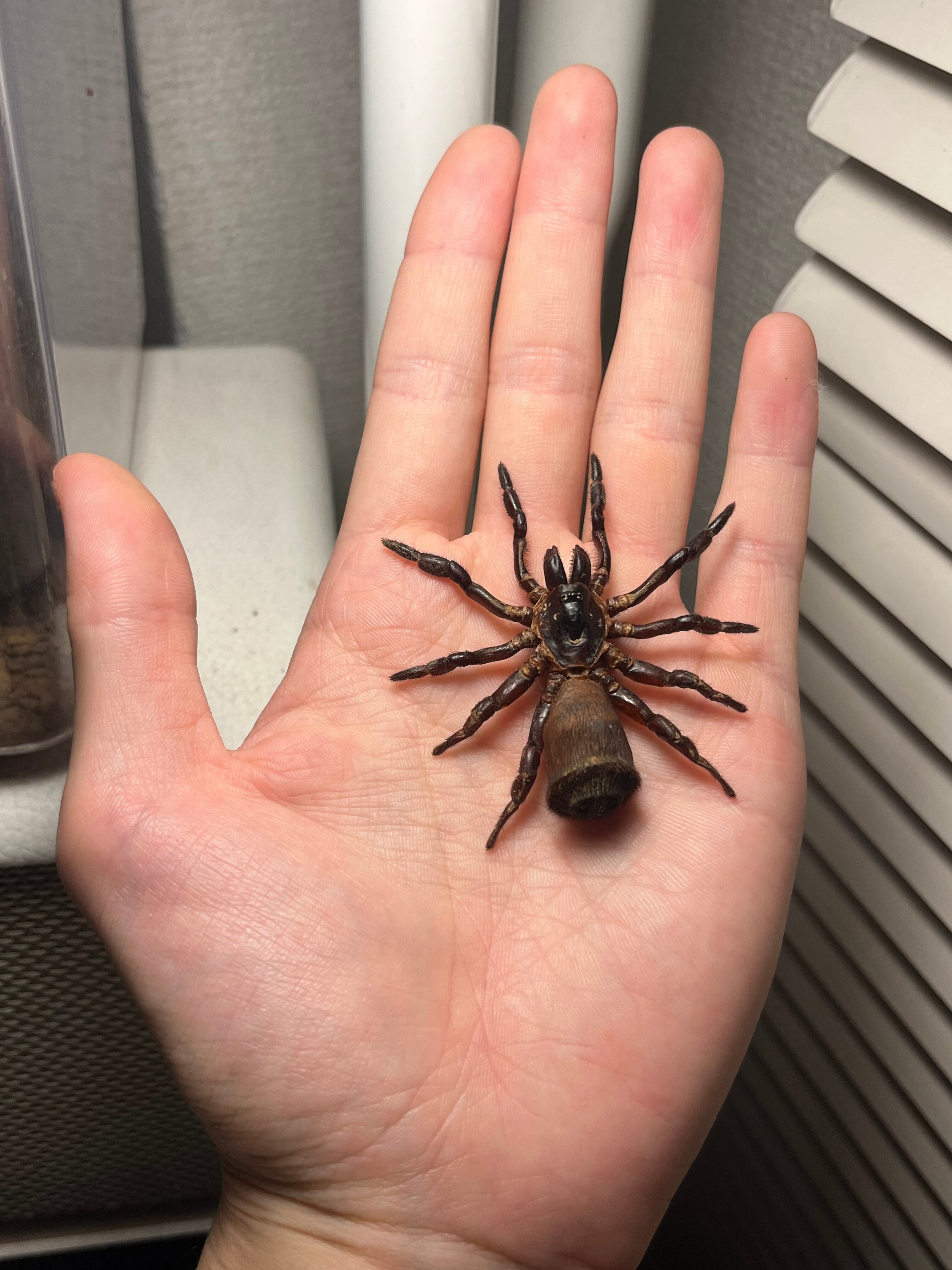 オレオみたいなお尻が特徴的なトラップドアスパイダーです。ハンコに見えるのでスタンプスパイダーとも呼ばれています。