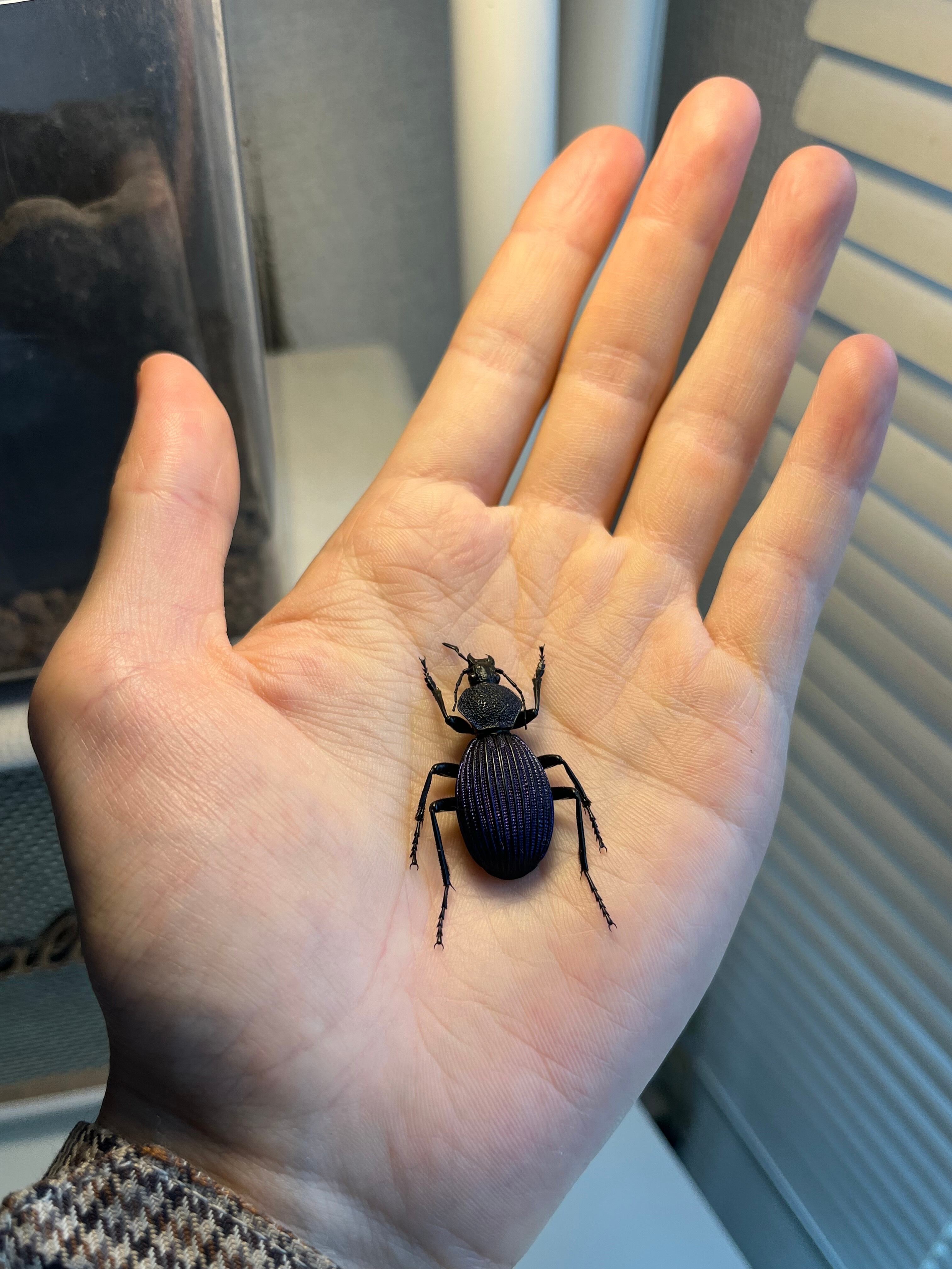 白い光を当てなくても青く、網目模様が美しいゴミムシです。