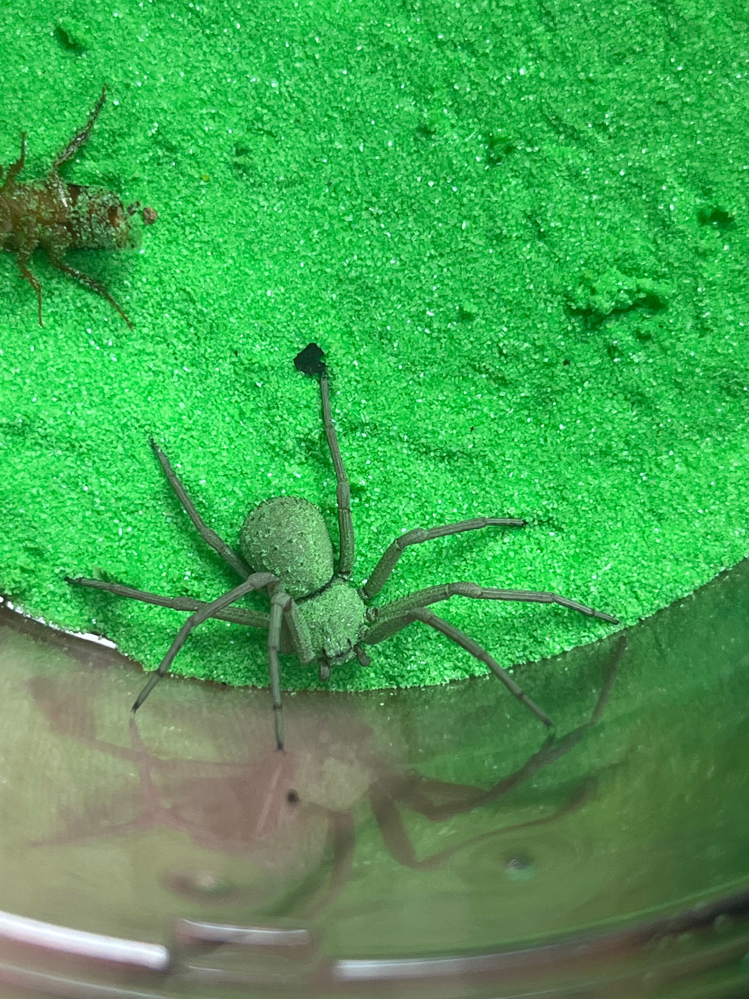 砂をまとったので白くなっています。他の色の砂で飼育すると自分の好きな色のシカリウスを作れるそうです。今は緑色のカラーサンドで飼育しています。特に害はないようです。