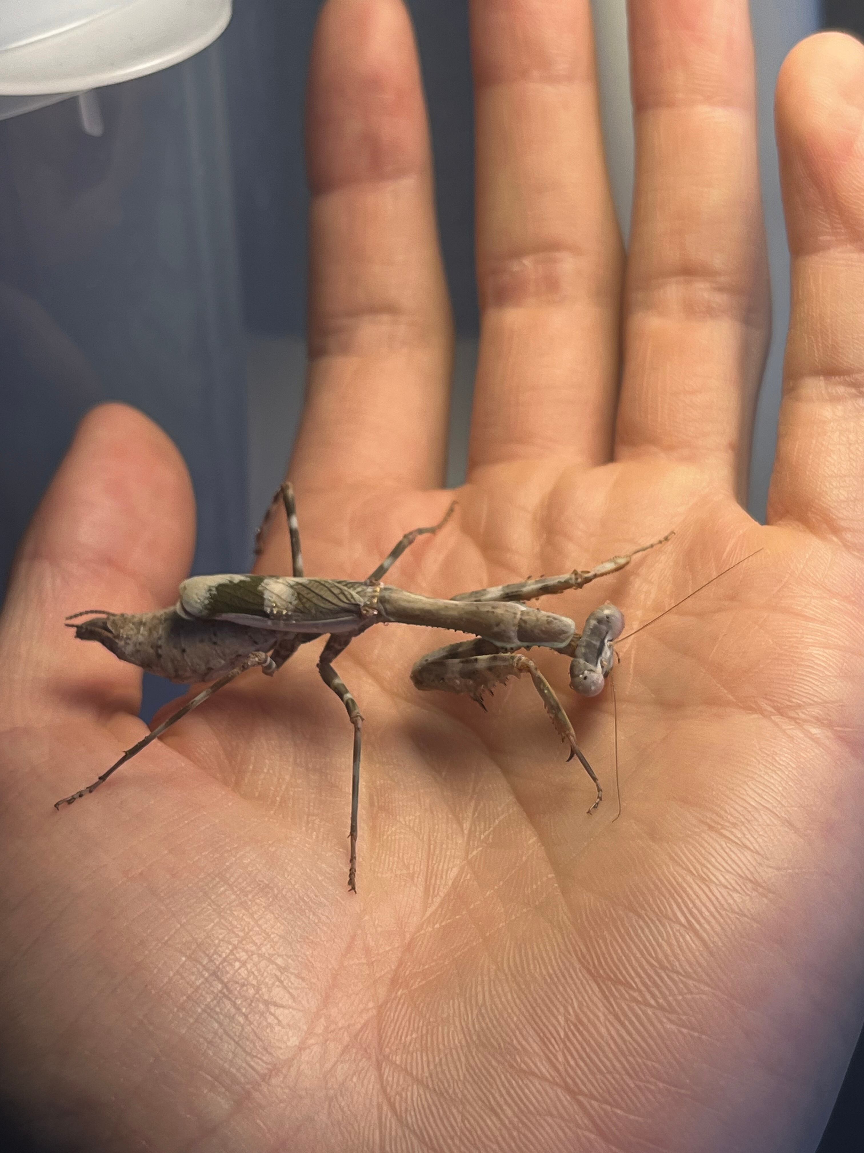画像個体の♀成虫をお送りします。羽の迷彩柄がかっこいいカマキリです。9/24に羽化しています。