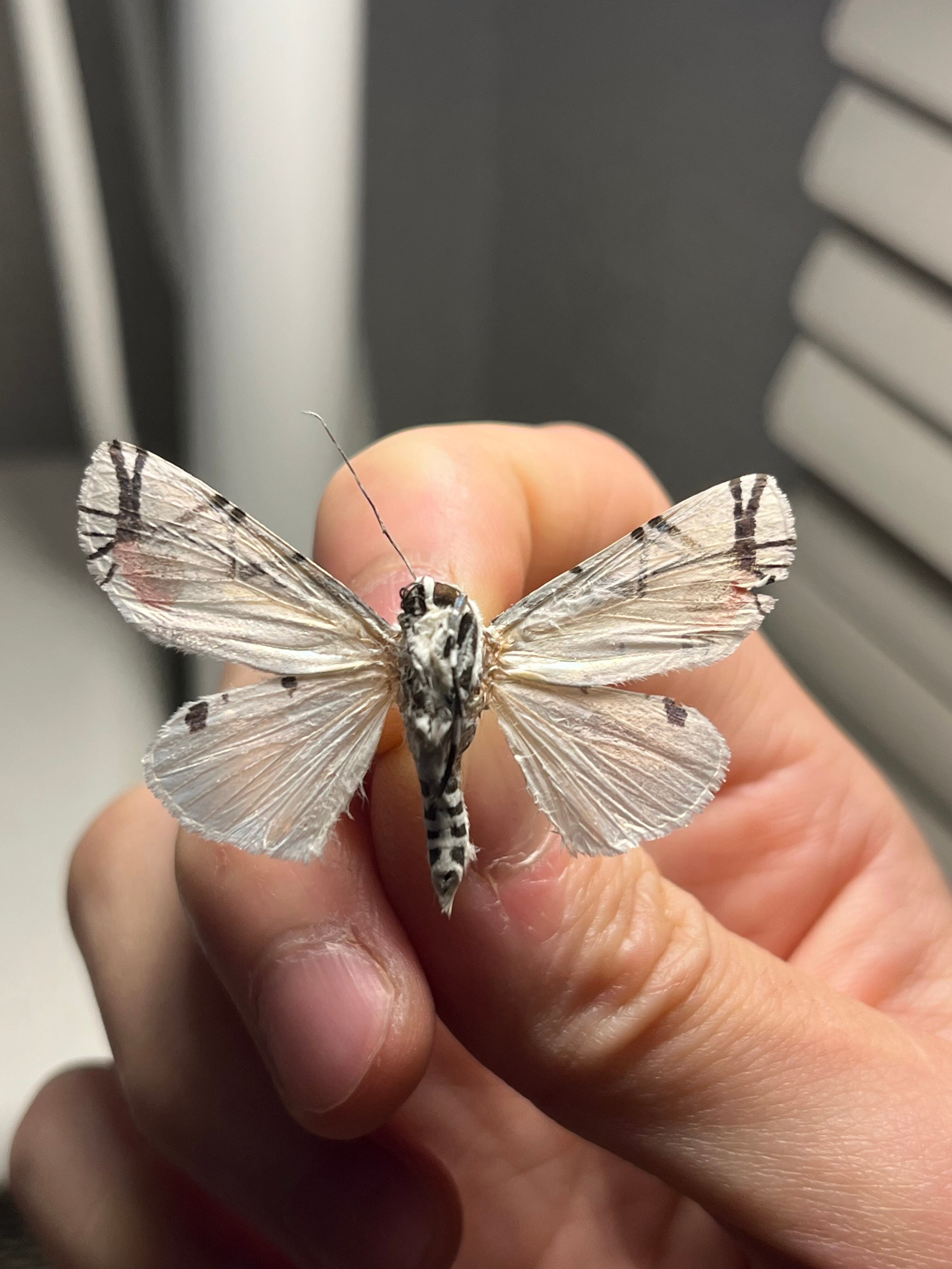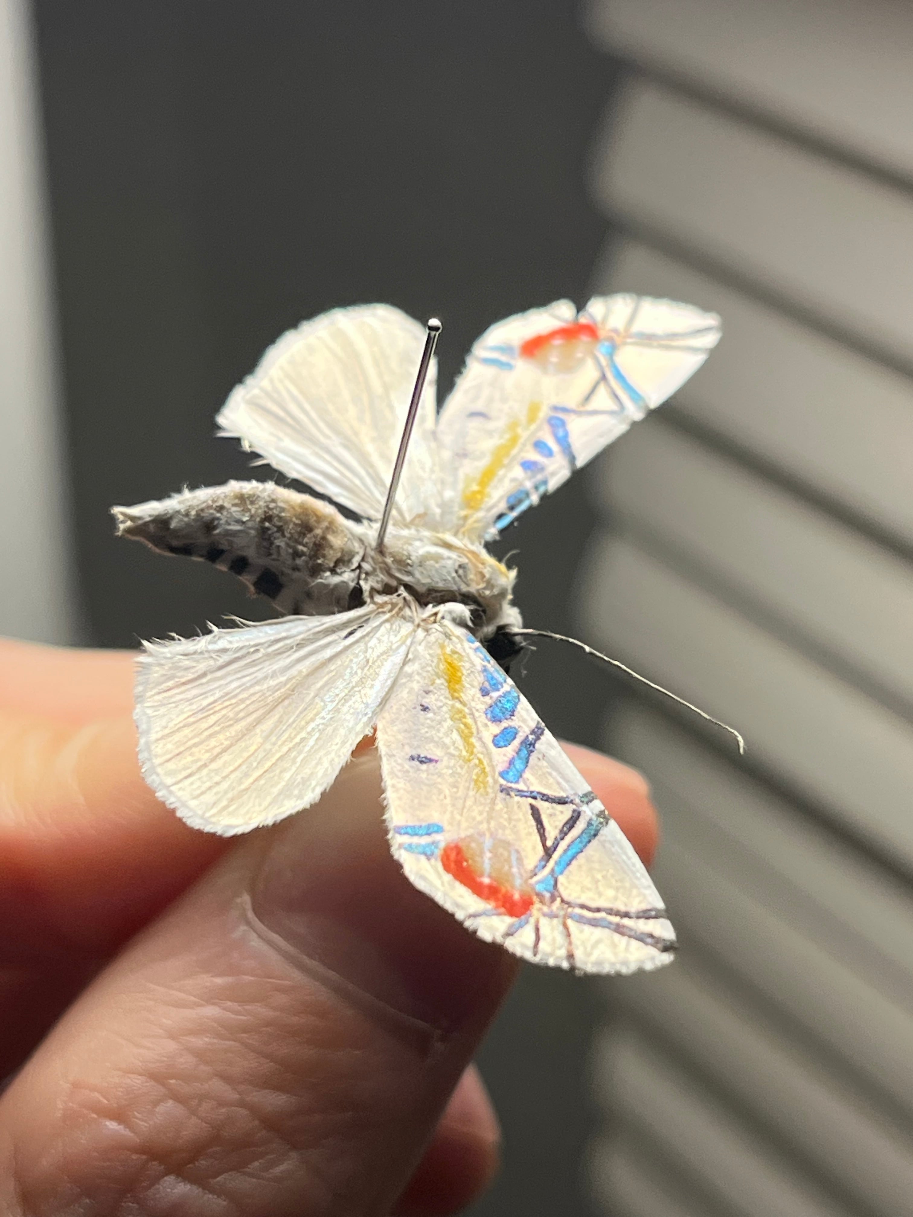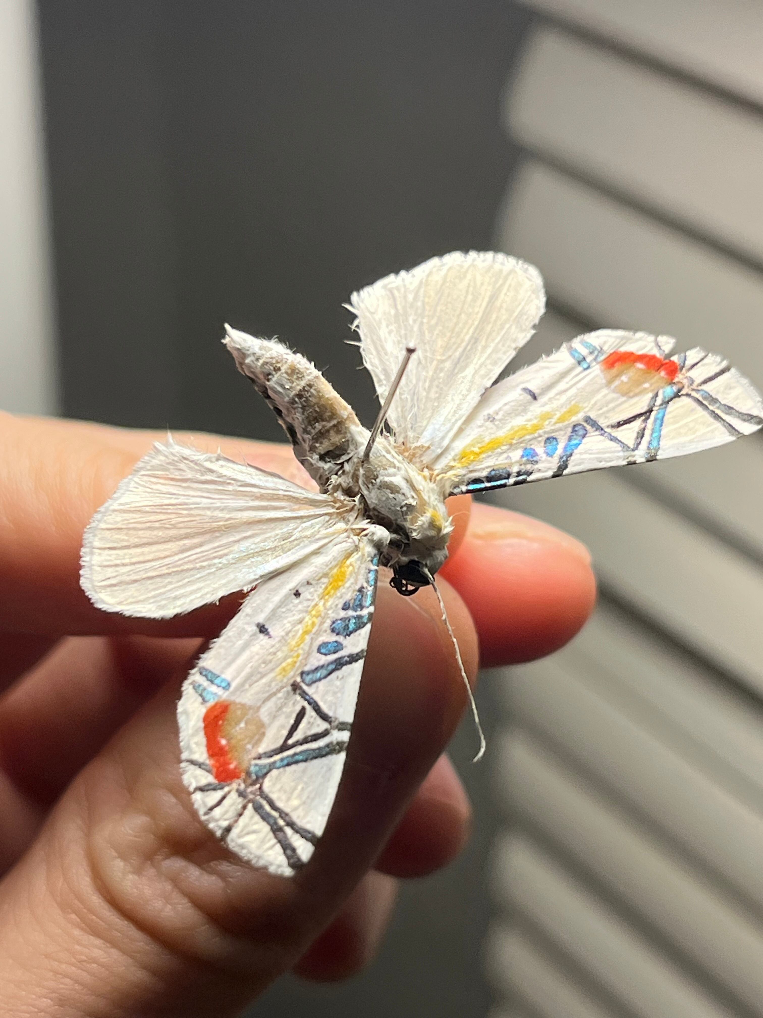 画像個体をお送りします。初めて展翅しましたが予想以上に難しく傷だらけになってしまっております。
