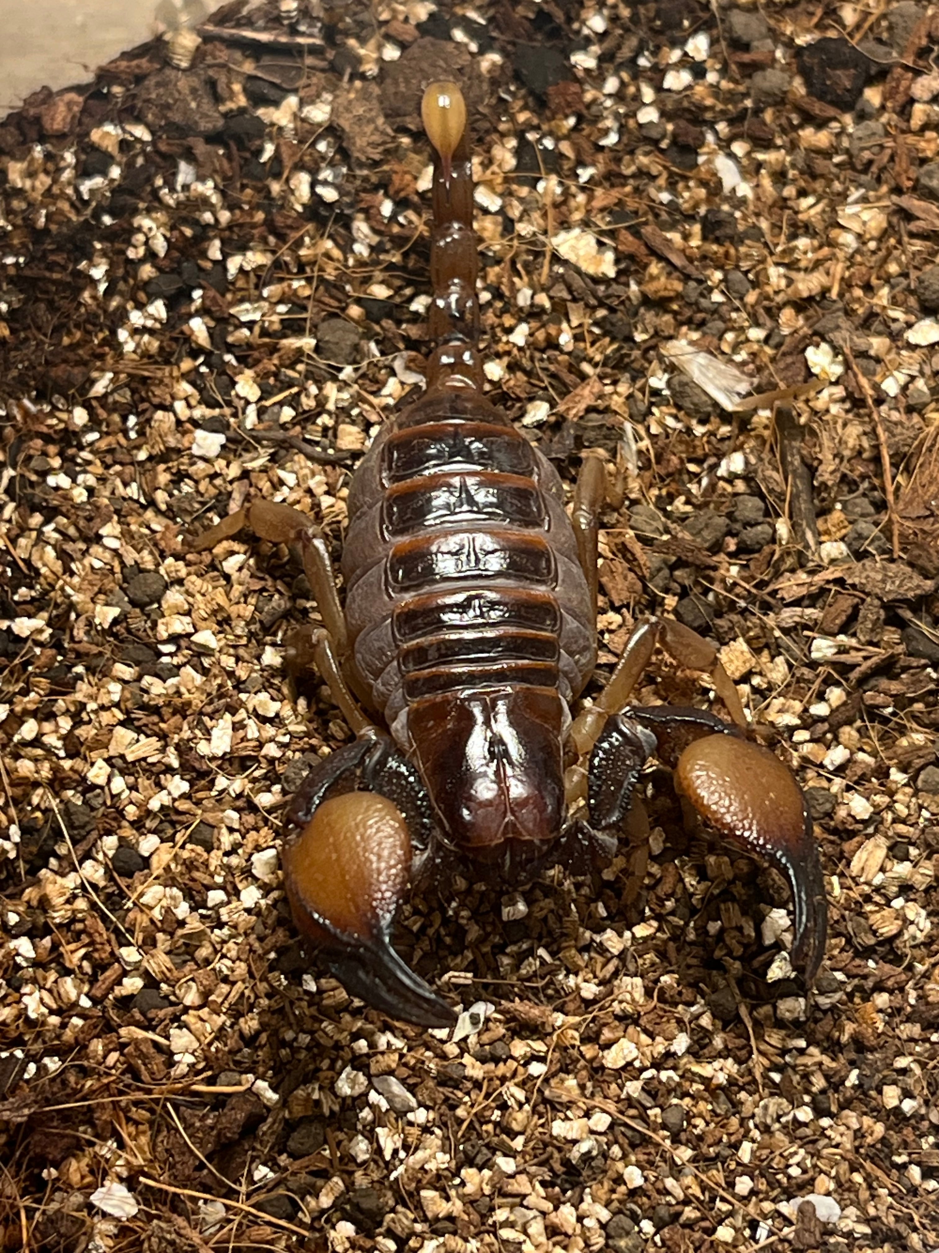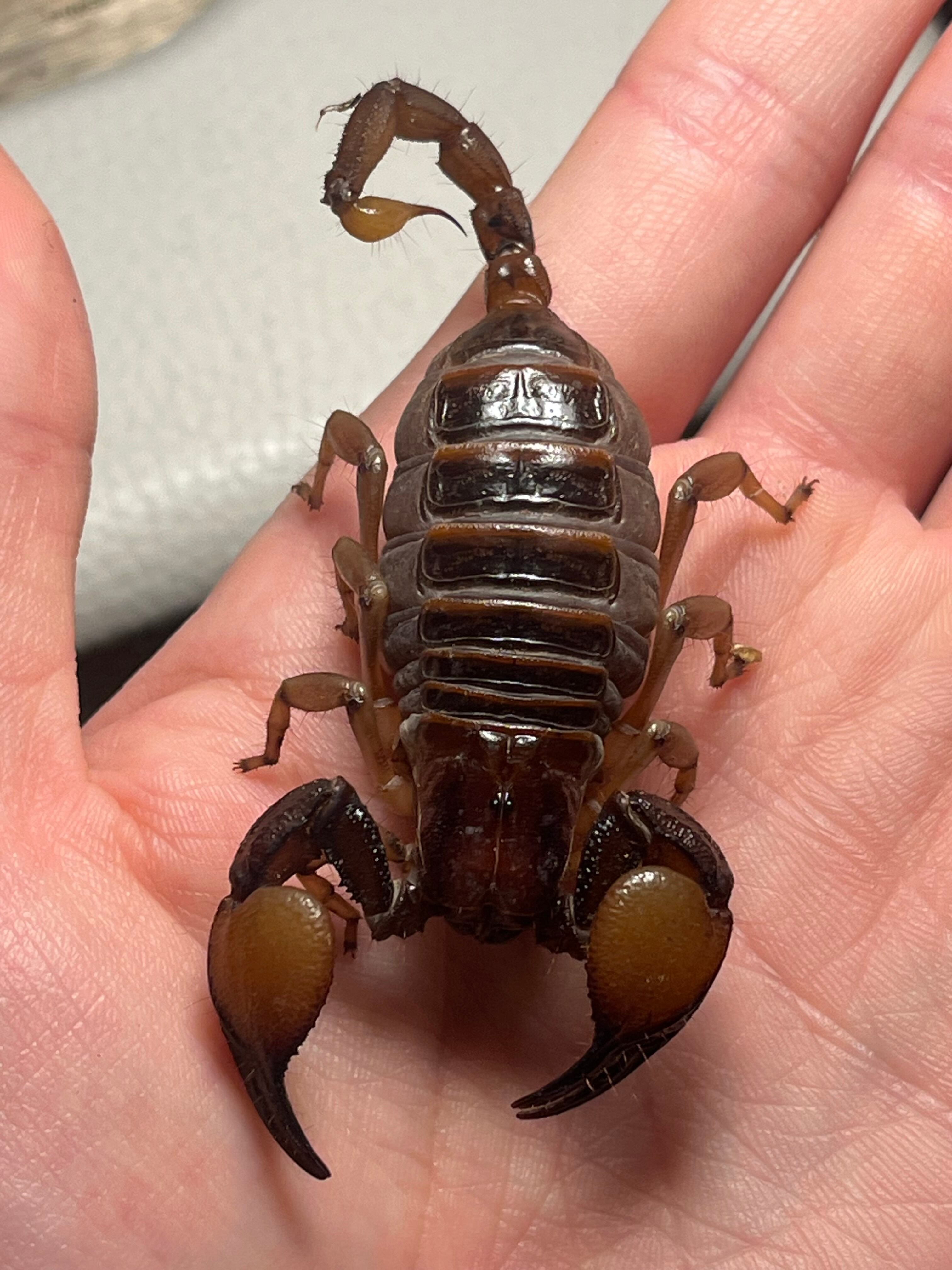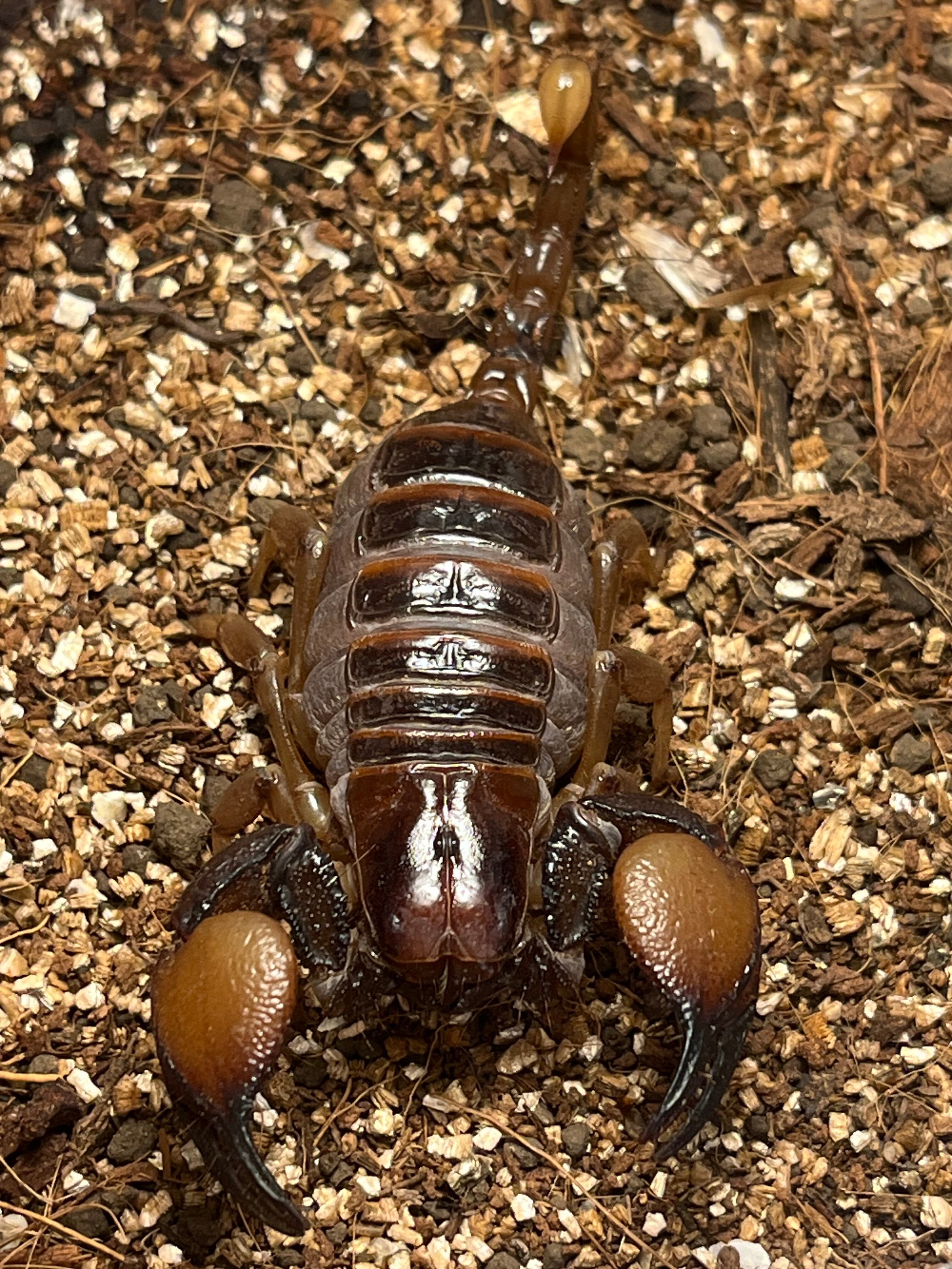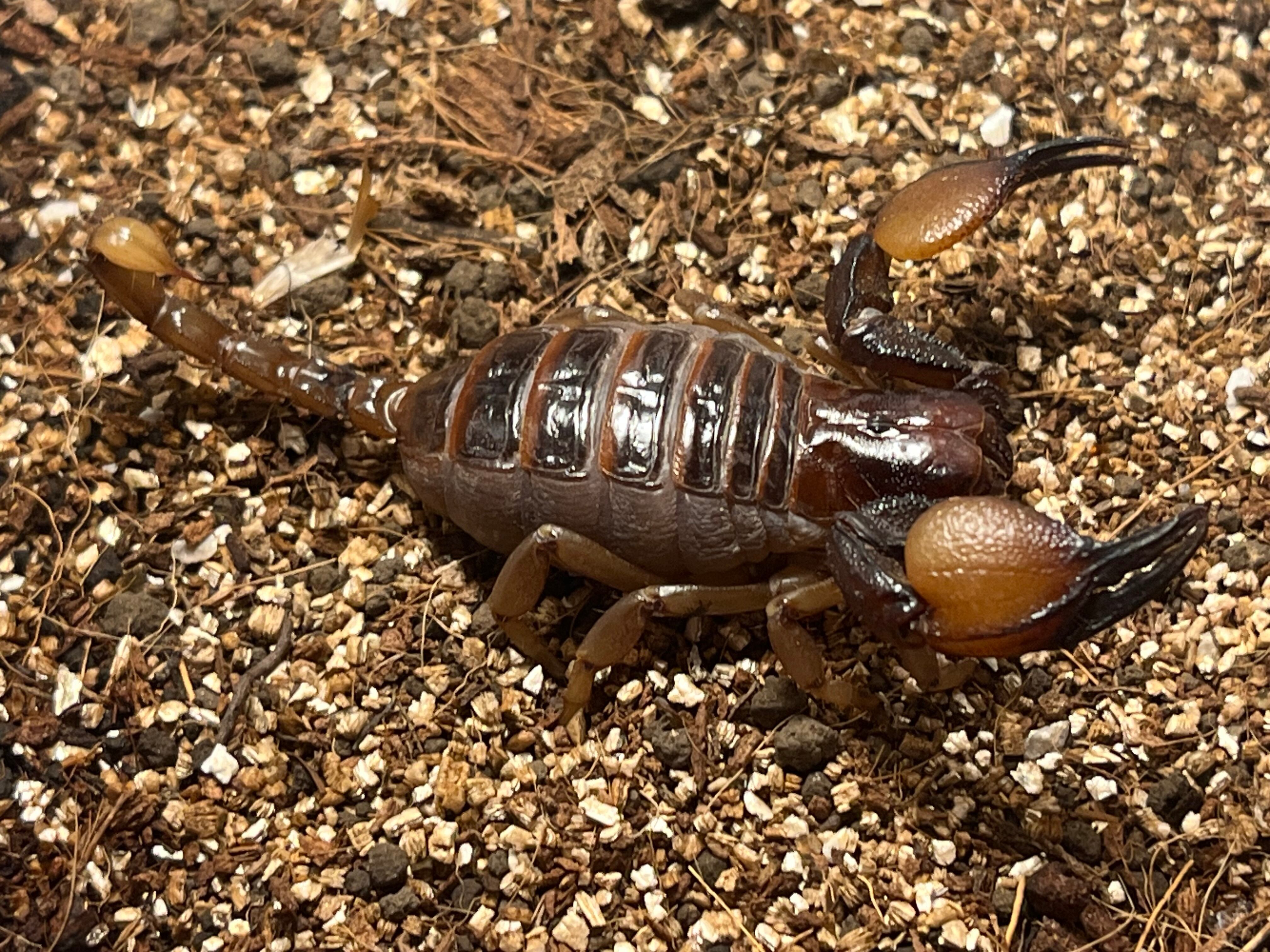 頑丈な穴掘りサソリ(Opistophthalmus carinatus)は、南アフリカの乾燥地帯に広く分布するサソリの一種です。穴掘りサソリの一種で、大きな岩のそばに巣穴を作ることが多いです。同属の他のサソリと比べて、特に頑丈な体と大きなハサミを持っています。