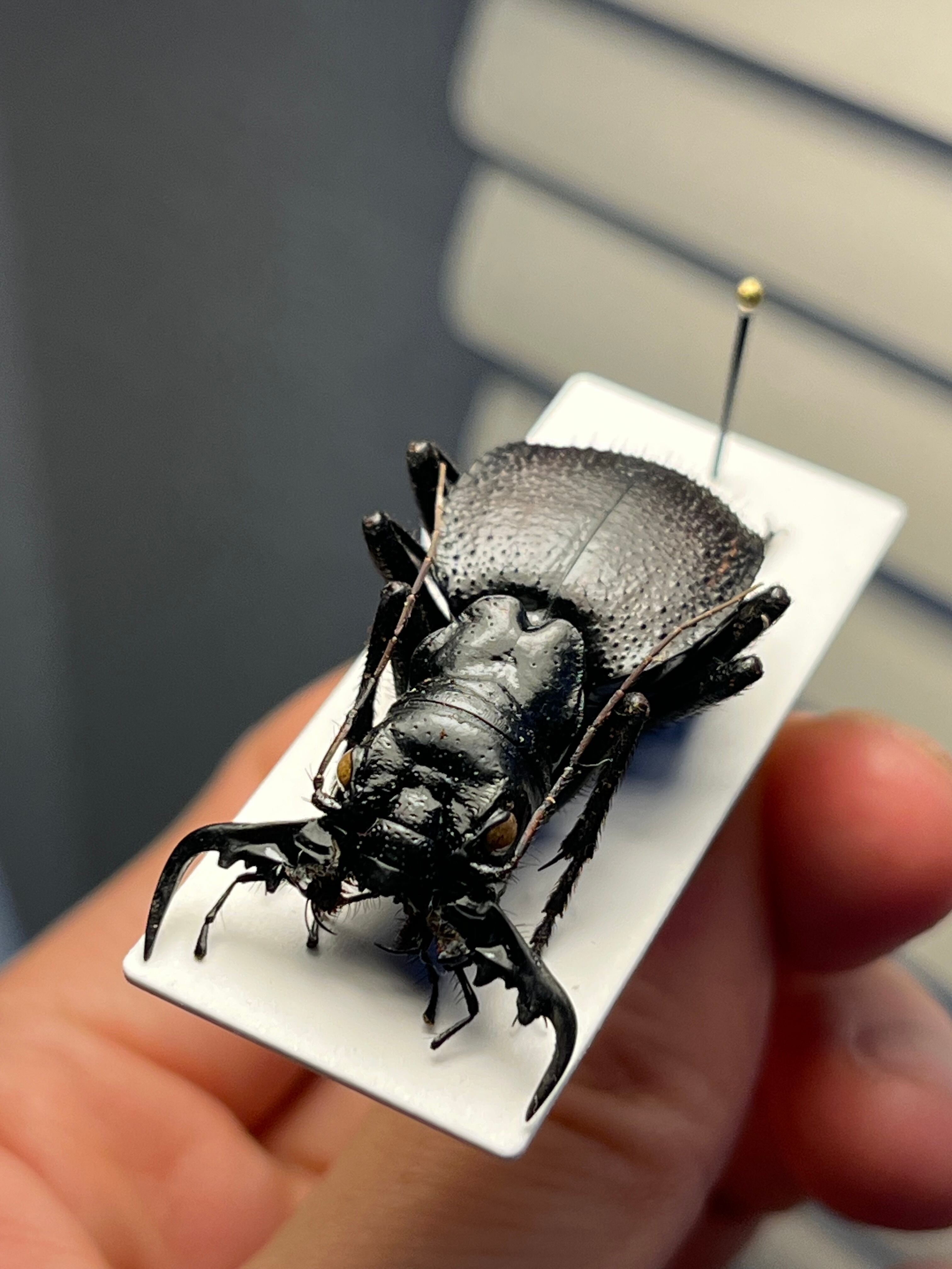オオエンマハンミョウは、アフリカ大陸南部のザンビア共和国に分布する。体長はハンミョウとしては最大級の約5センチ。黒い光沢のある丸い体が特徴で、オスは左右で形が違う大あごを持つ。