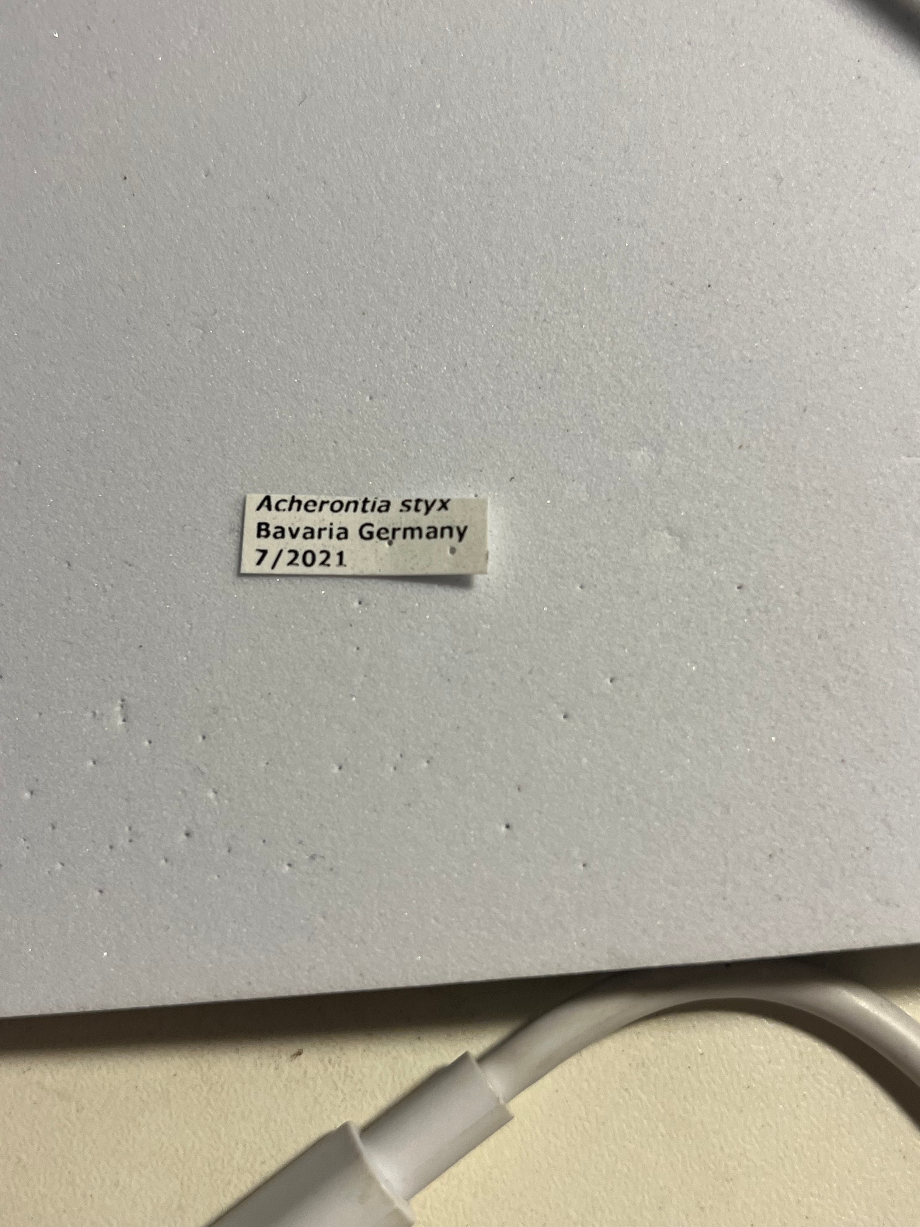 伝説によると、この種(アトロポス)がイギリスで初めて目撃されたのはチャールズ1世の処刑時と言われていますが、おそらくは、数十年前のジャガイモの輸送時に初めて持ち込まれたため、その頃にはより一般的になっていた可能性が高いでしょう。より稀ではあるものの、今でも時折イギリスで目撃されています。