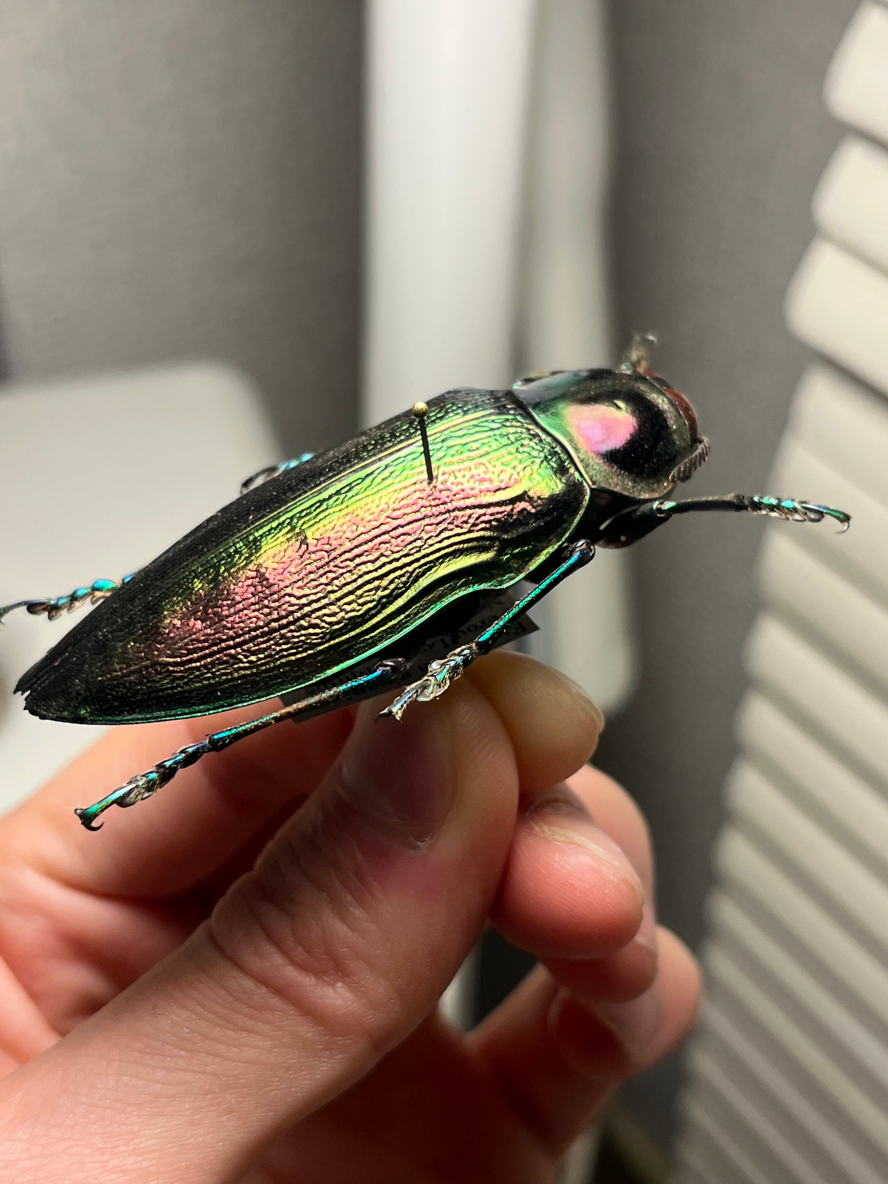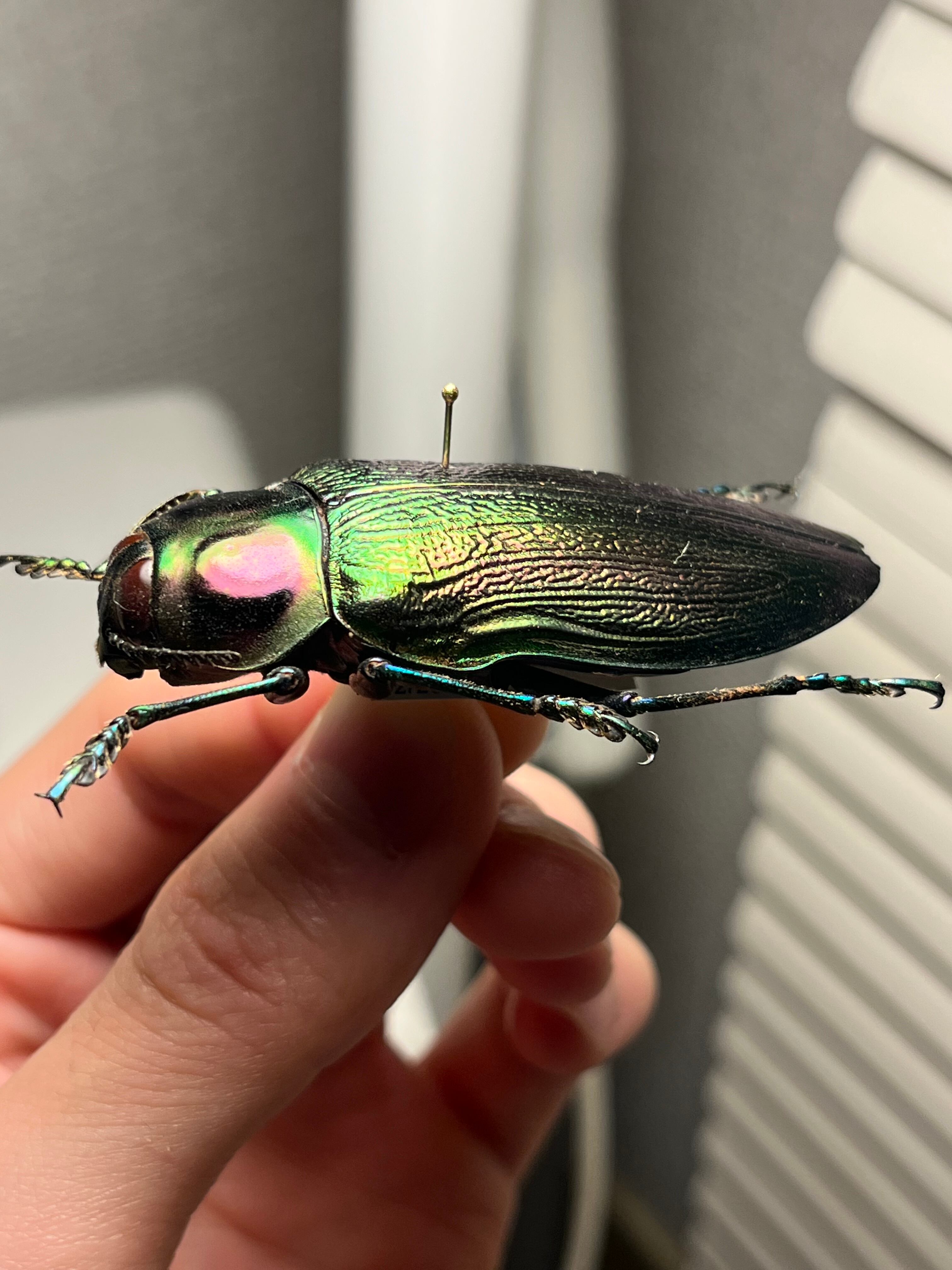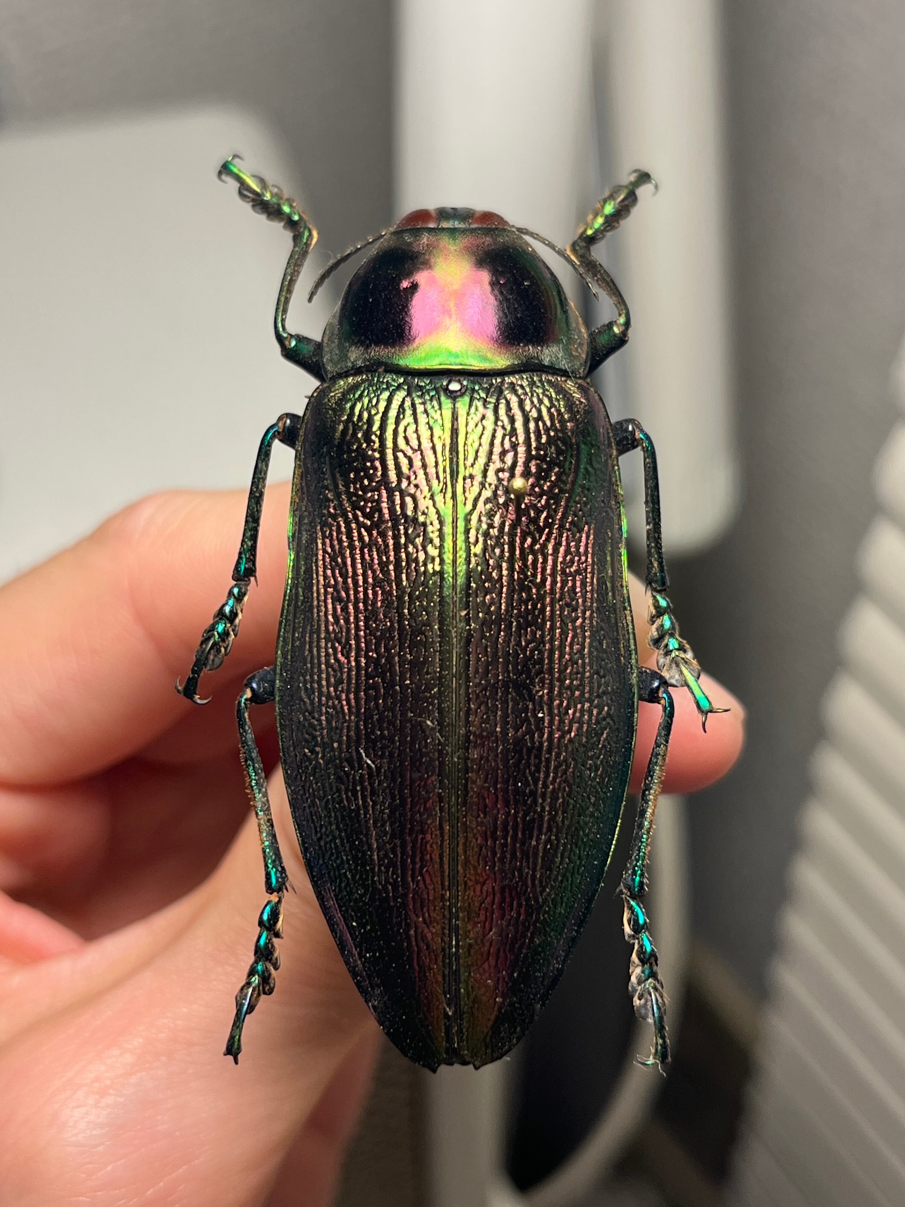Euchroma giganteumは、タマムシ科甲虫の中で最大級の種であり(ラテン語名「giganteum」の由来)、体長は約50~80ミリメートルに達します。
