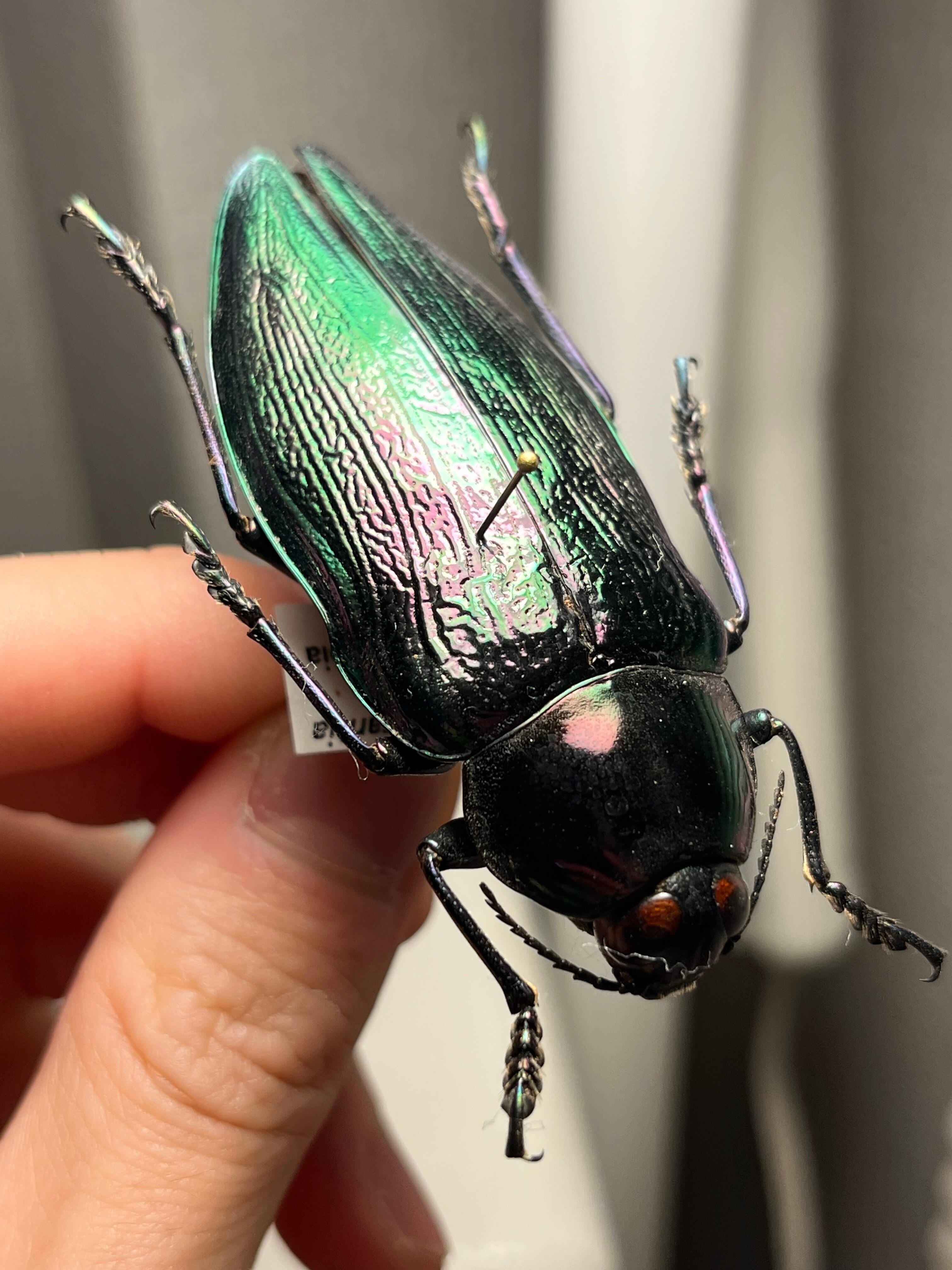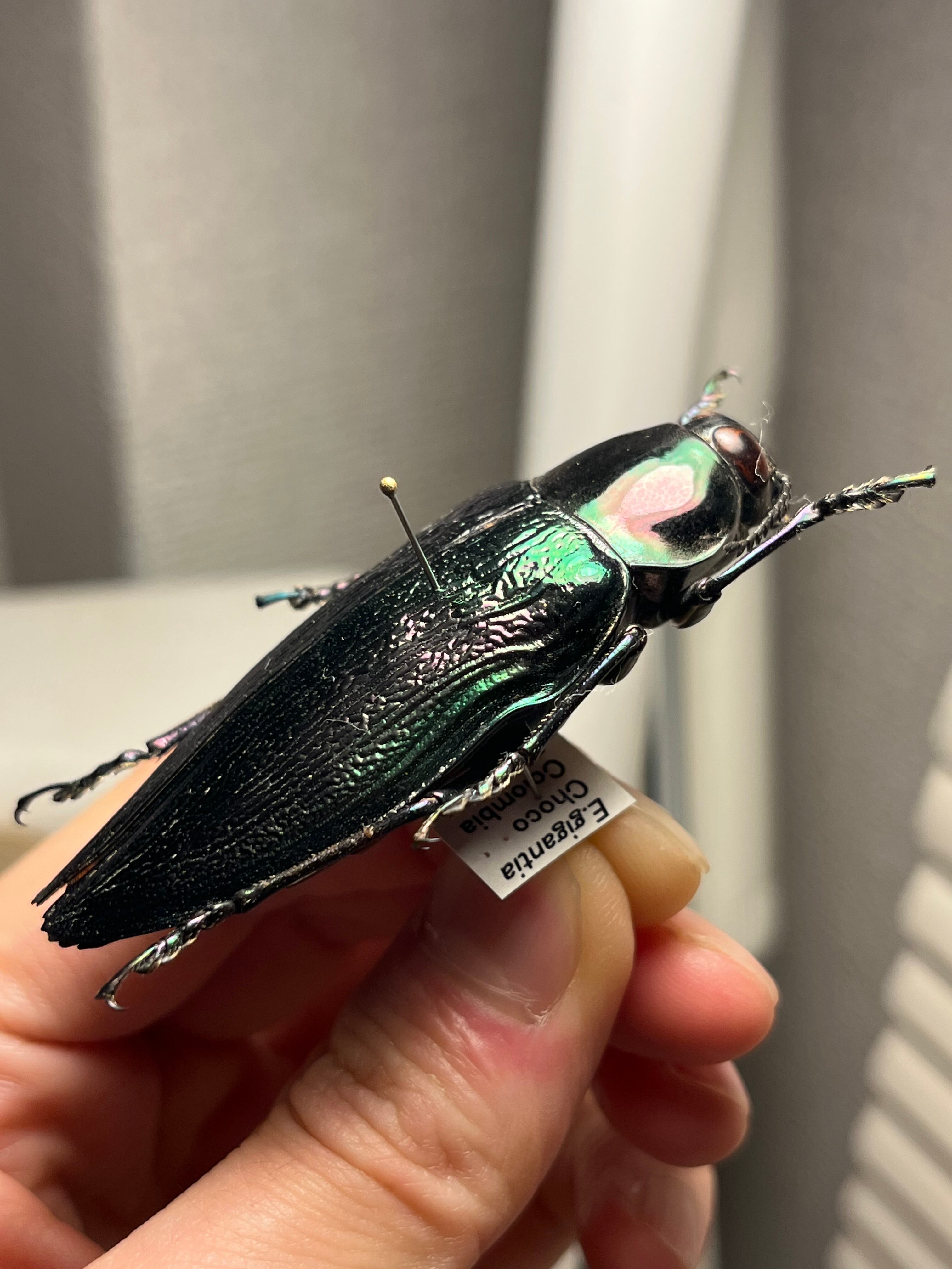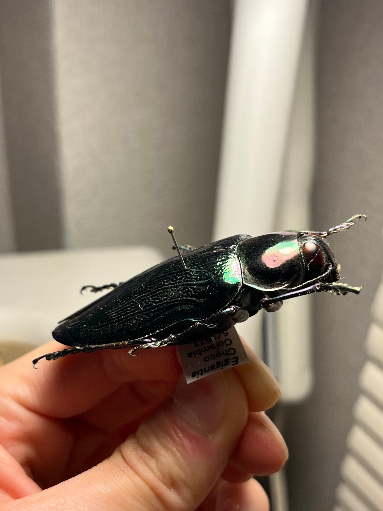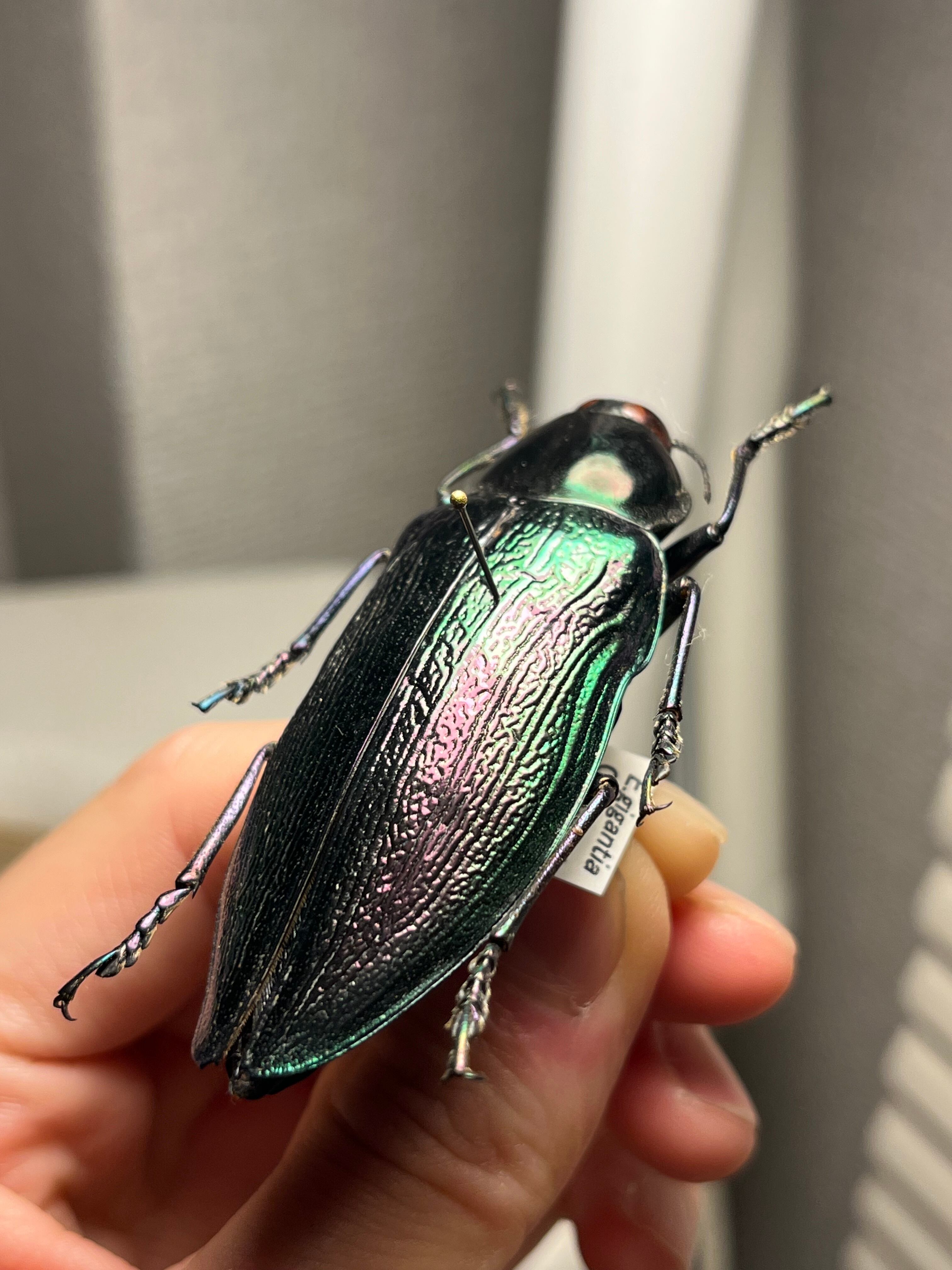 Euchroma giganteumは、タマムシ科甲虫の中で最大級の種であり(ラテン語名「giganteum」の由来)、体長は約50~80ミリメートルに達します。