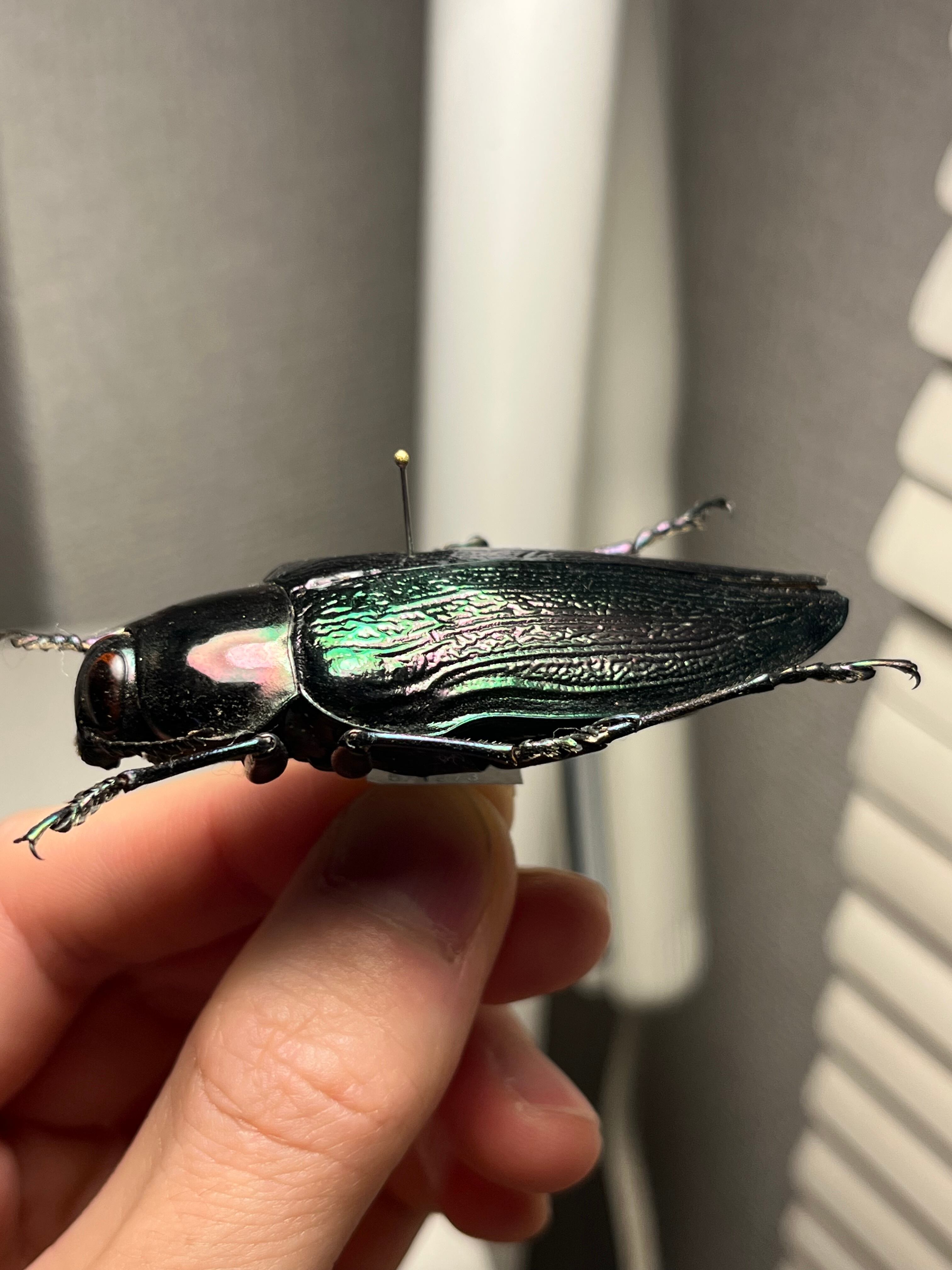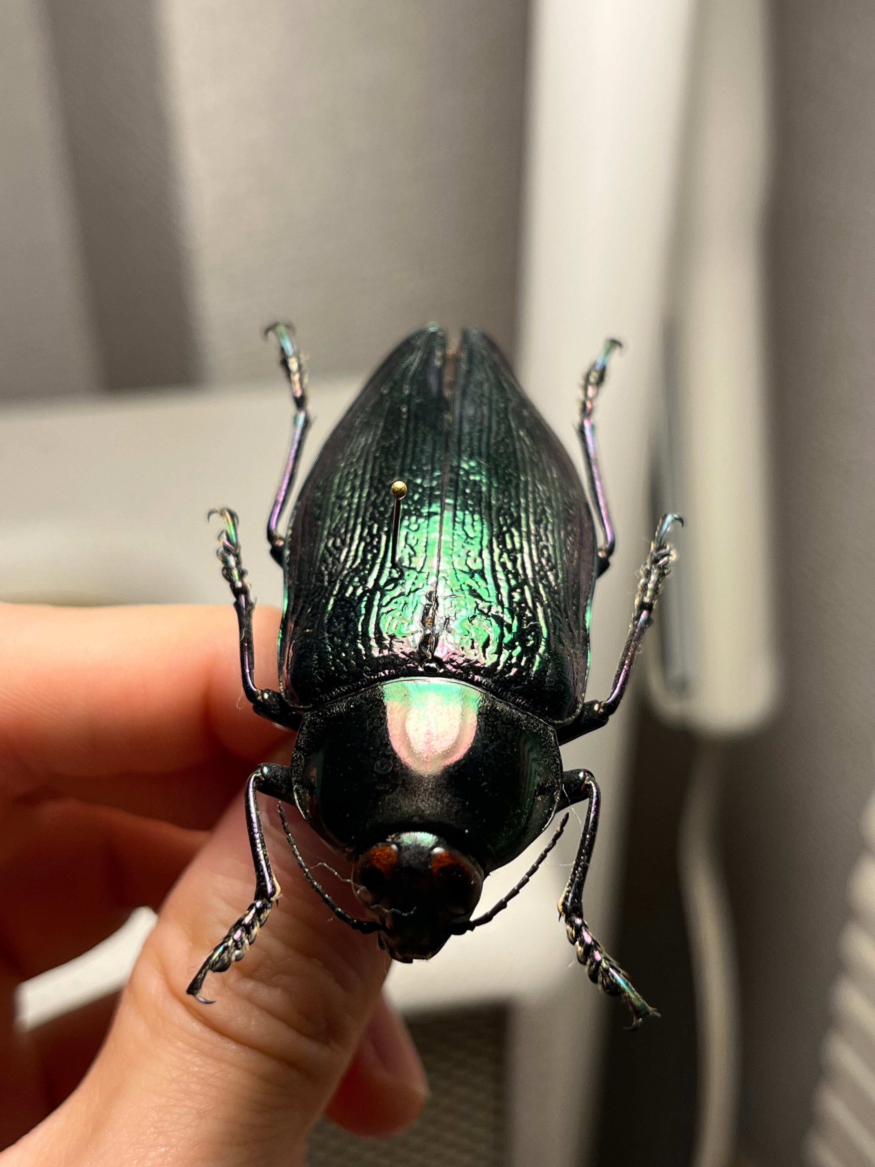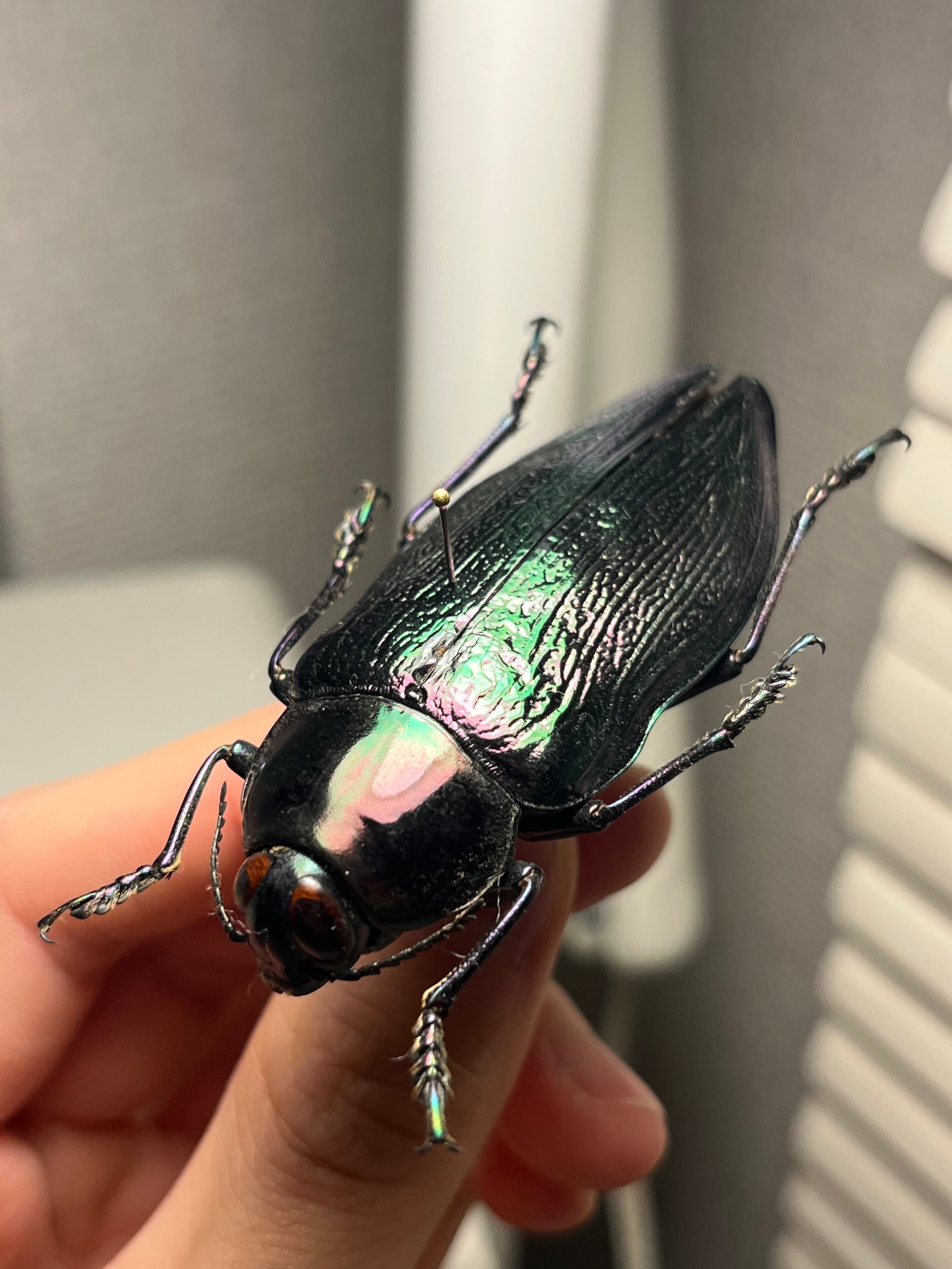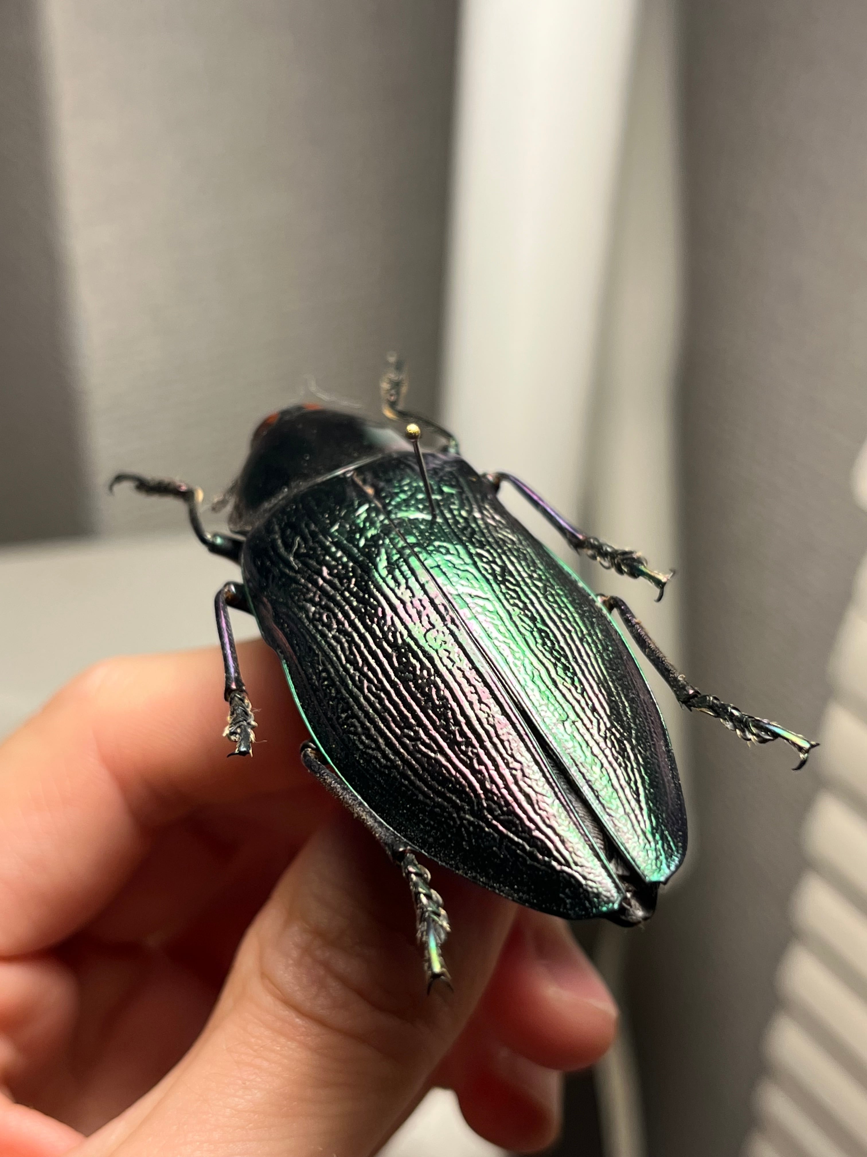 Euchroma giganteumは、タマムシ科甲虫の中で最大級の種であり(ラテン語名「giganteum」の由来)、体長は約50~80ミリメートルに達します。