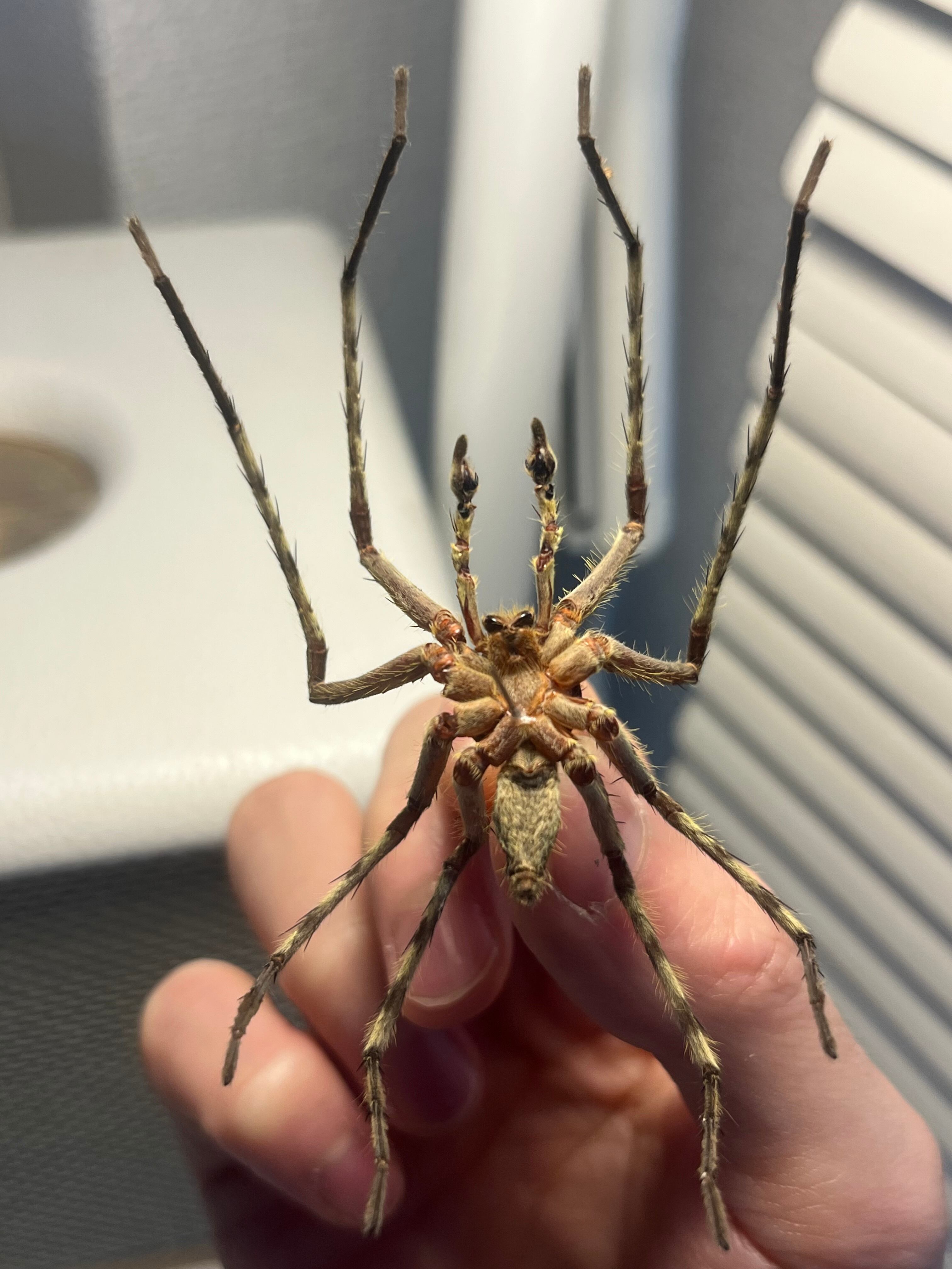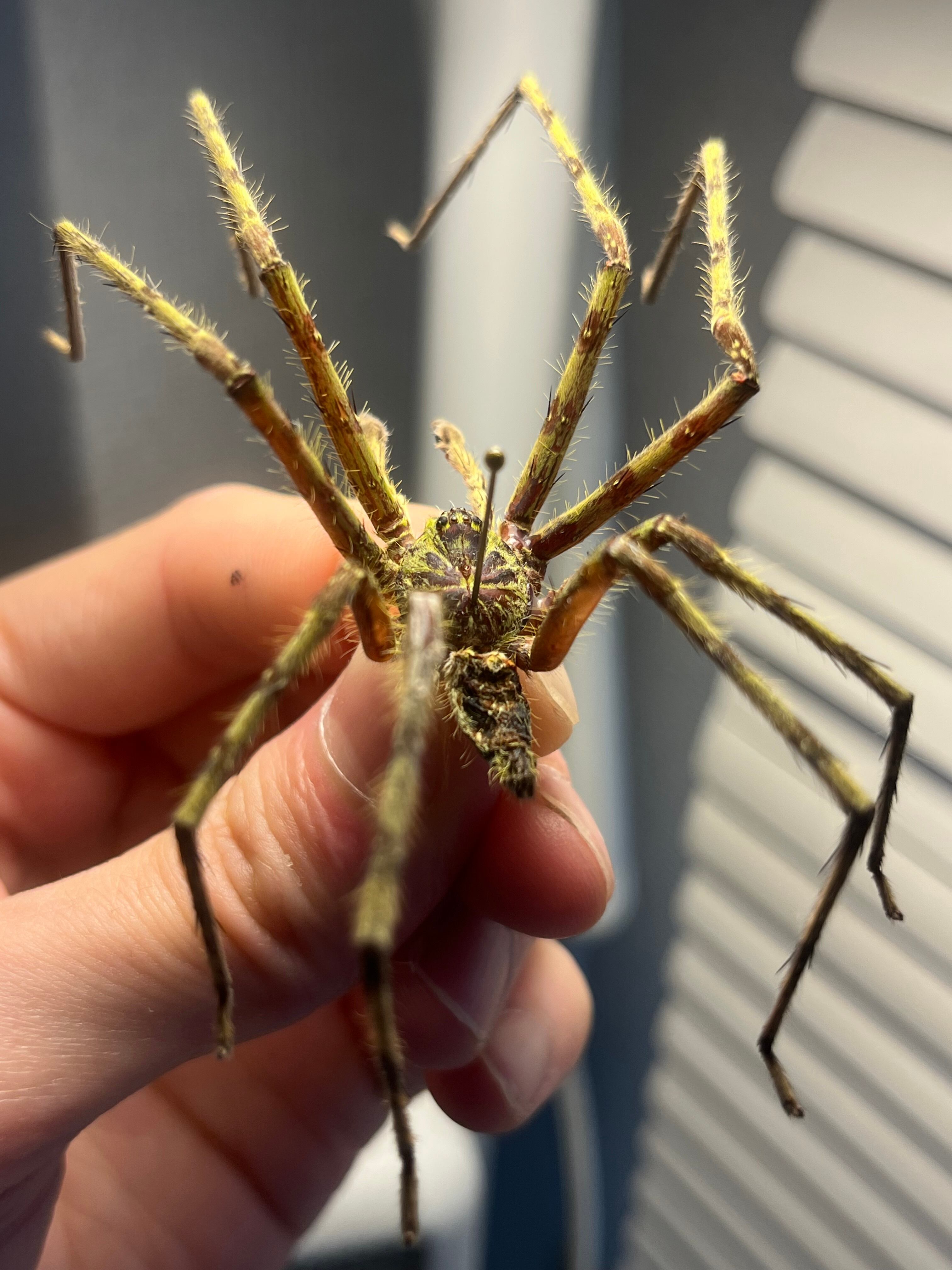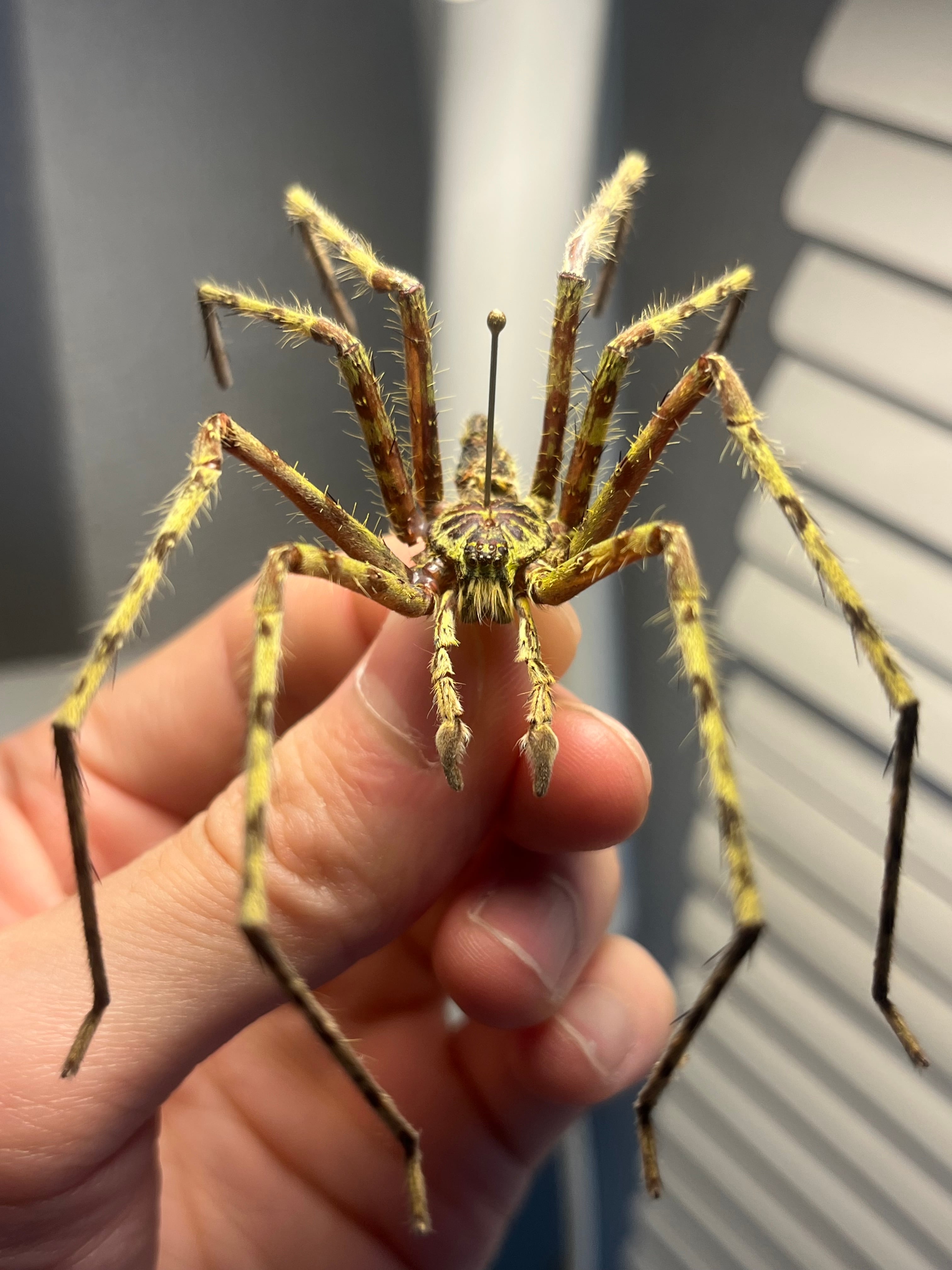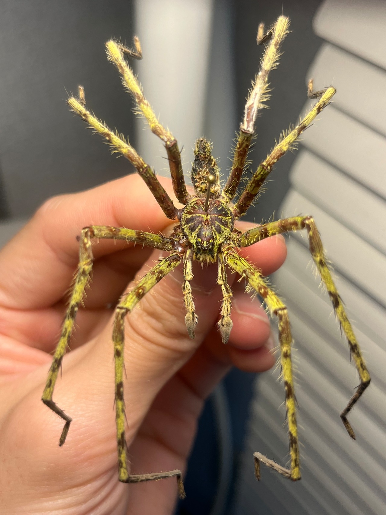 おそらくグリーンハンツマンの標本です。ハンツマン、アシダガグモ系の中でも大きな部類です。