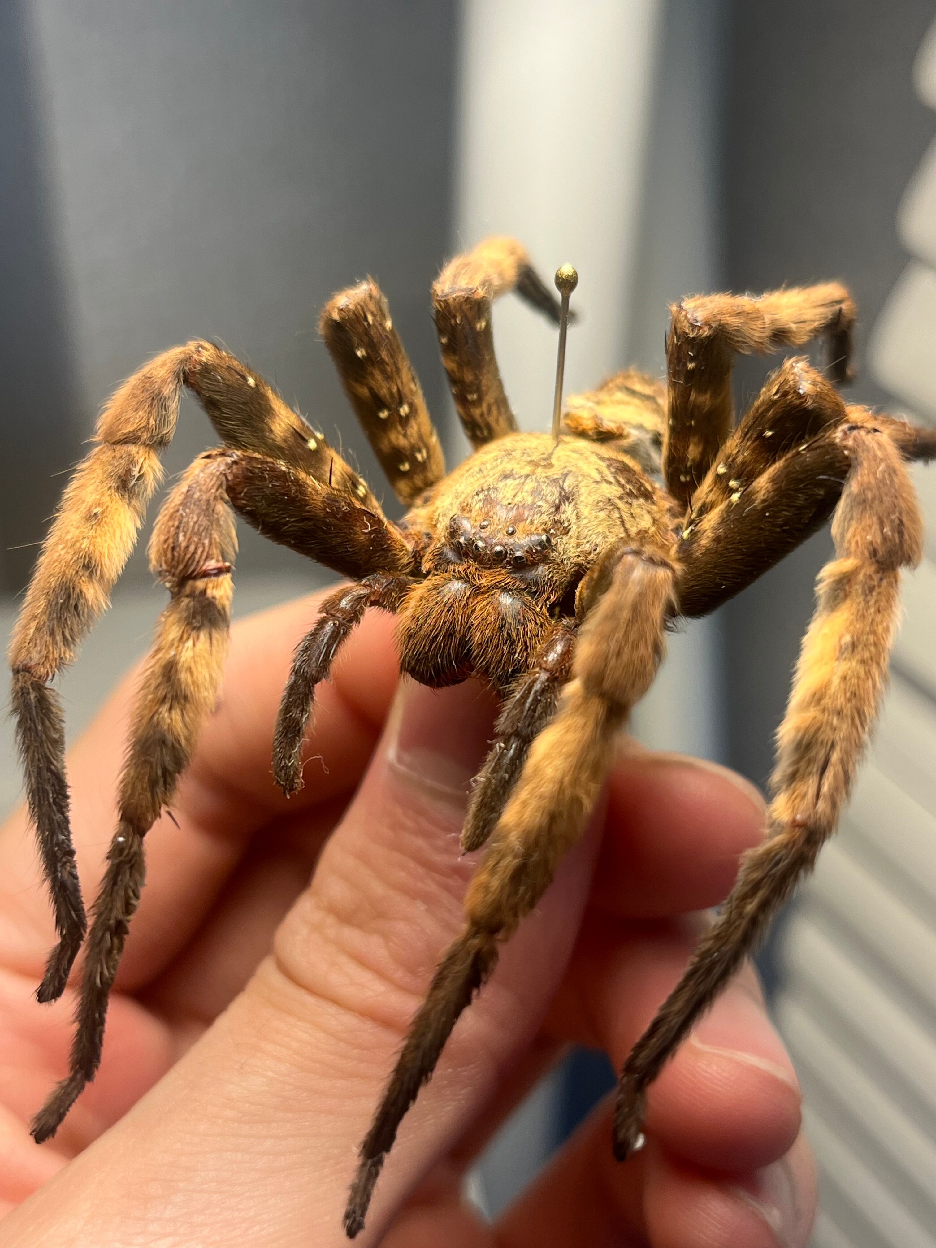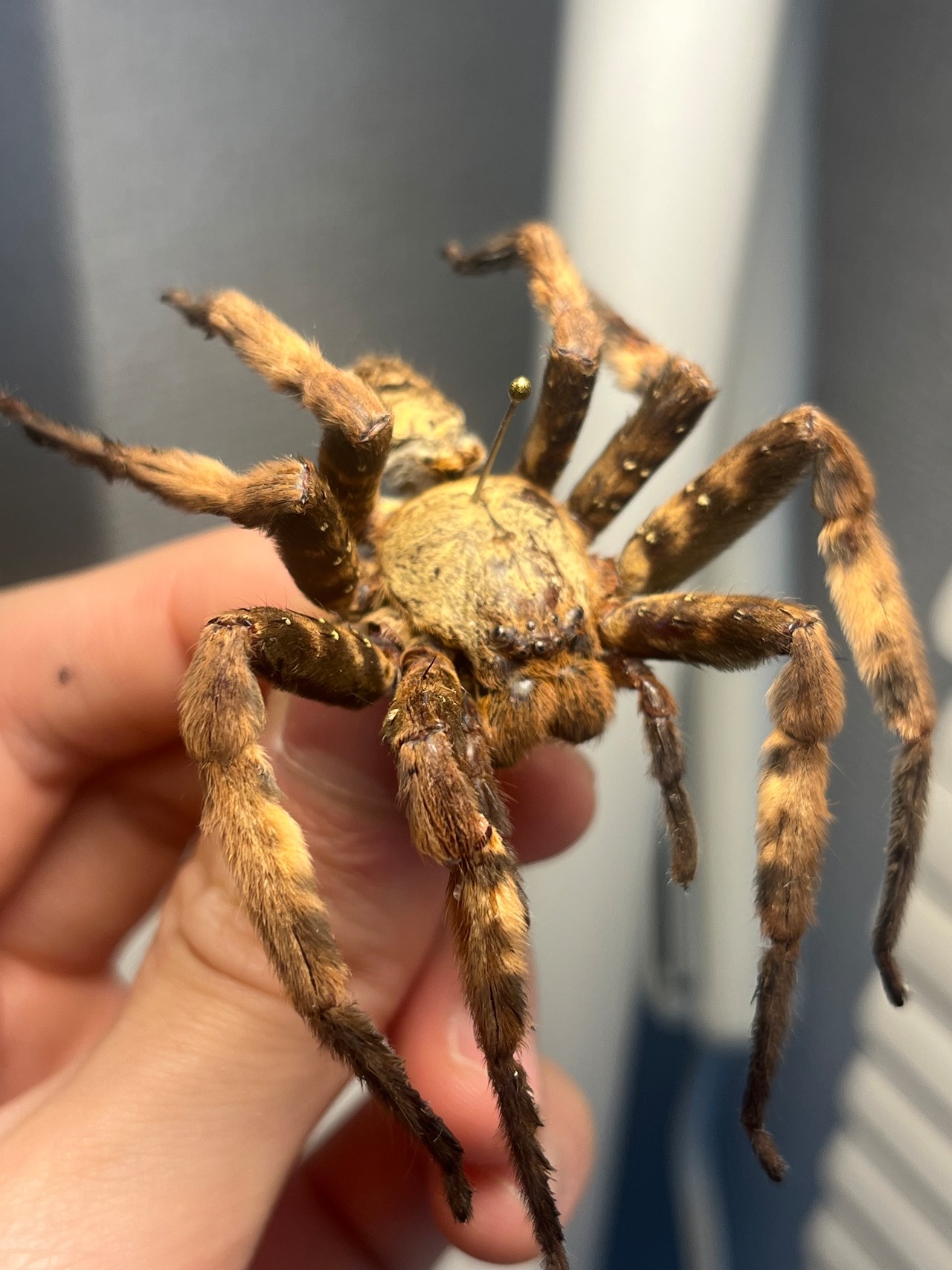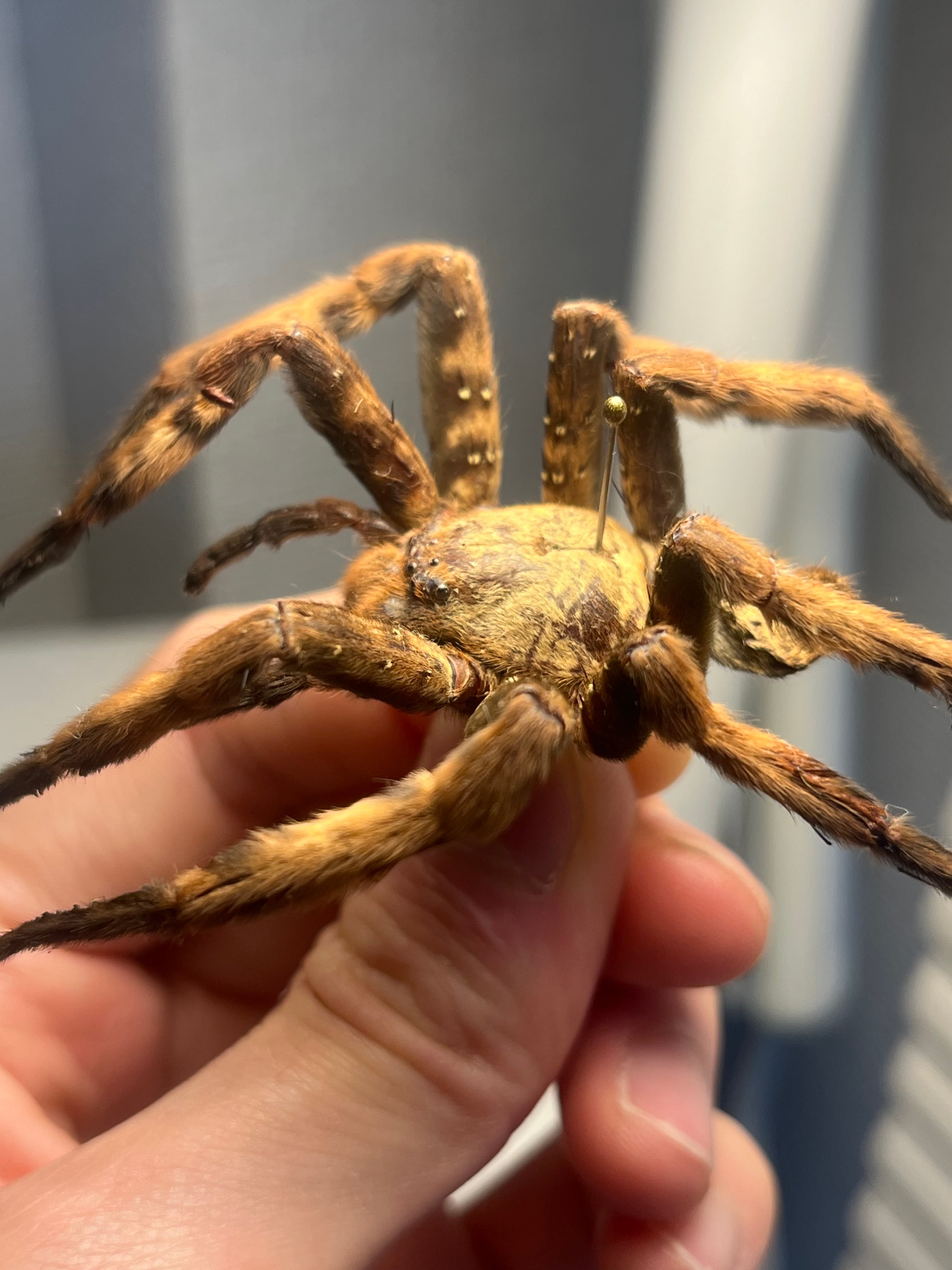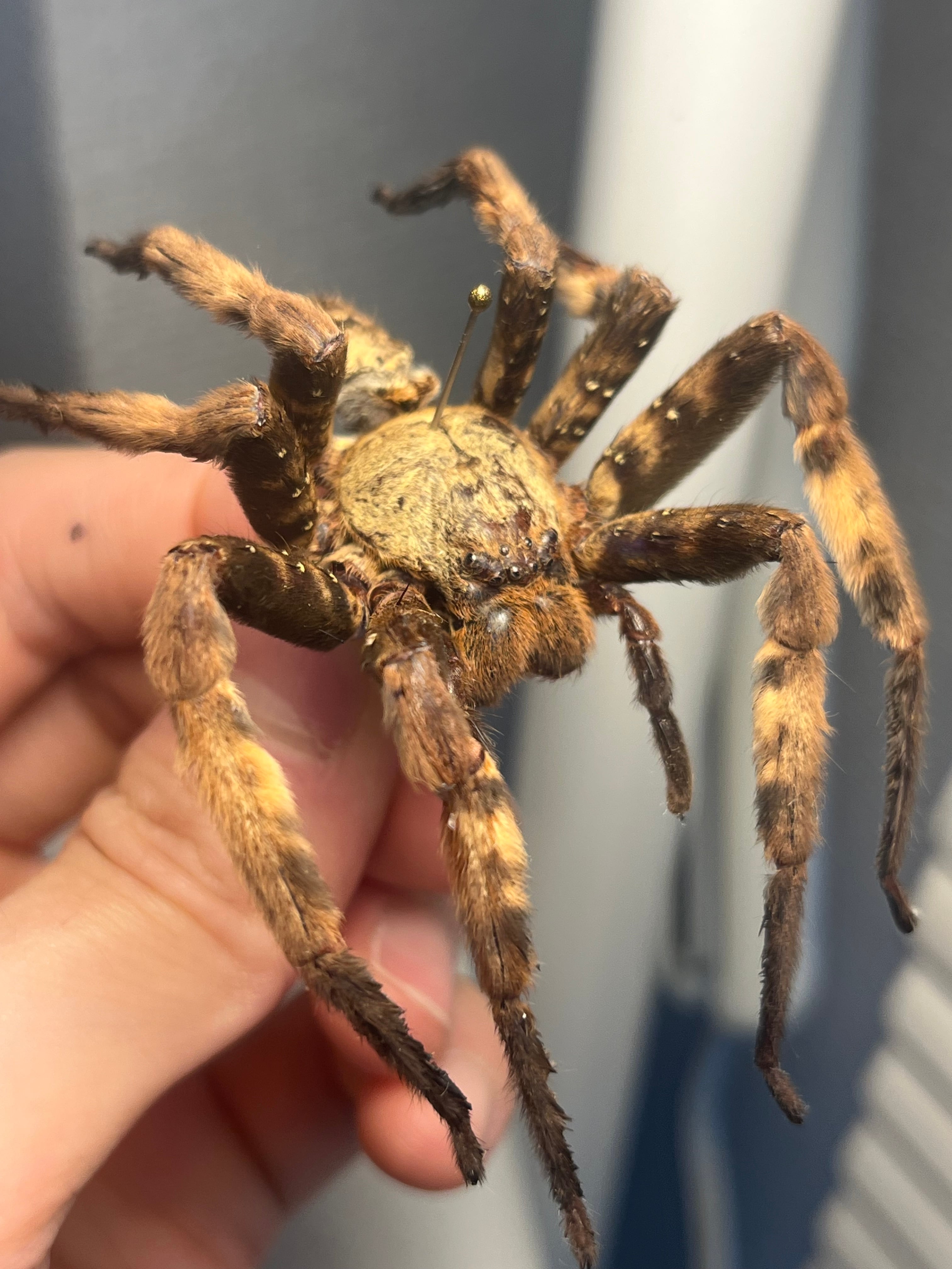 おそらくパープルハンツマンの標本です。ハンツマン、アシダガグモ系の中でもゴツい部類です。