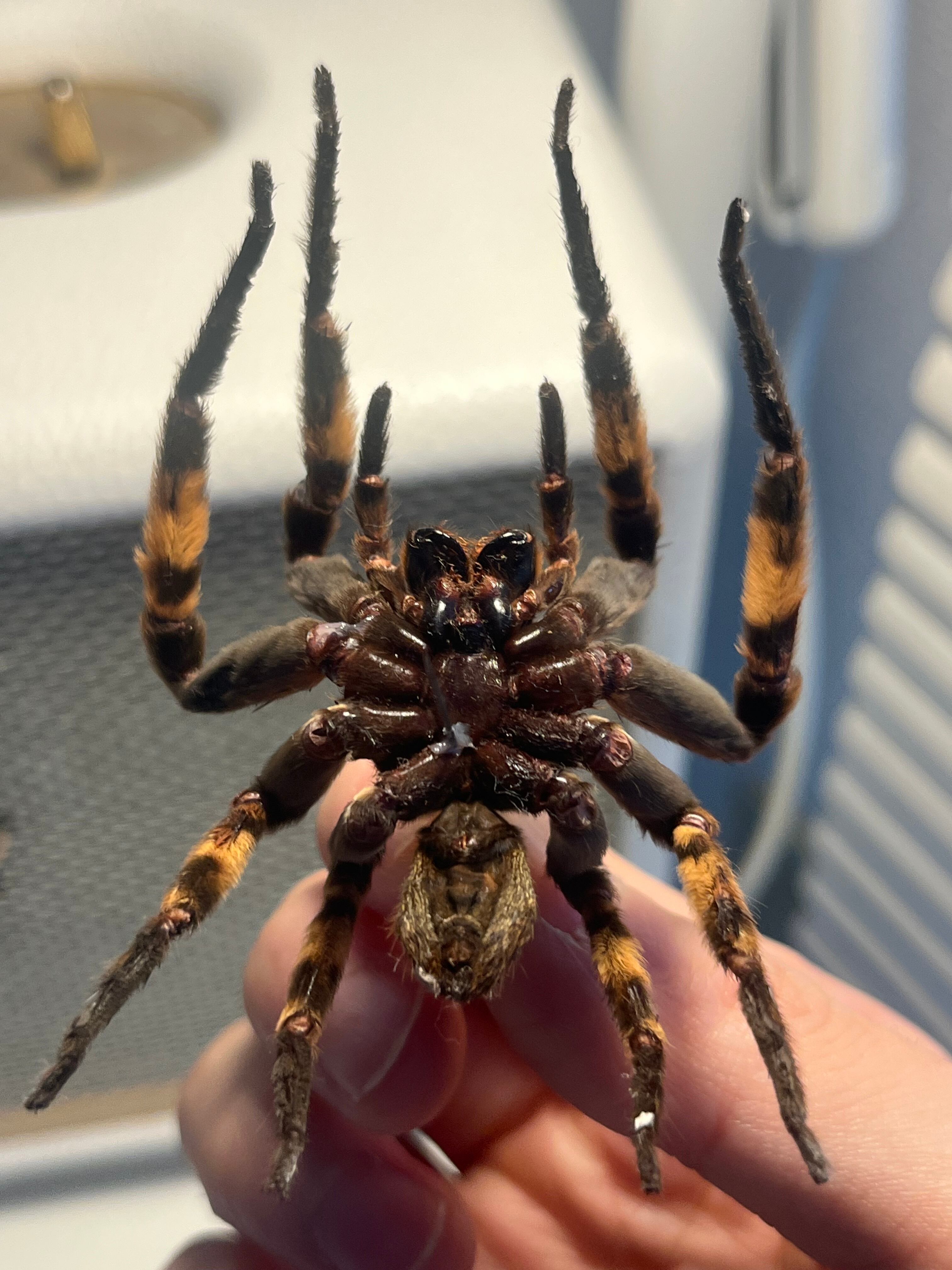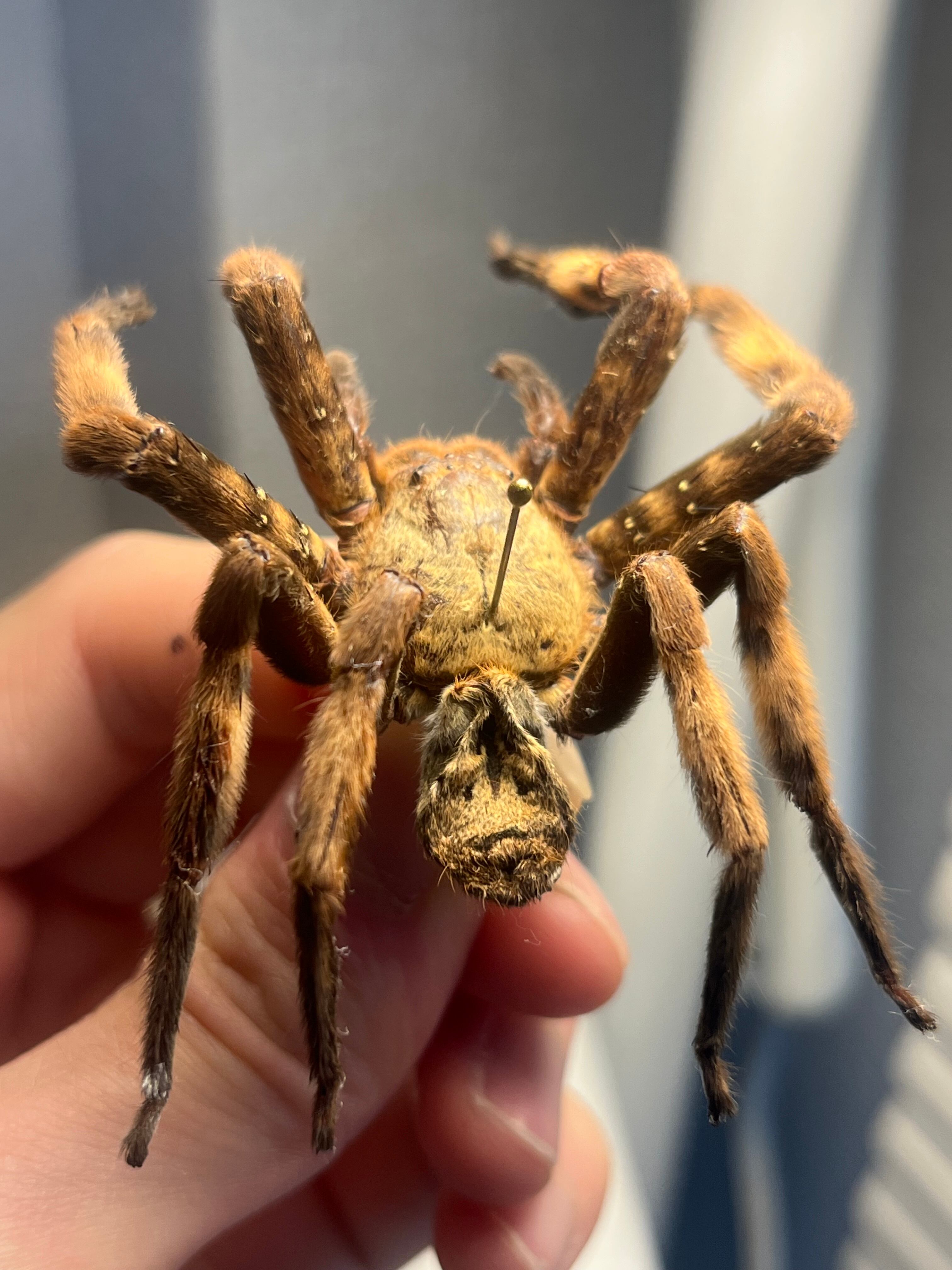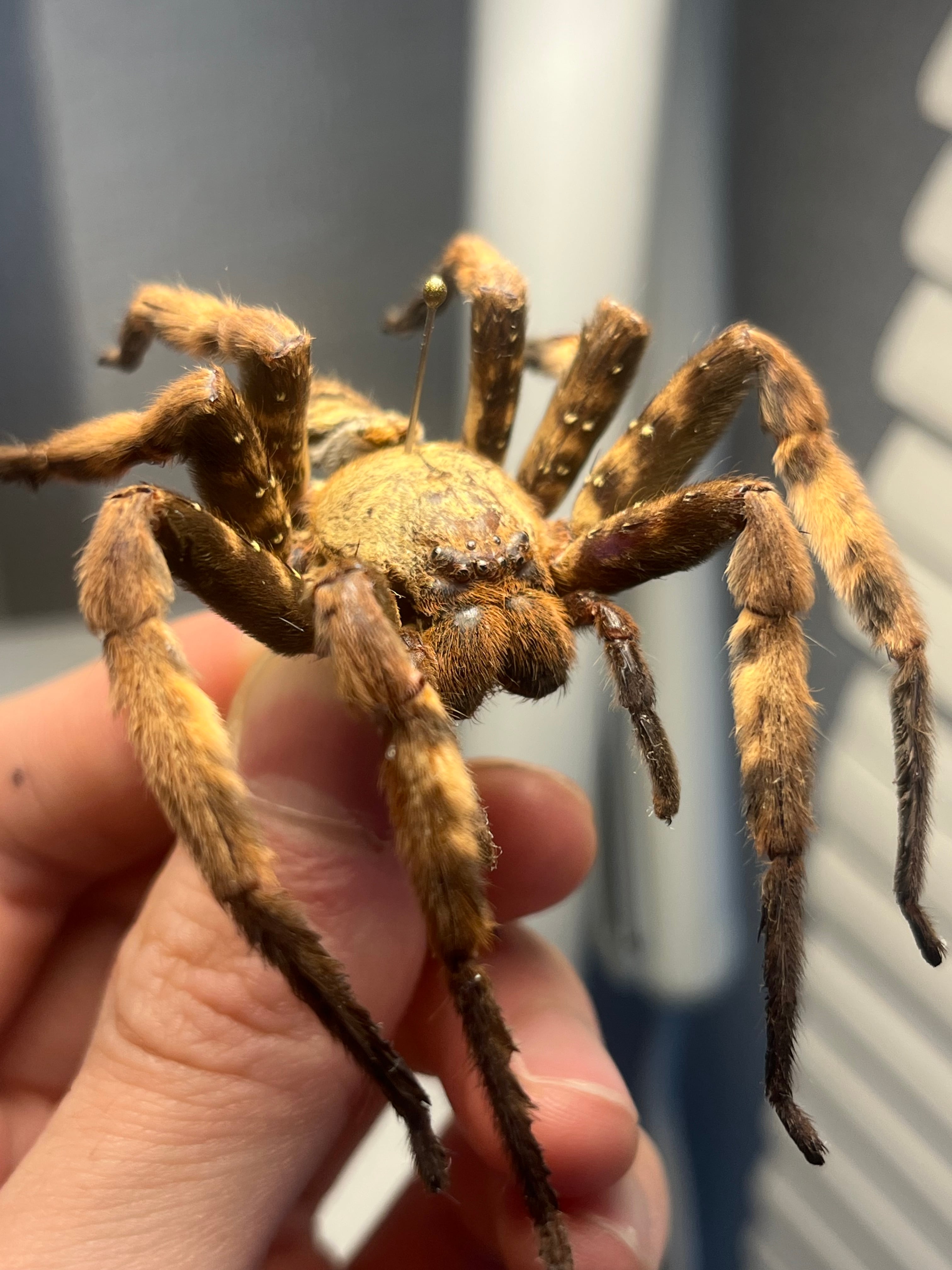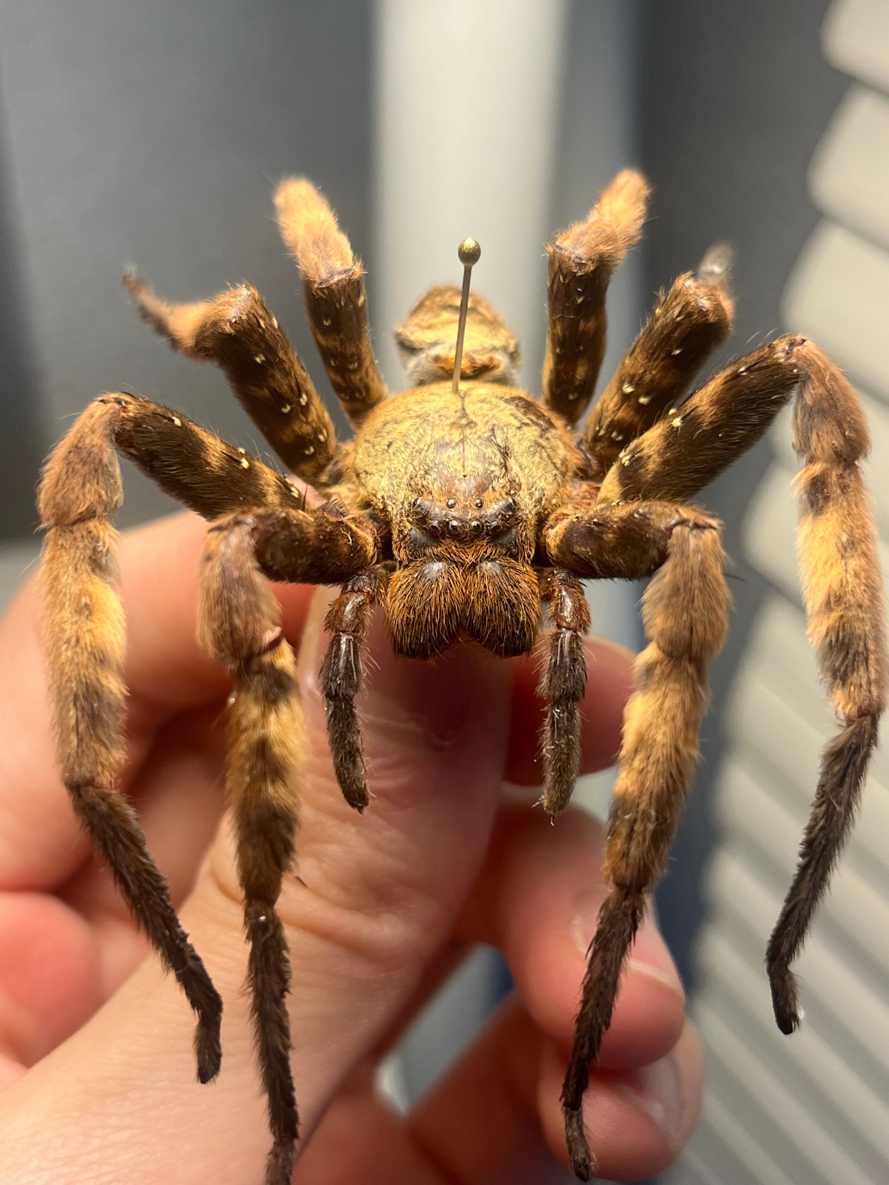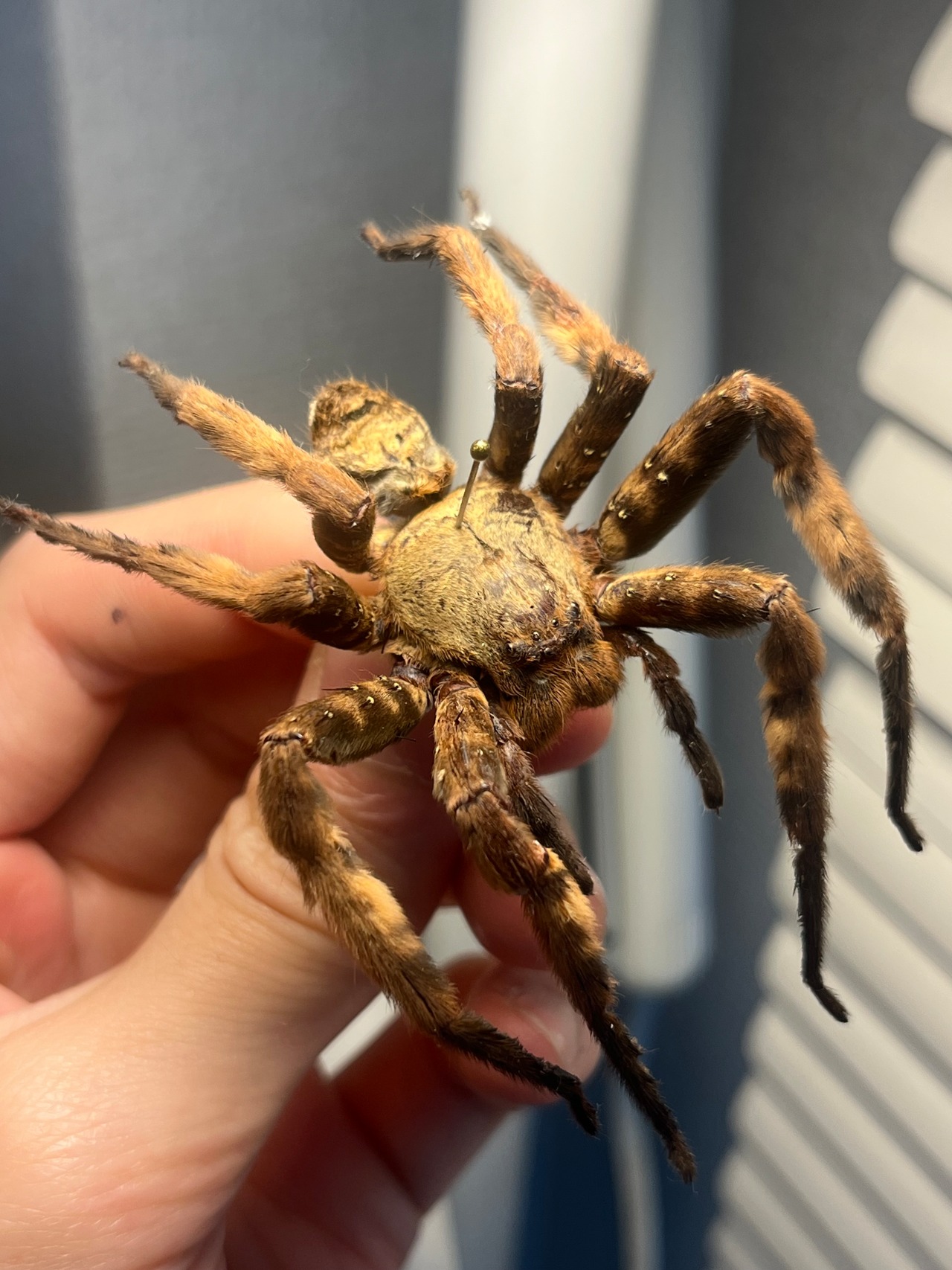 おそらくパープルハンツマンの標本です。ハンツマン、アシダガグモ系の中でもゴツい部類です。