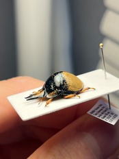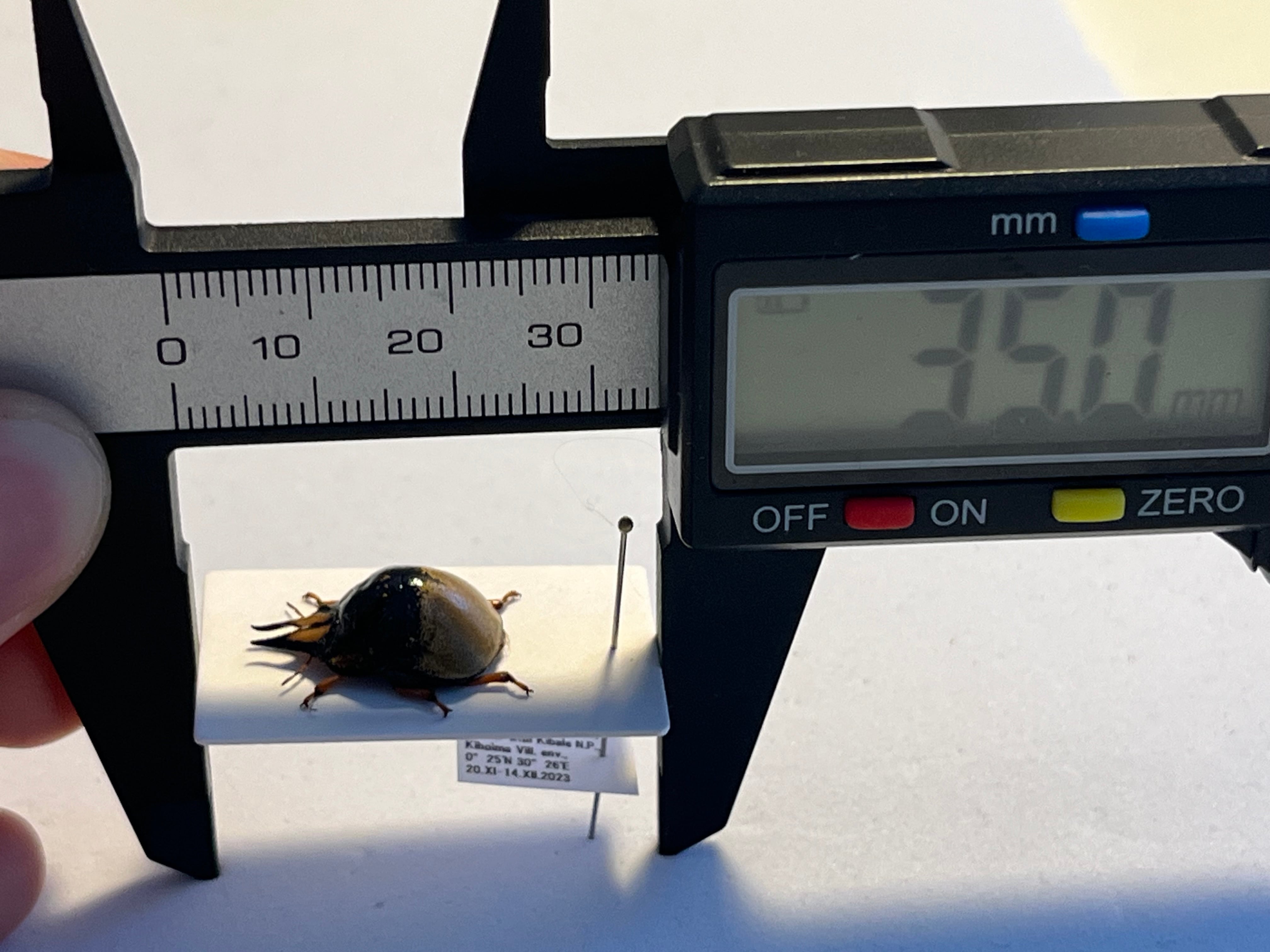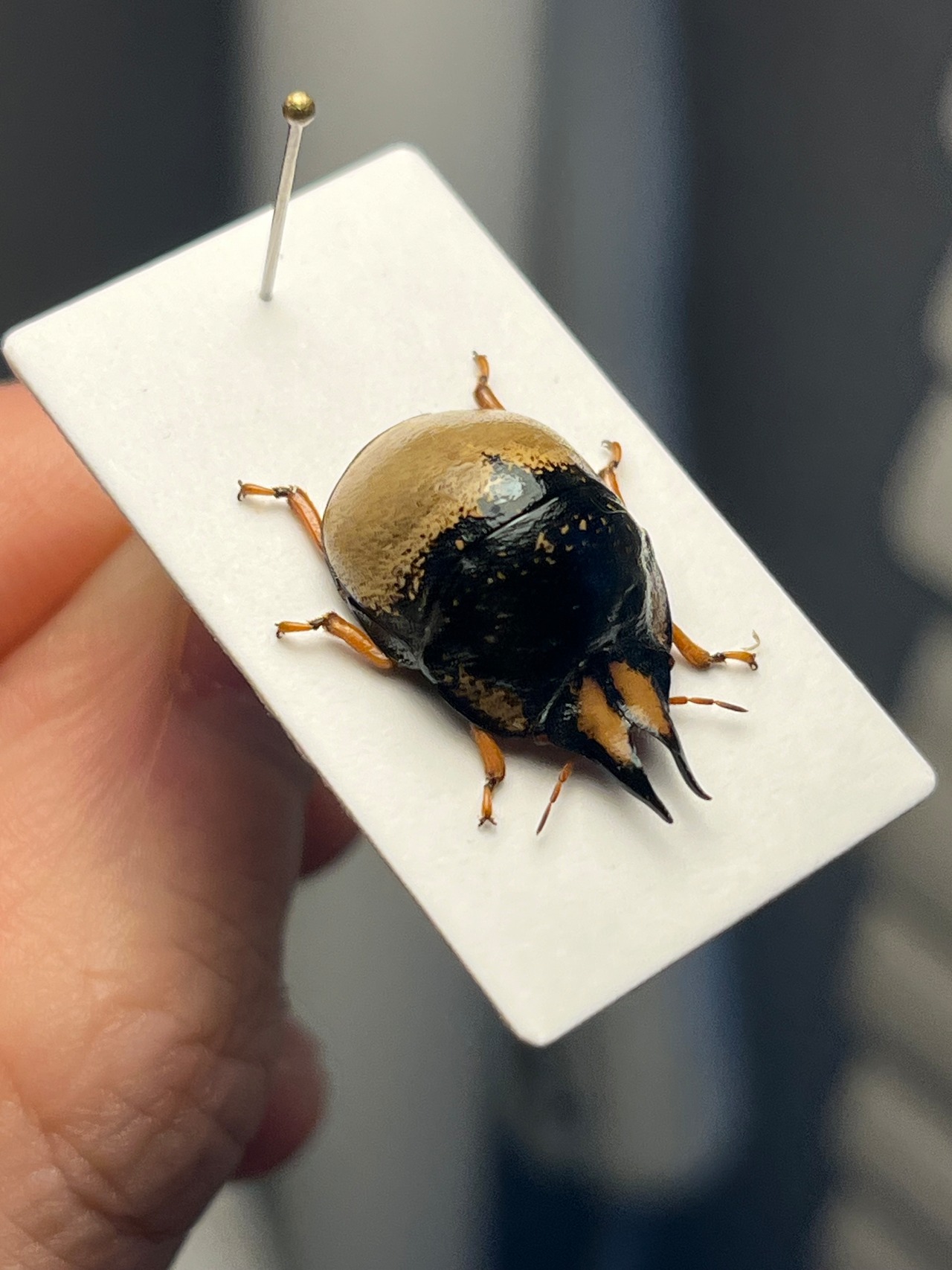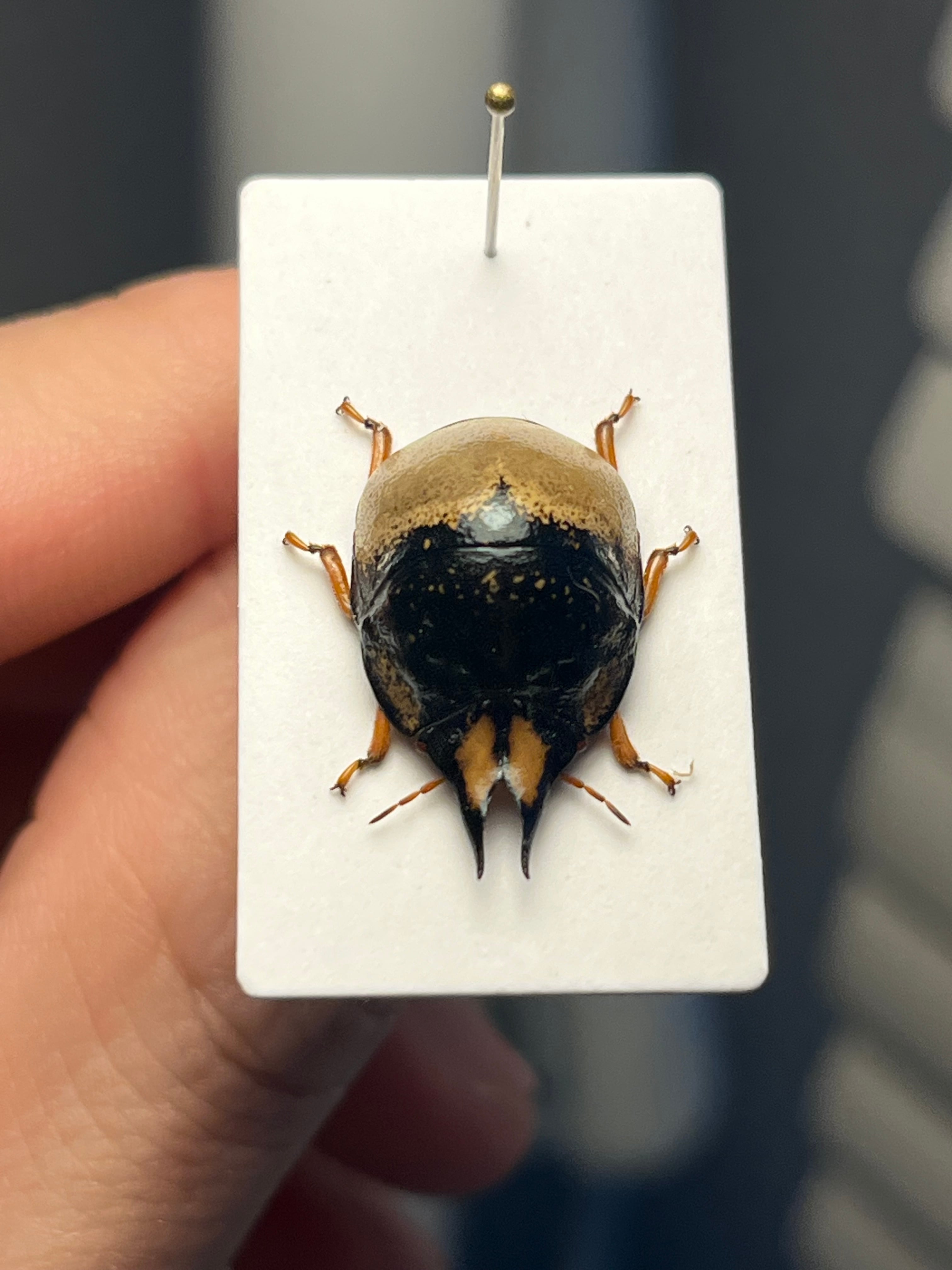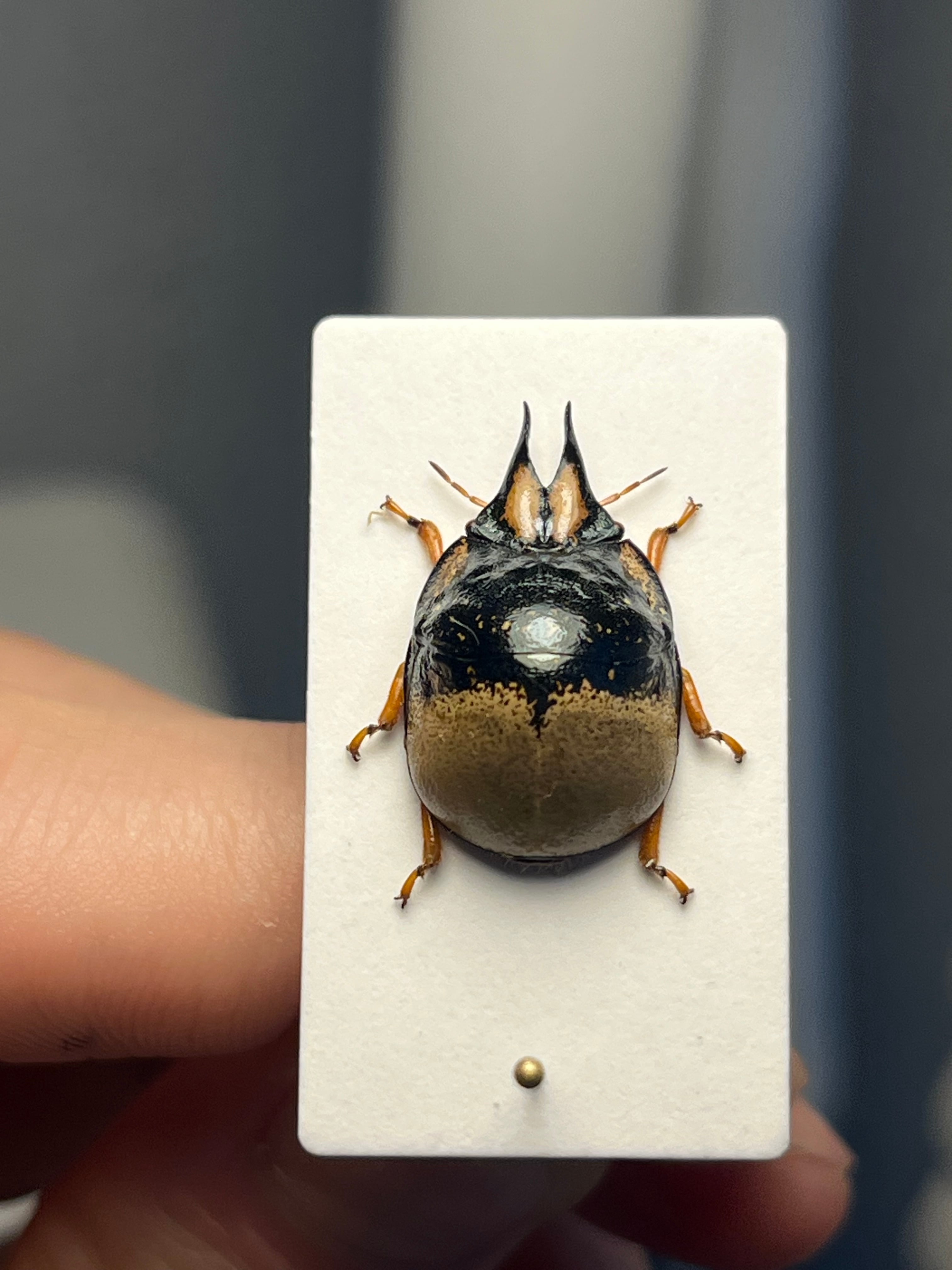 長大なツノをもつ異形カメムシ。丸っこくて厚みのある身体はカフスボタンのようです。