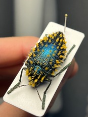 メタリックな青緑色の筒状の体の表面には、粗い点刻があり、頭でコーティングされた薄い黄色からオレンジ色の毛束が生えている。このタマムシは、南アフリカの温暖な乾燥地や半乾燥地ではおなじみの種だ。幼虫はさまざまな低木の茎や根の中に潜り込む。成虫の寿命は短く、気温の高い日中に活動し、水分を多く含む葉や花を食べる。