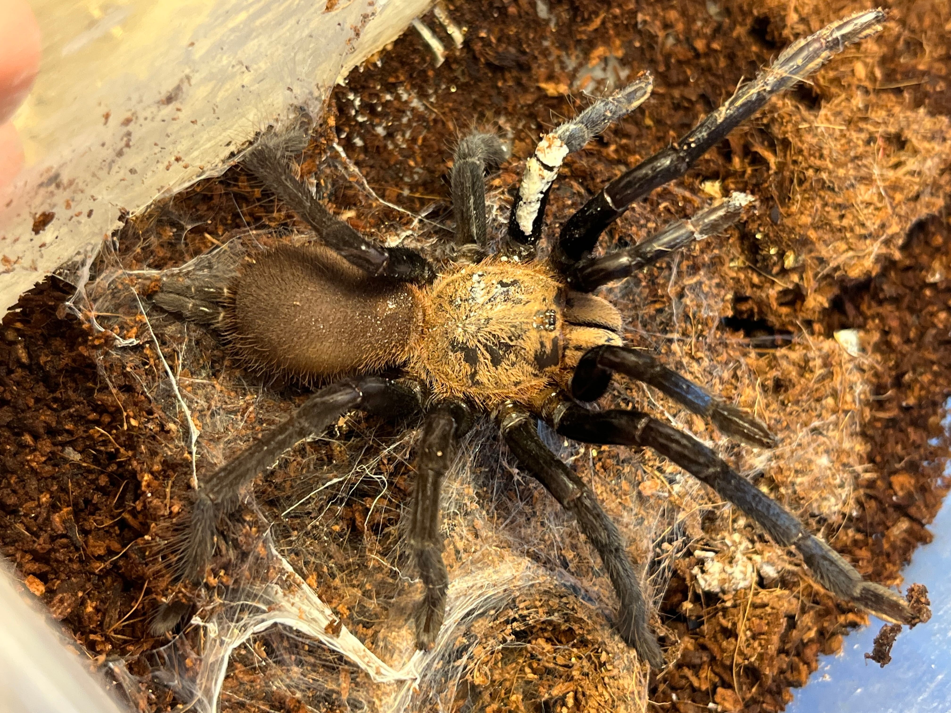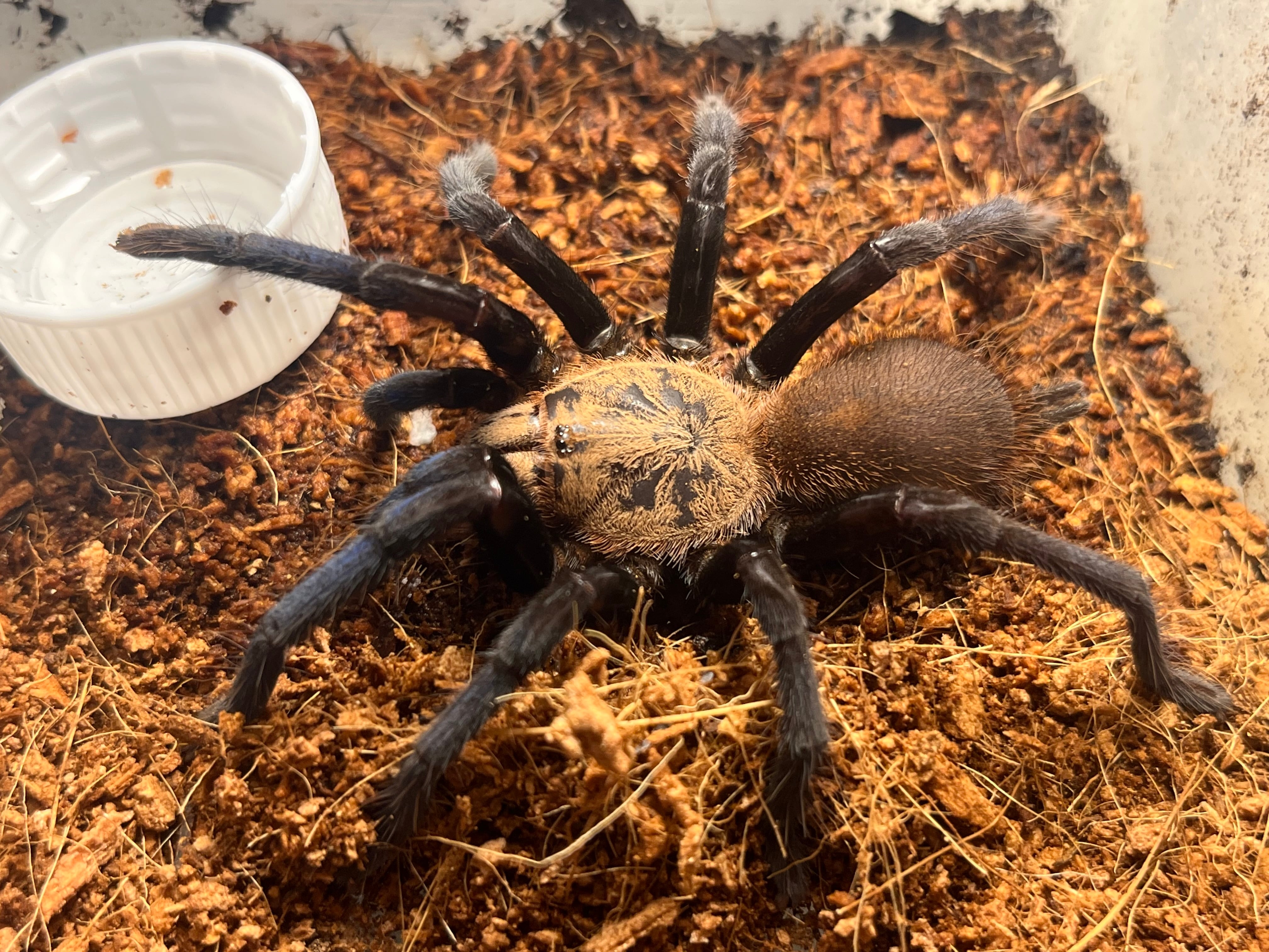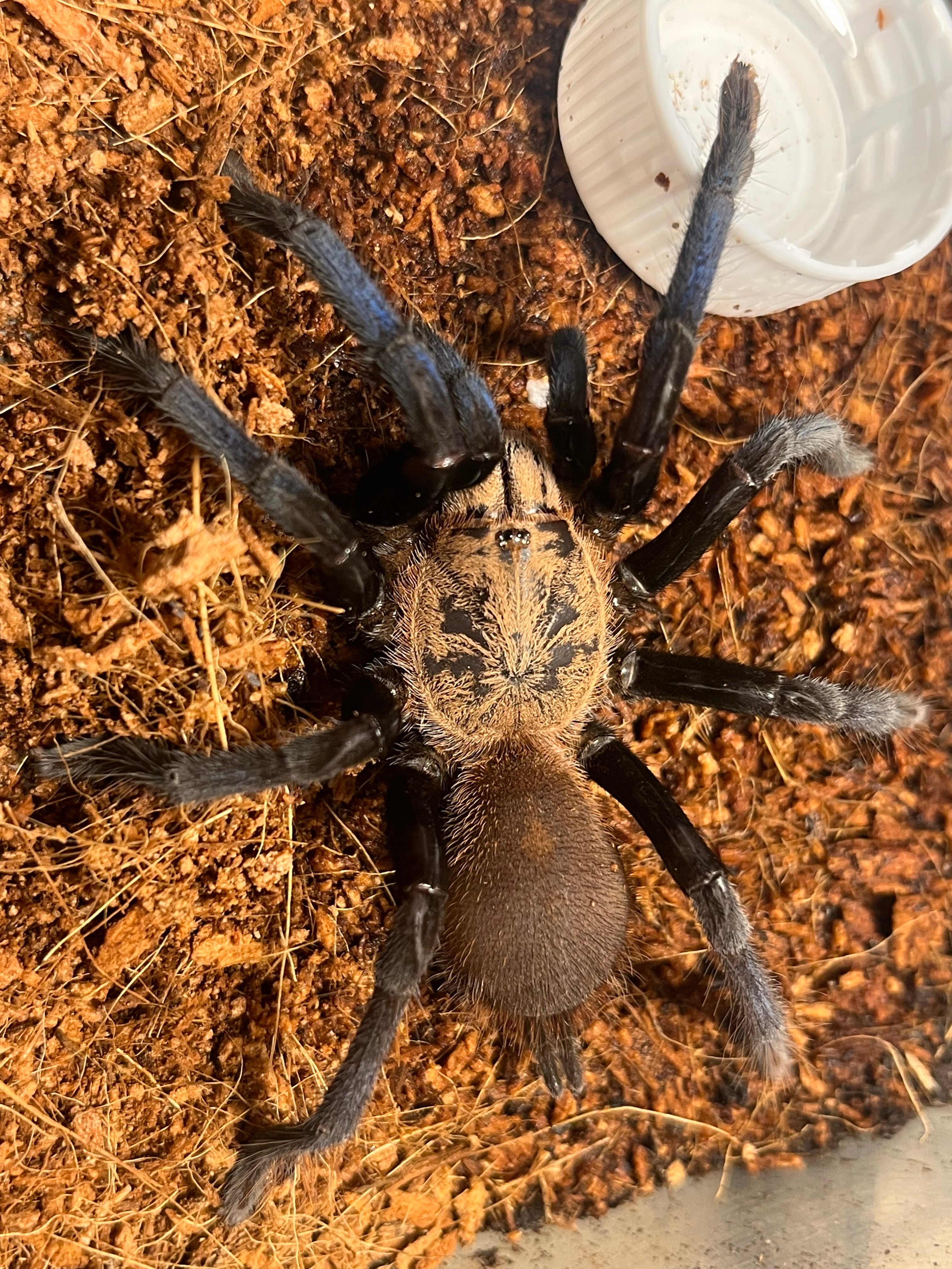 画像個体の生体を配送します。サブアダルトサイズなのでまだ脚の青さを楽しめると思います。一度ゴキブリほいほいに引っかかってしまい、足から液漏れしていましたが威嚇するくらいに調子を取り戻しています。