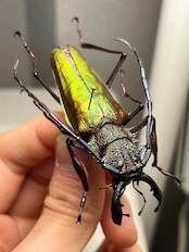 触覚が青、胸が緑、上羽が赤と黄色に輝く個体です。