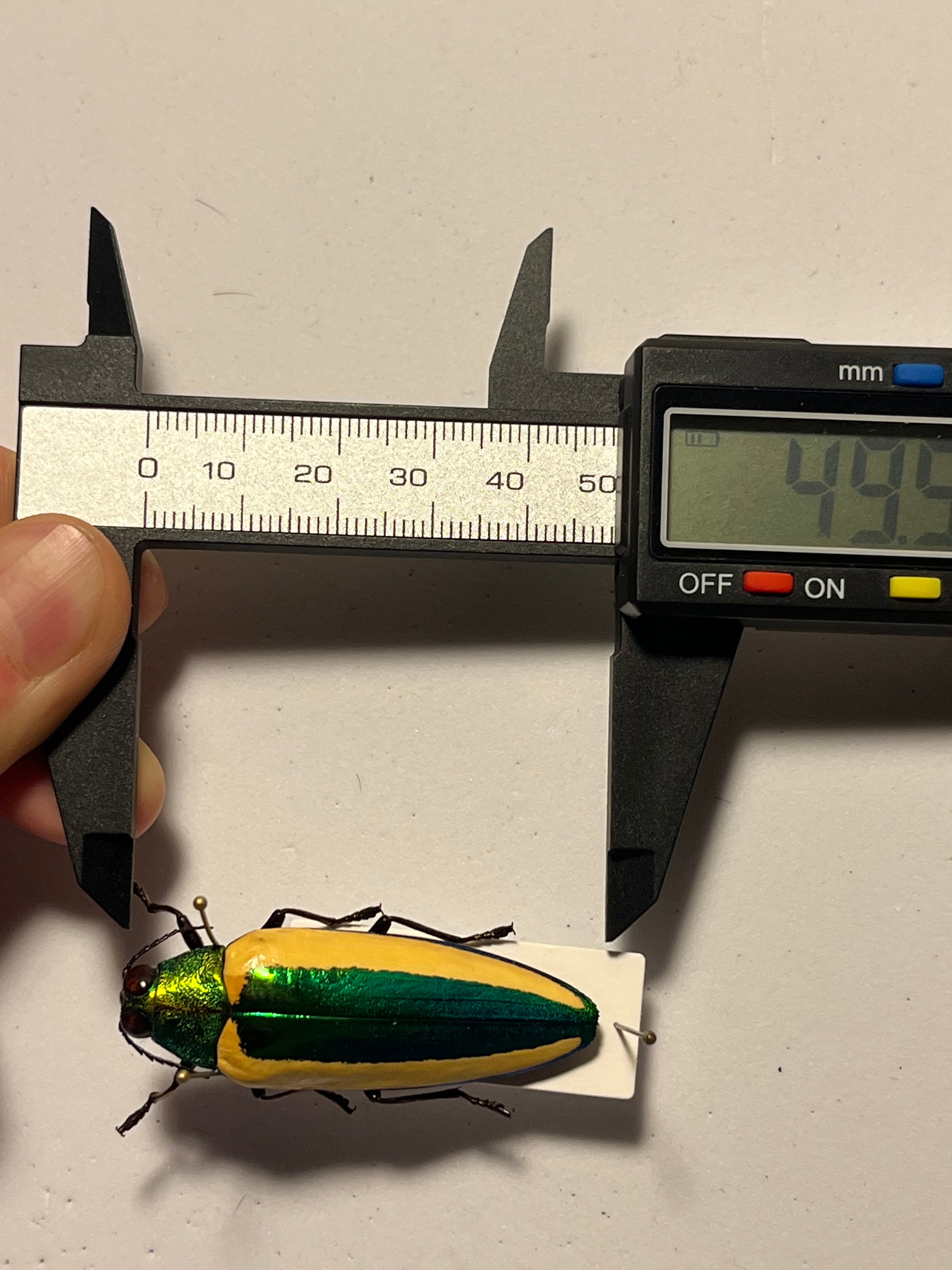 インドネシア 西スマトラ Tanjung Lolo Sijunjung産の画像標本を発送いたします。2024年8月に採取されております。私が計測したところ49mmでした。上羽が青光反射しているので綺麗な個体だと思います。