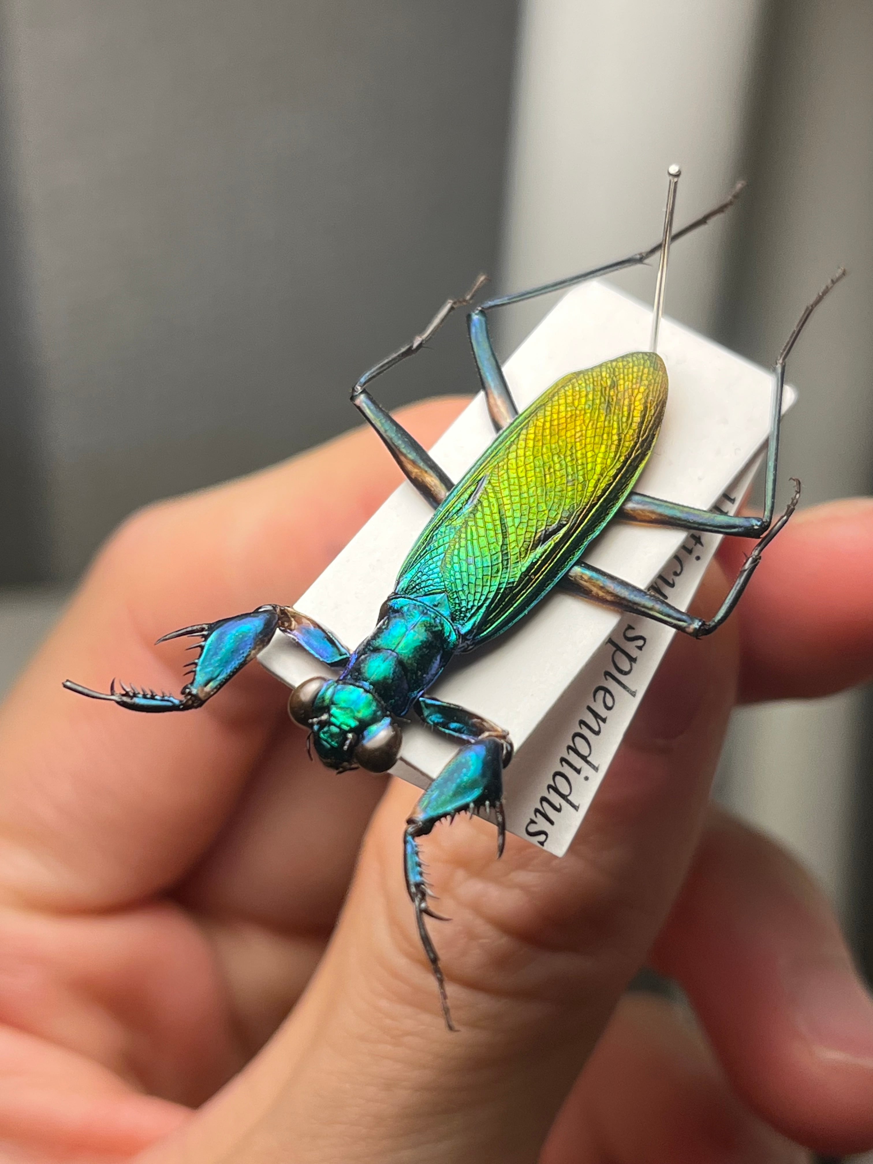 「ハンミョウカマキリ」とも呼ばれるようにハンミョウのような金属光沢の緑色の体色が特徴であり、世界一美しいカマキリといわれる。体の色はオスとメスでちがい、メスは緑の地色に赤が混じり、オスは全身が光沢のある青色をしている。幼虫も成虫のように光沢がある。