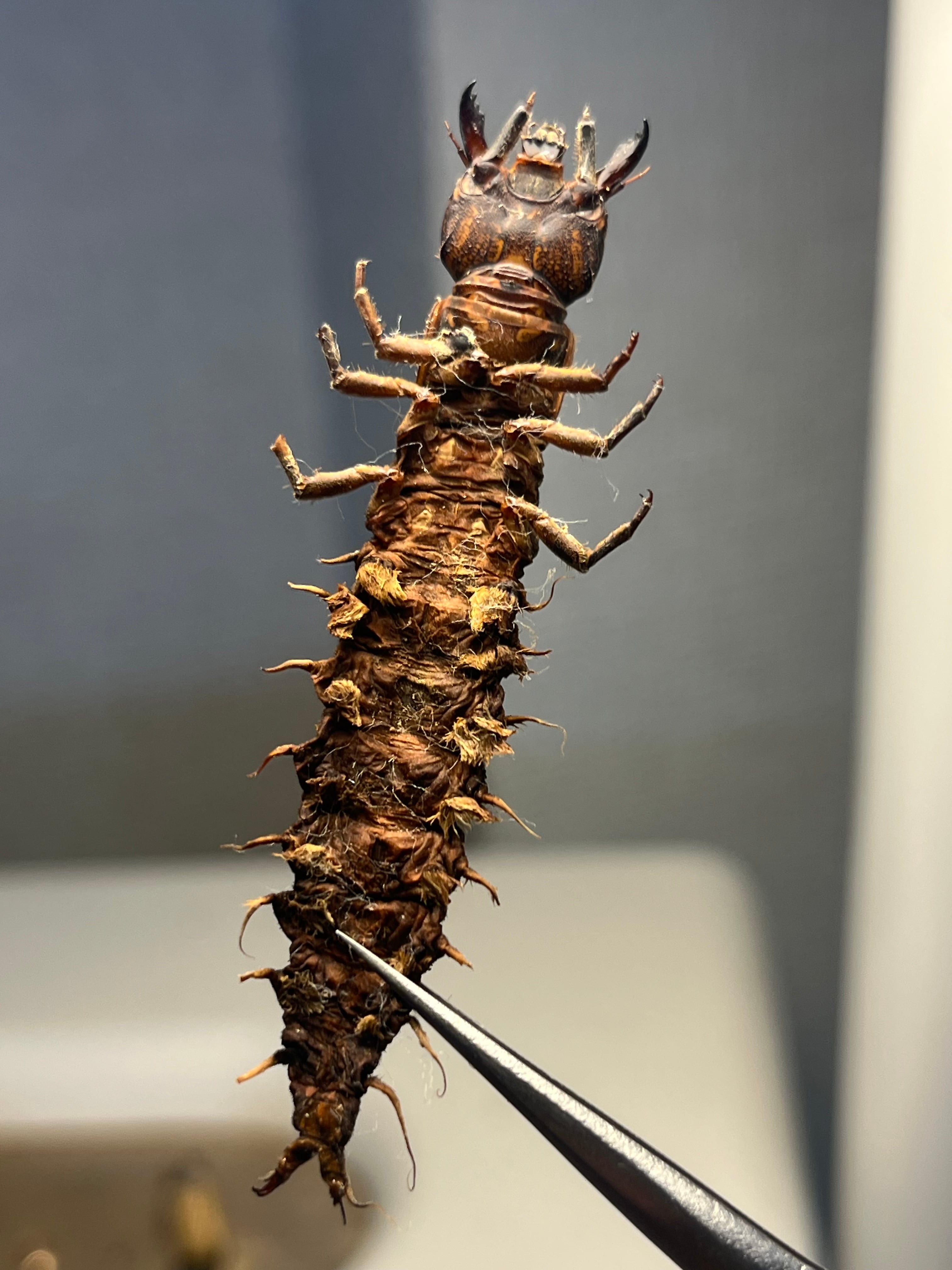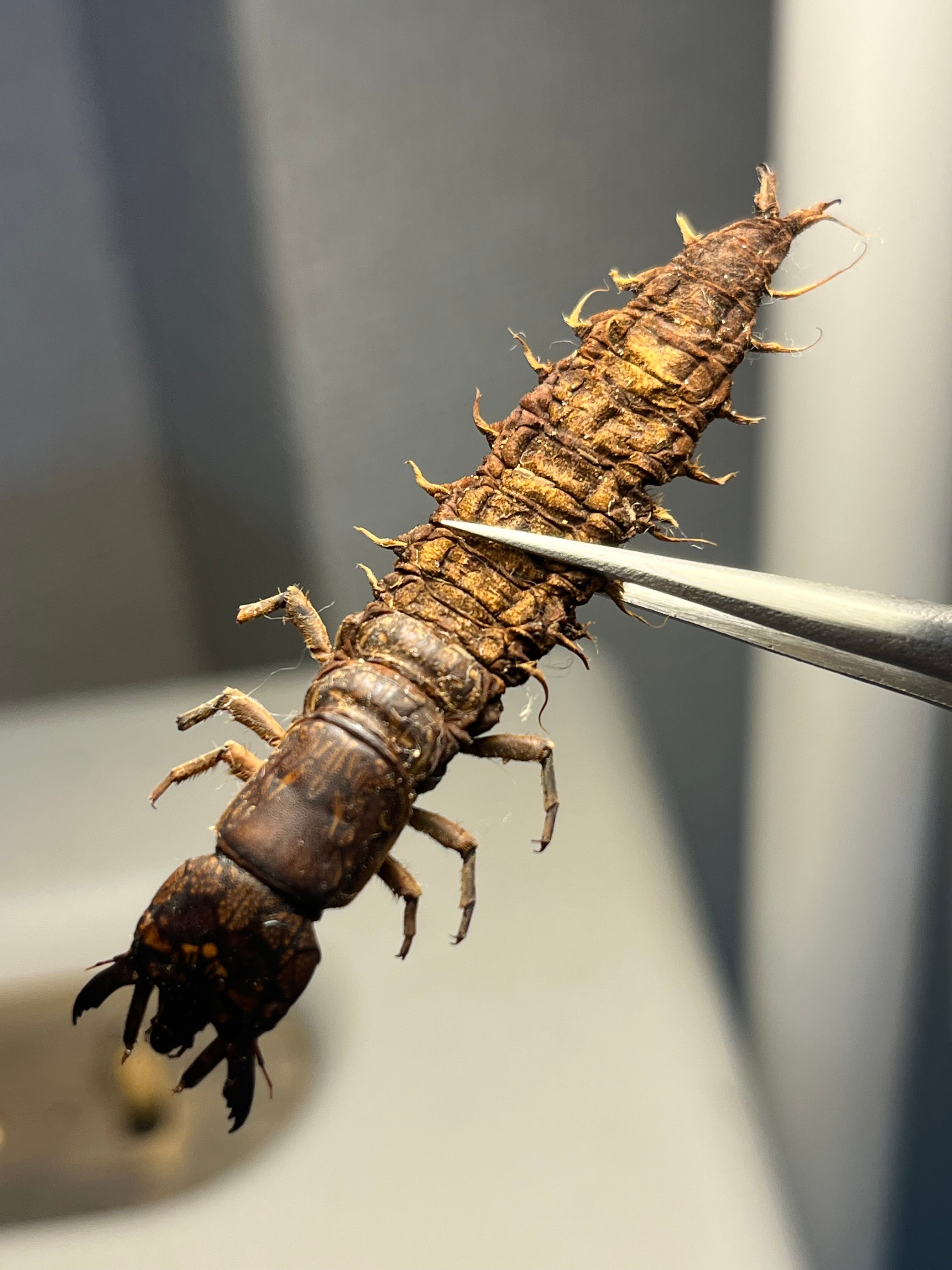 私が計測したところ頭胴長63mmでした。オオキバの幼虫はよくみますが、オオアゴヘビトンボの幼虫はレアかと思います。