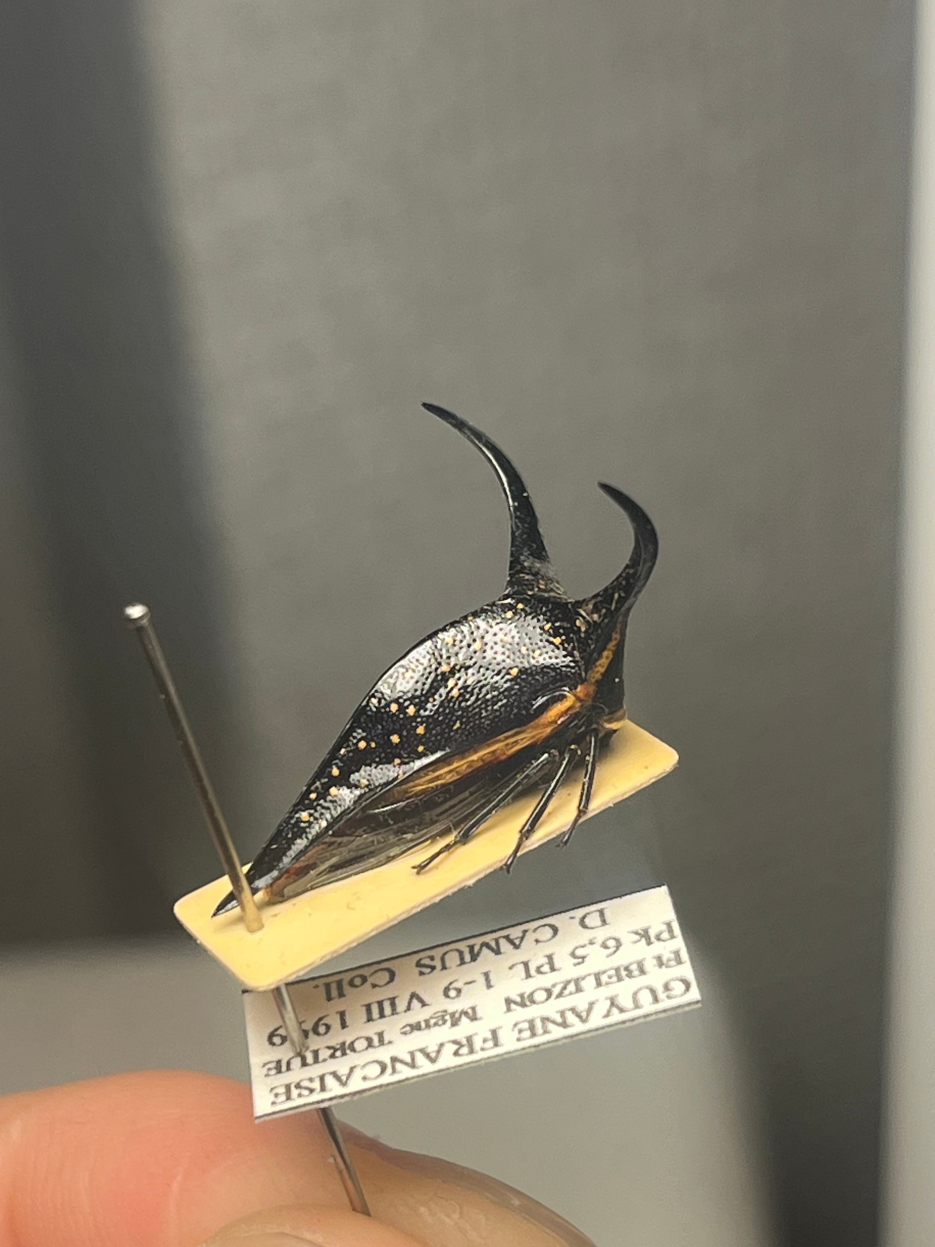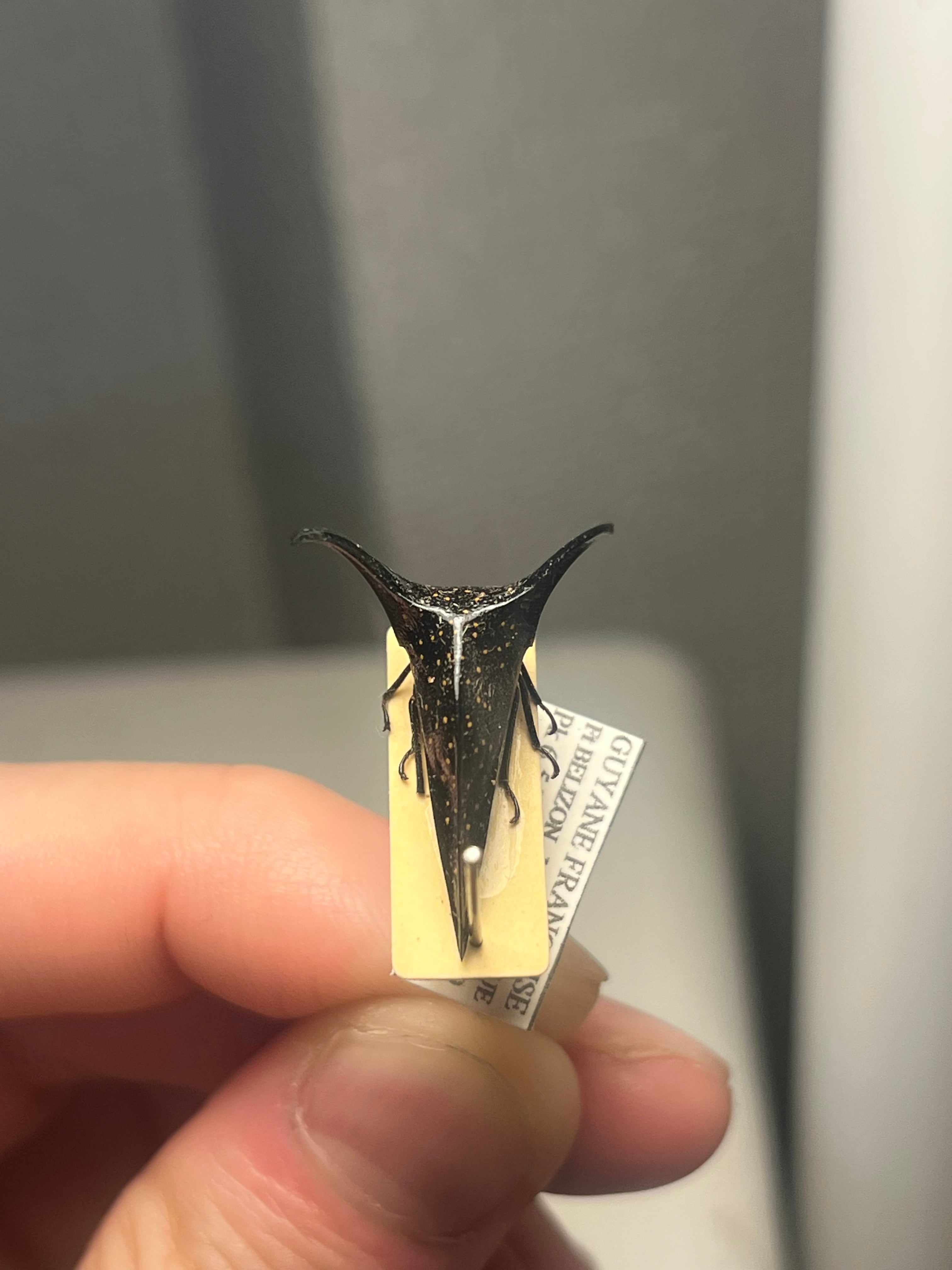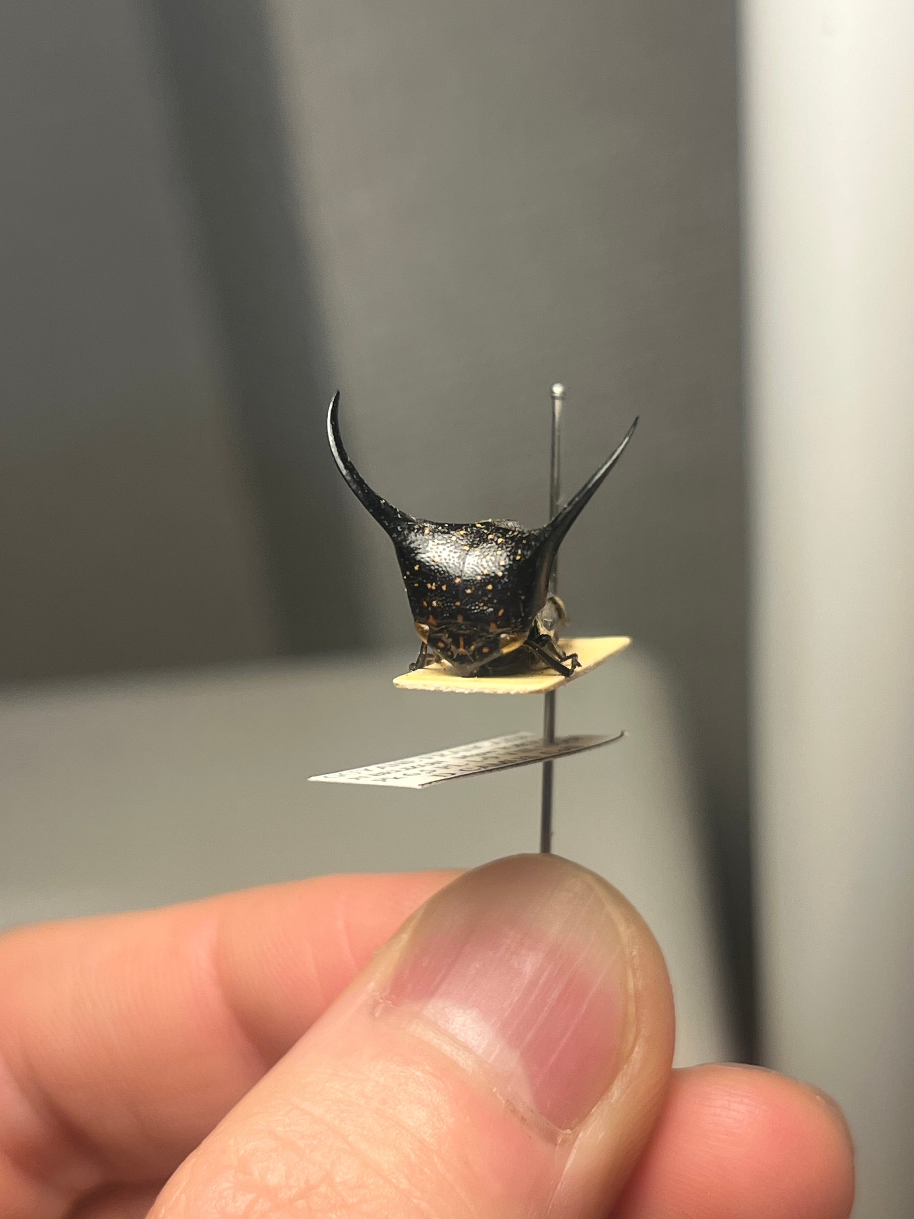 堅牢な体に、長く伸びた角が特徴的です。この角は天敵の鳥が飲み込みにくいように進化したのではないかと思います。